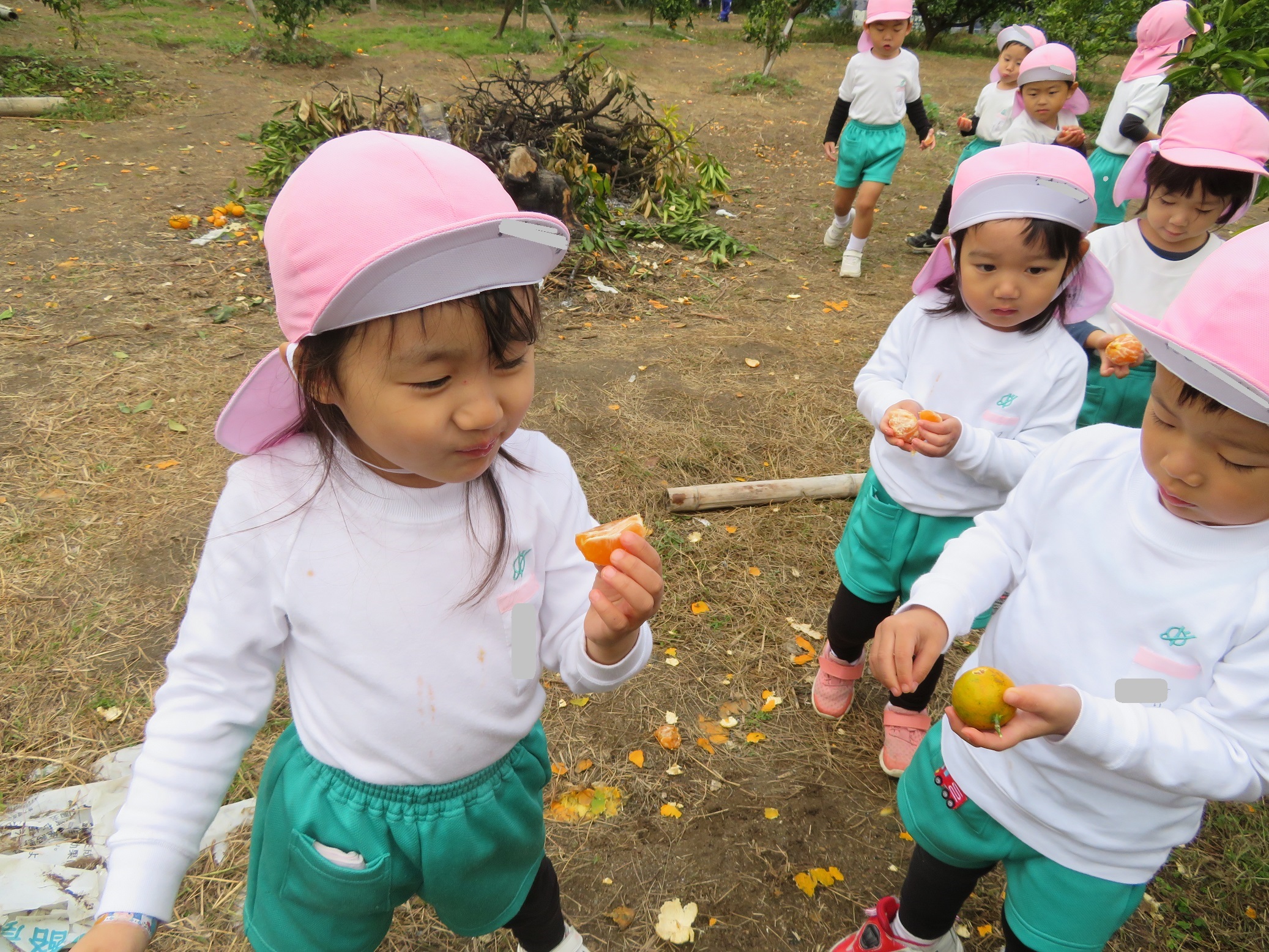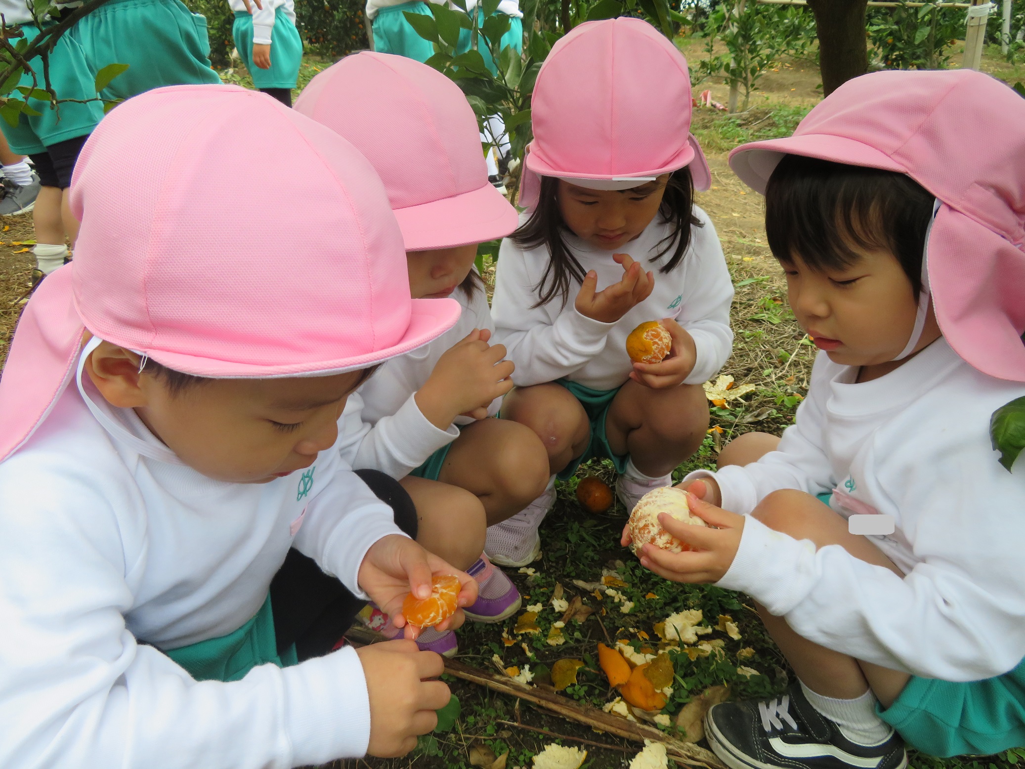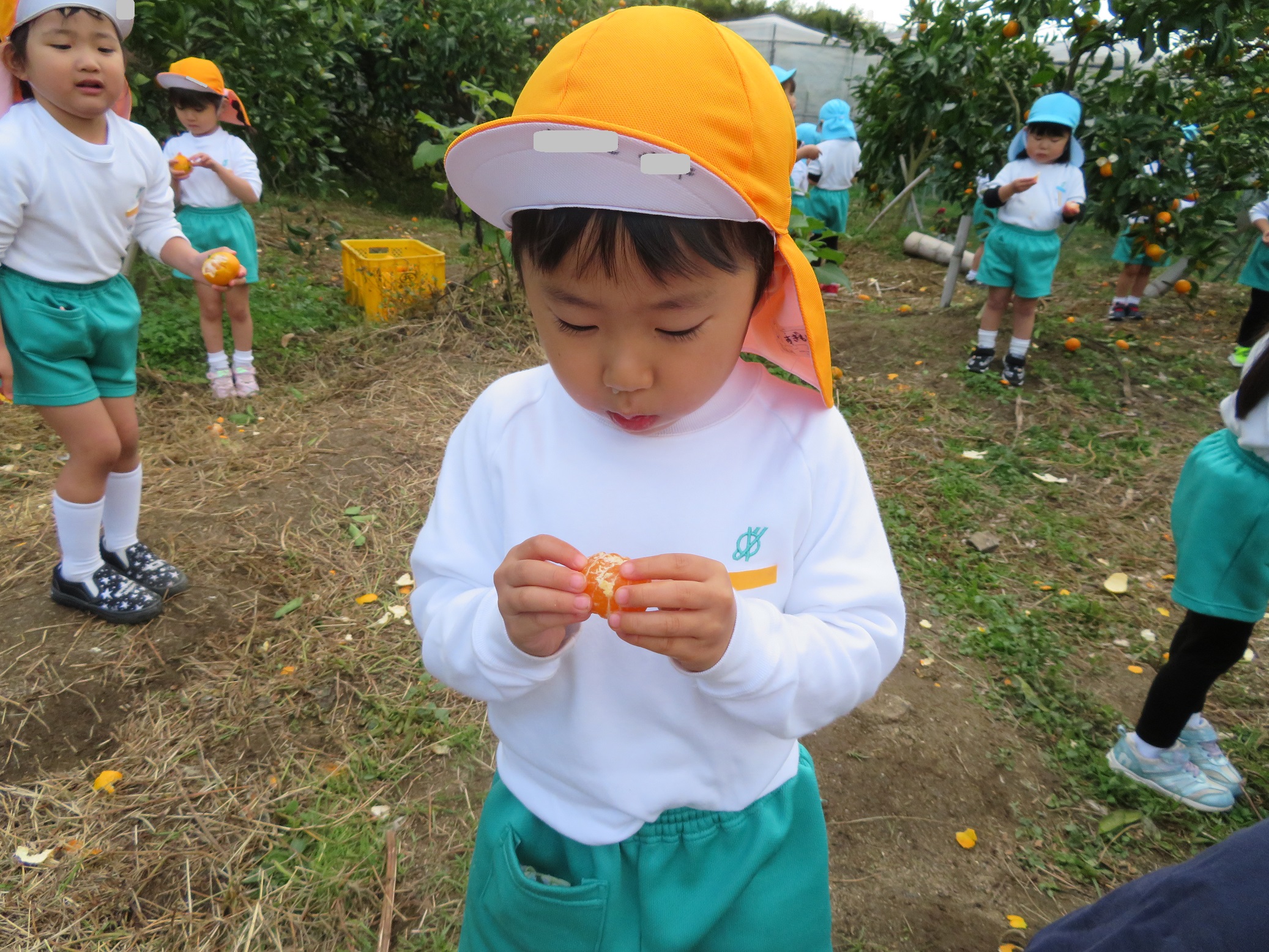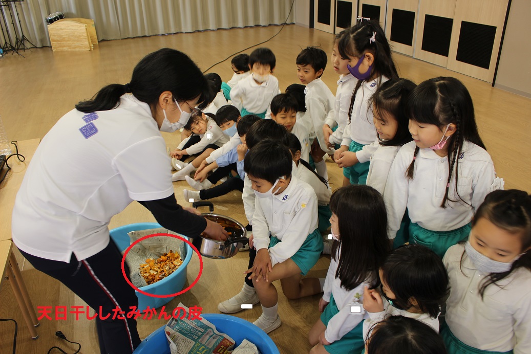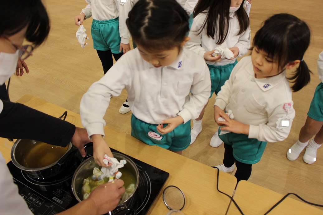 11月30日 ゆり組は、みかん狩り遠足で集めたみかんの皮を使って、草木染め遊びをしました!