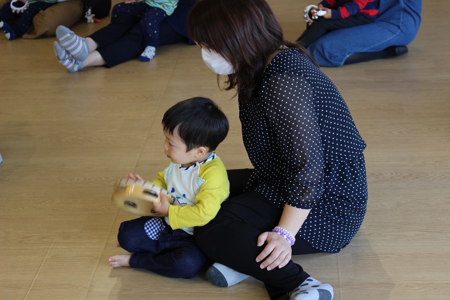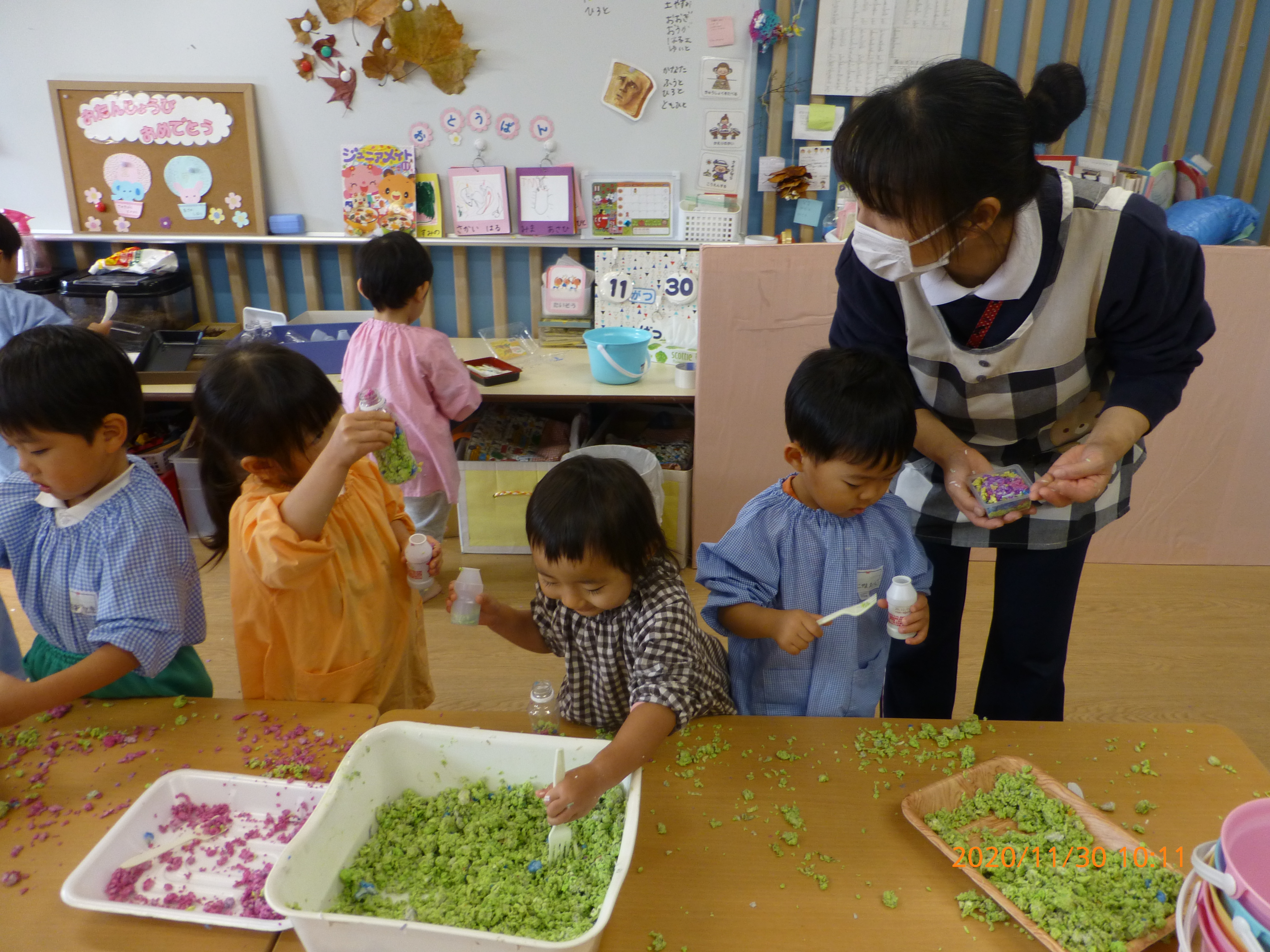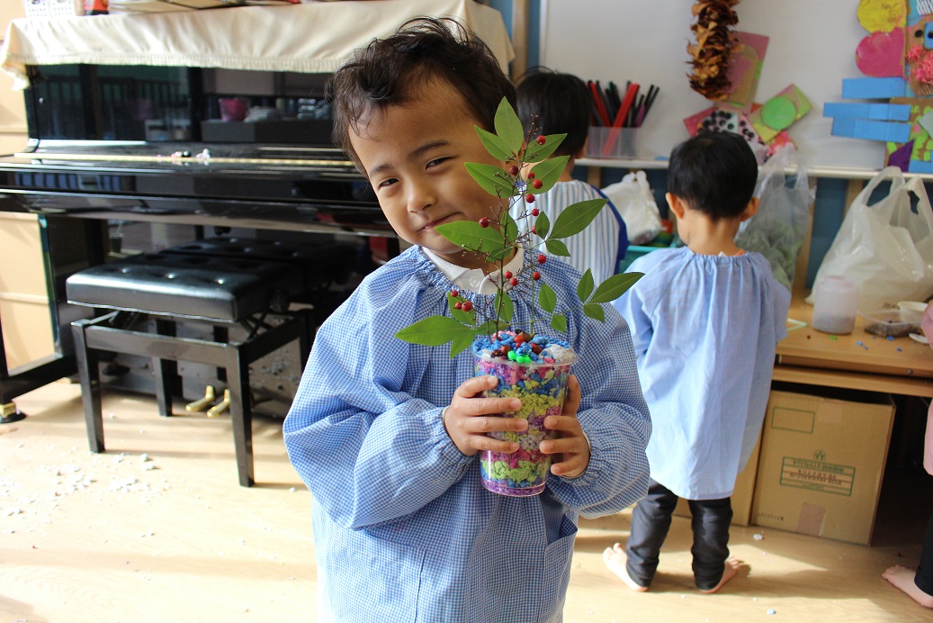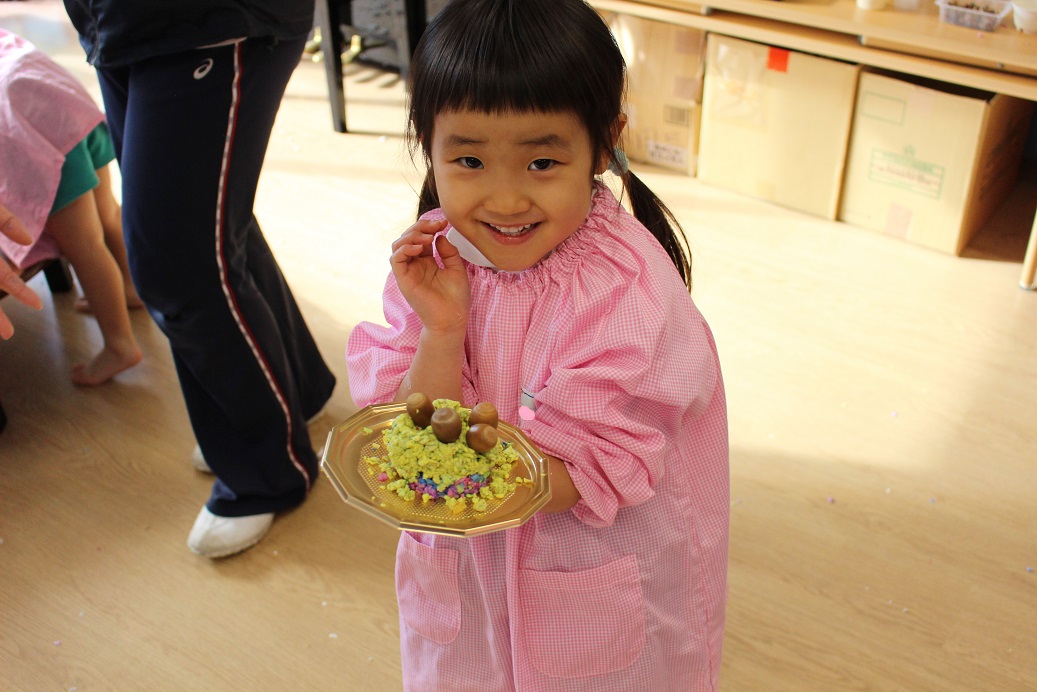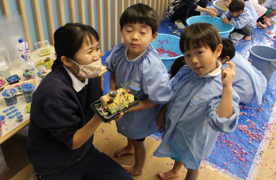 紙粘土をギューっと握って、お団子にしたり、プラスチック容器に入れて木やどんぐりを飾ってケーキにしてみたりして、いろいろな感触を楽しんでいました。