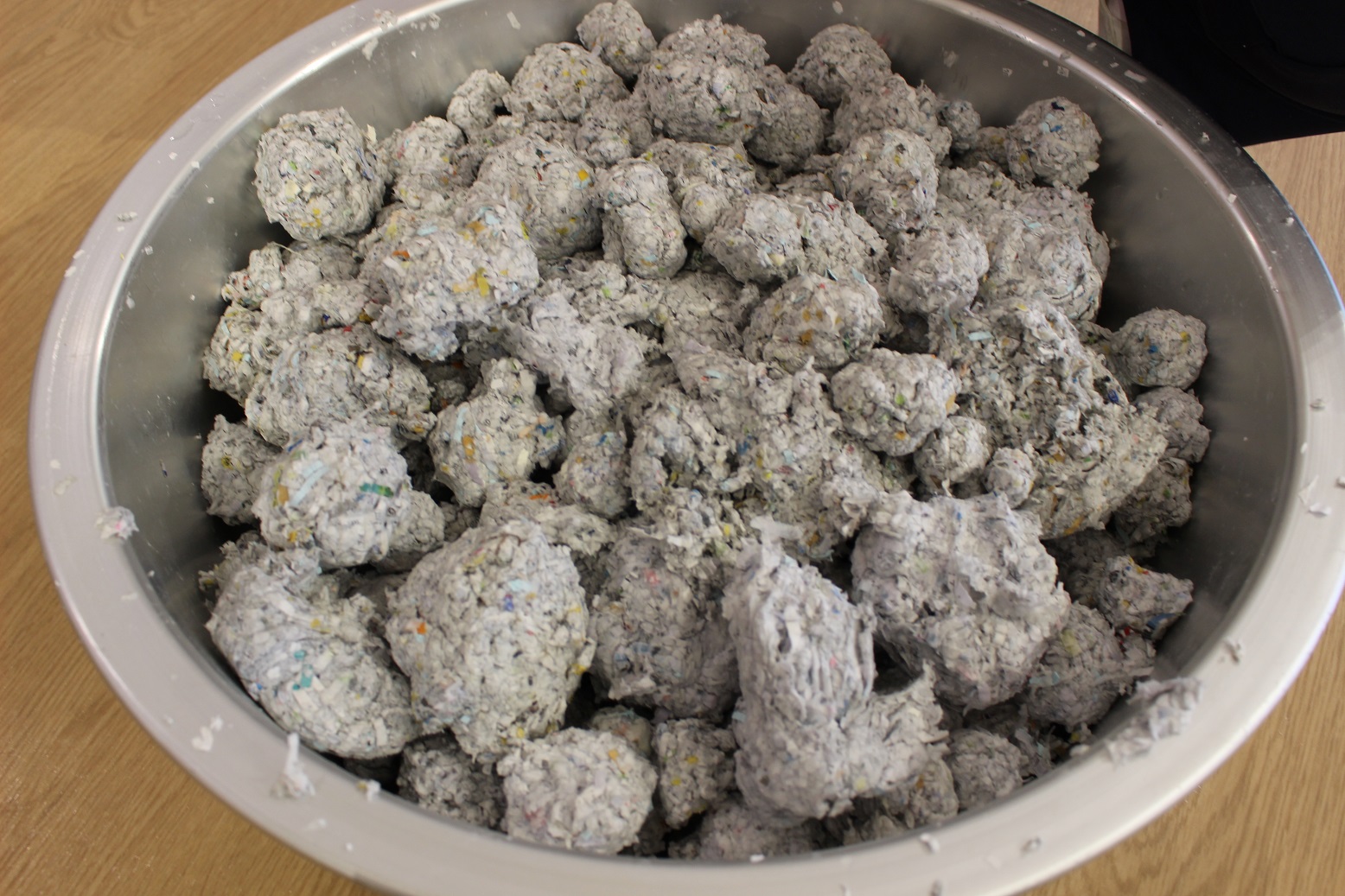 シュレッダーをして粉々になった紙を水にひたして、絵の具で色をつけて、洗濯のりを入れた
