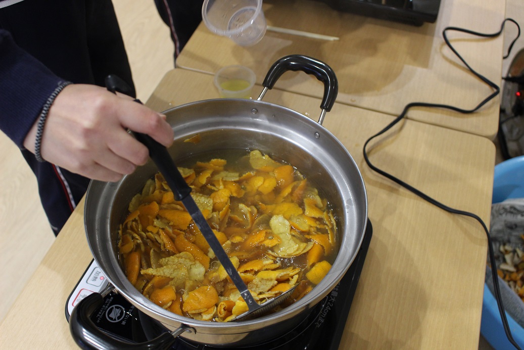 みかんの皮は、天日干しして30分程茹でて、みかんの皮の色を煮出します。