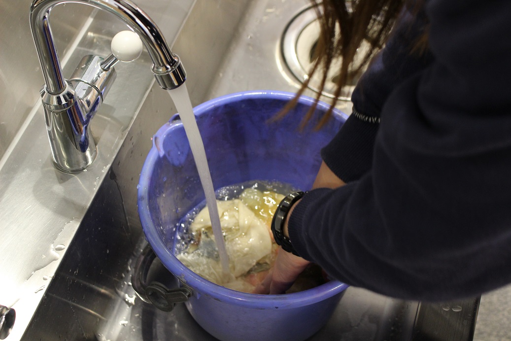 1時間ほど茹でた布は、水で洗って、ミョウバンを入れた水にひたします。