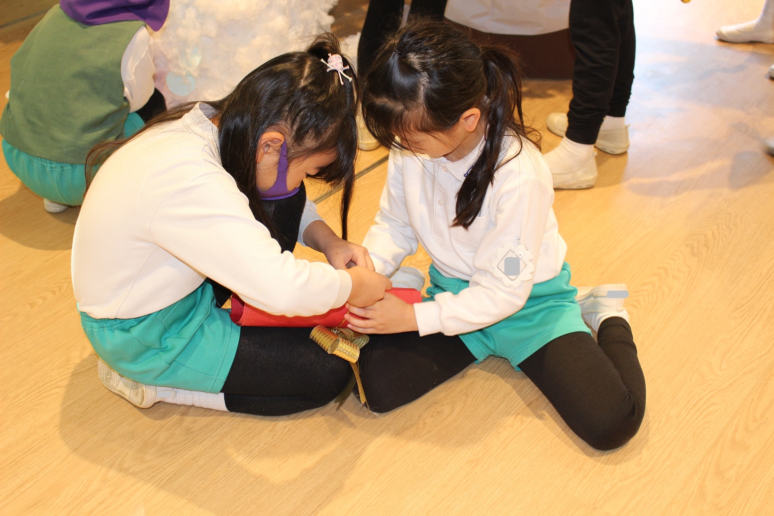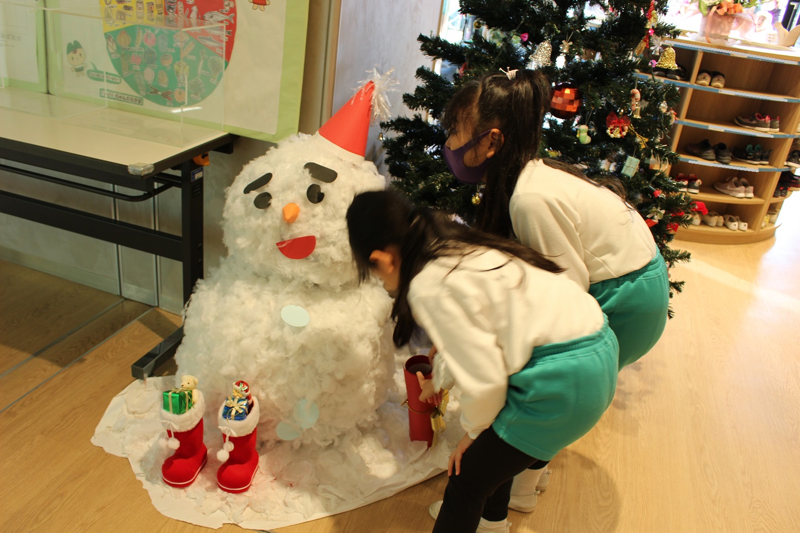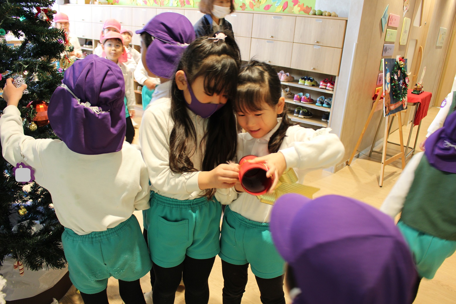 ゆり組の女の子が2人、ツリーのプレゼントの飾りをブーツの中に入れて遊んでいました!