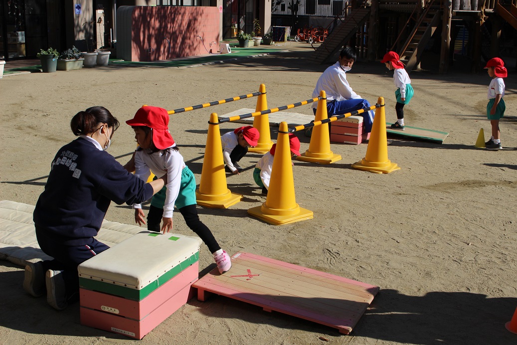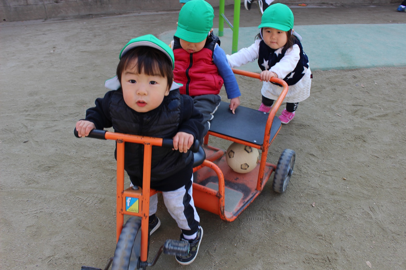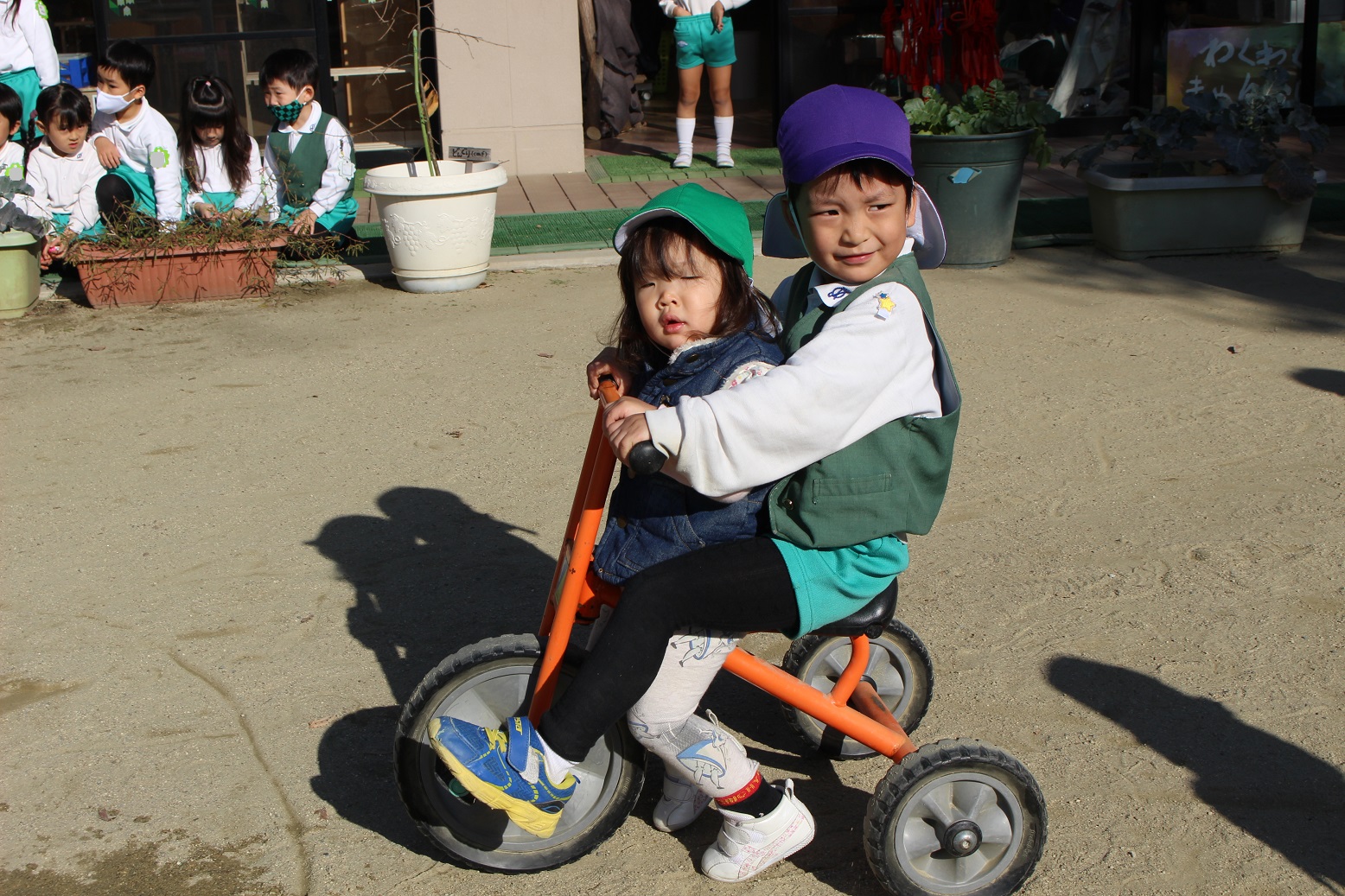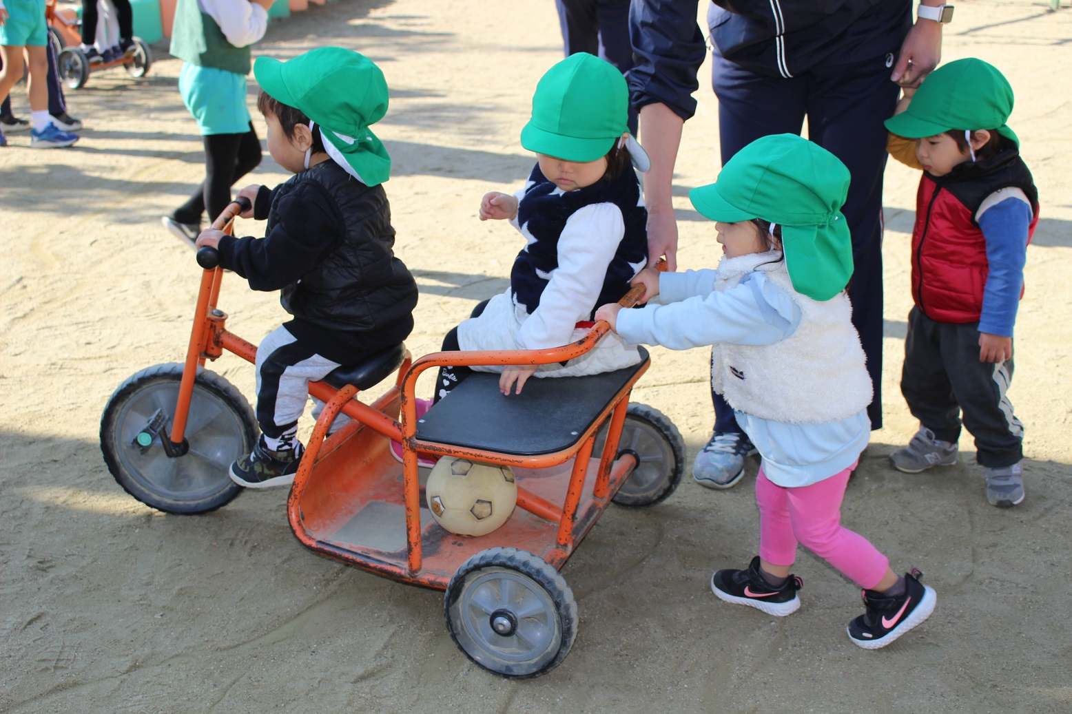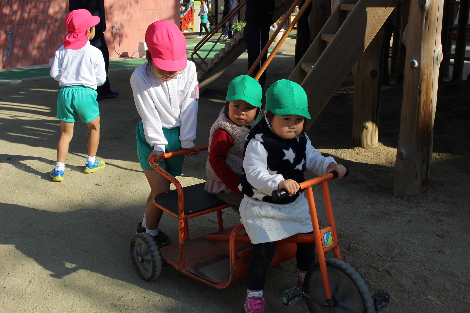 年長組さんが三輪車を押してあげたり、ボールあそびをしたりしている姿も見られました!