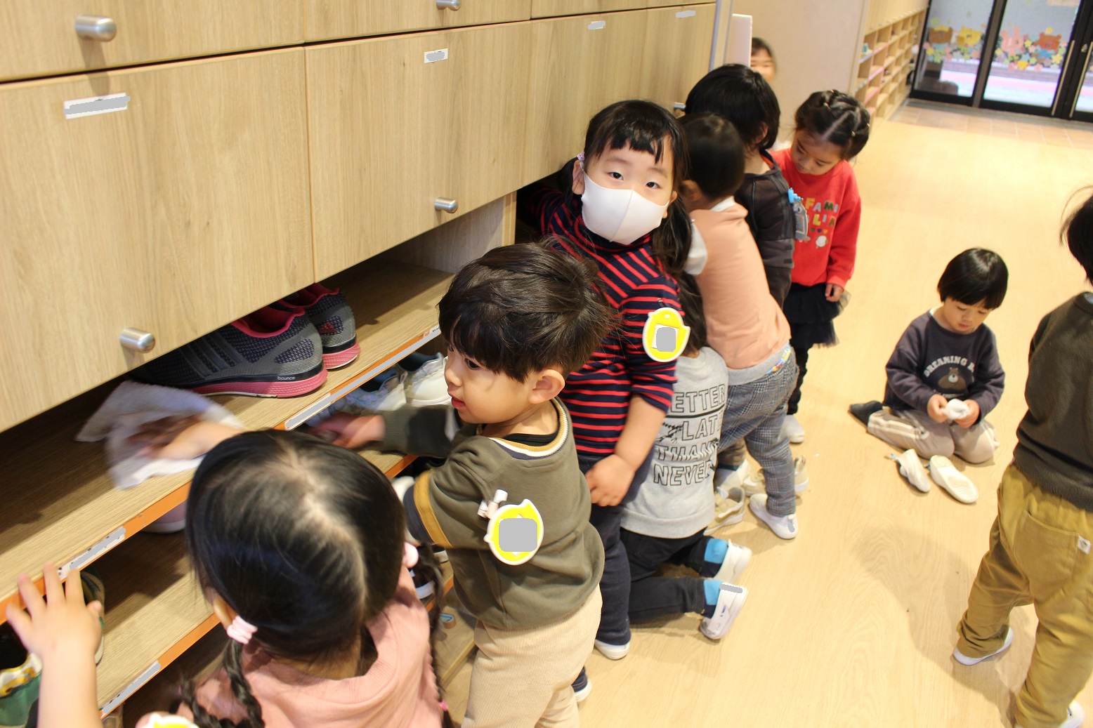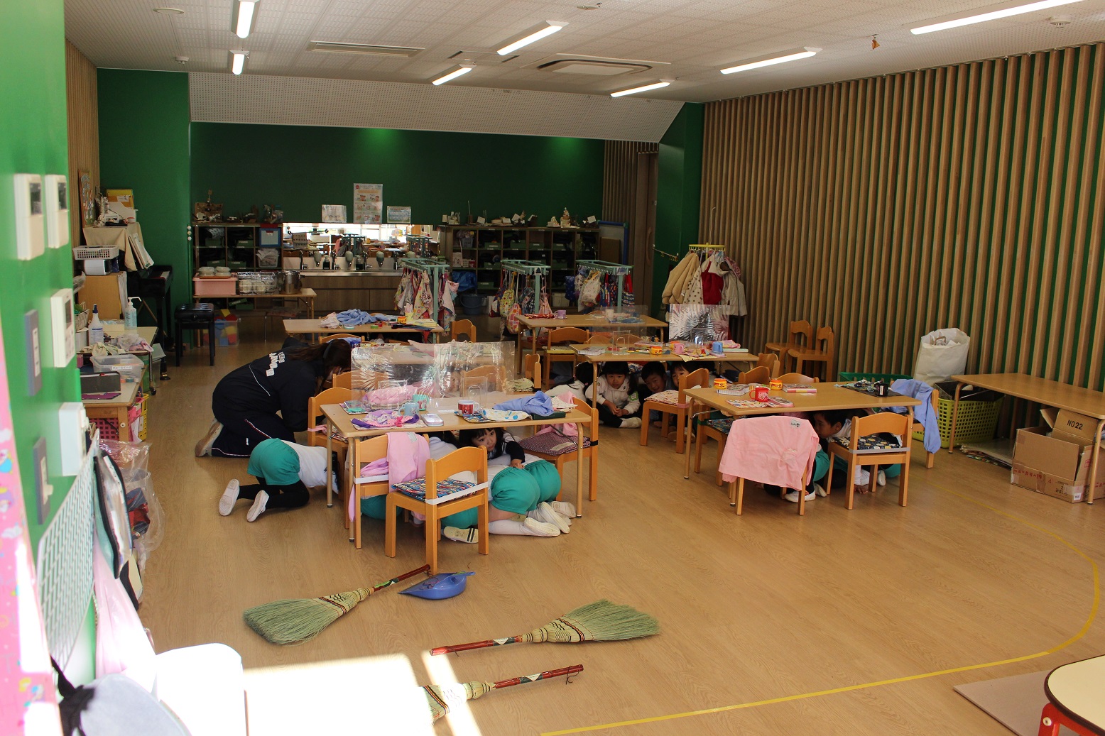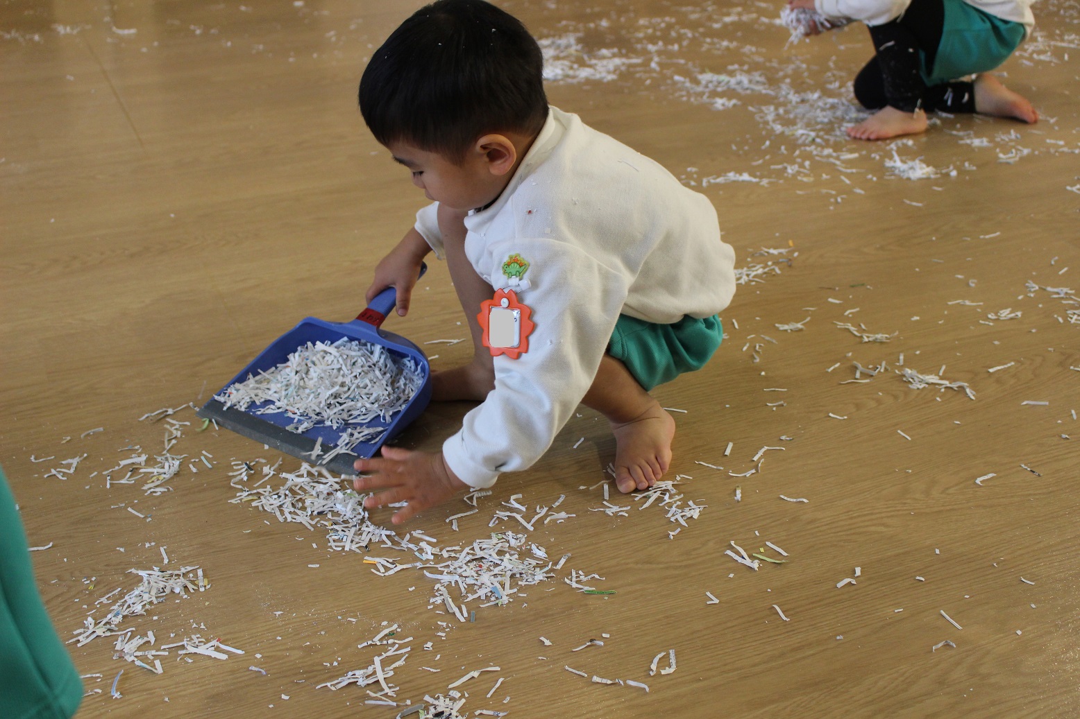 ↓ぱんだ組とひよこ組の子どもたちが玄関を大掃除!