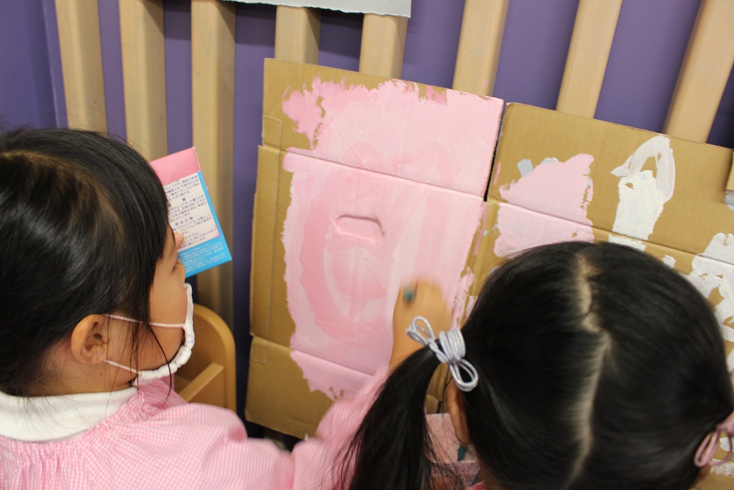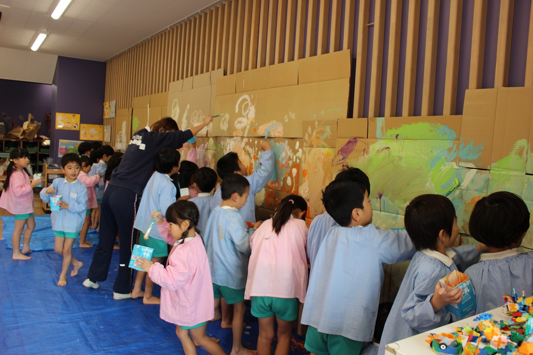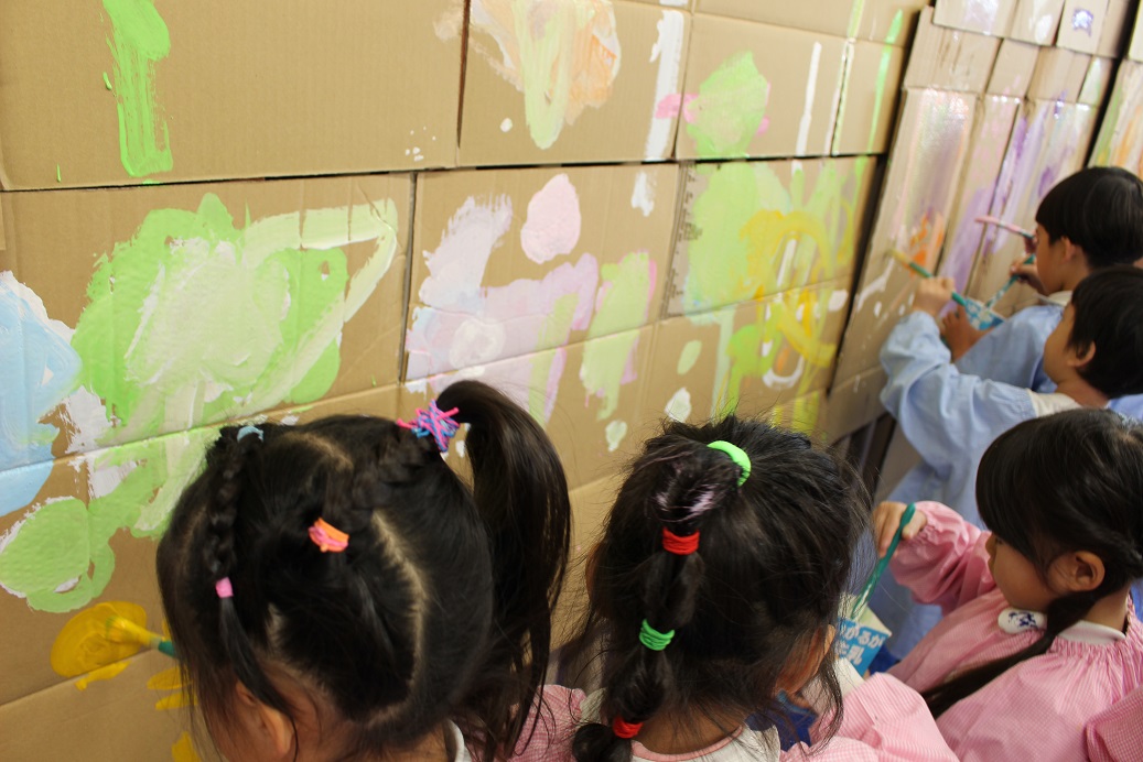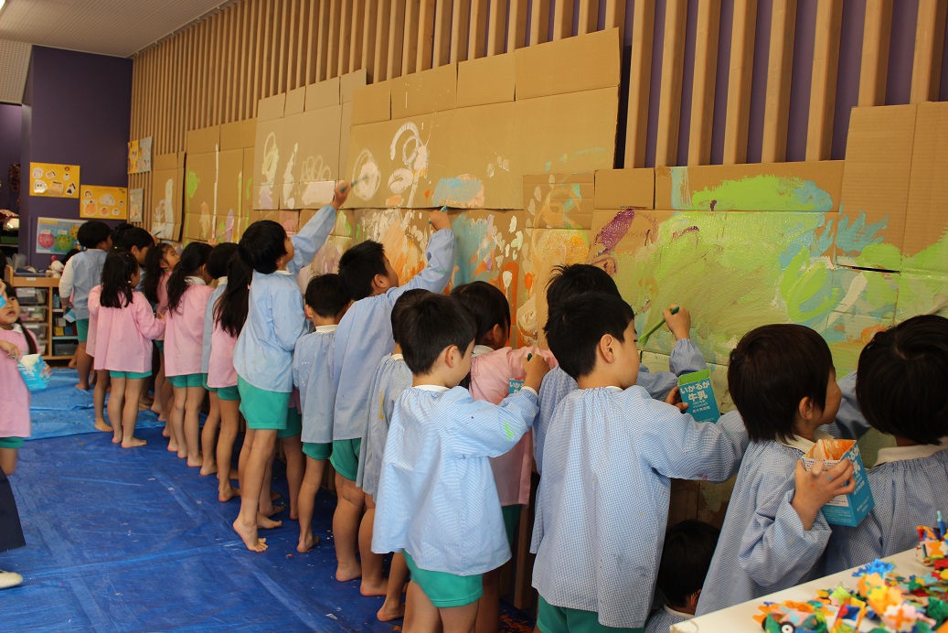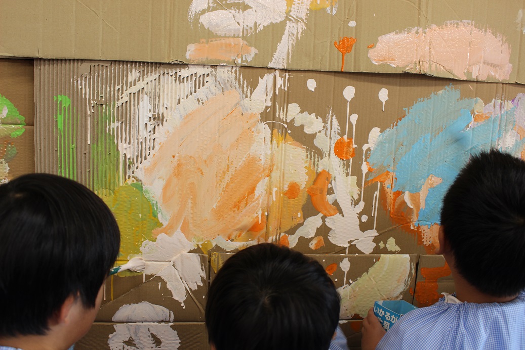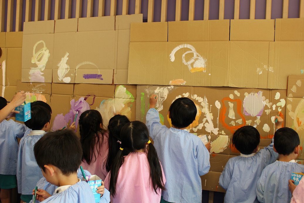 あやめ組は、大きな段ボールのキャンバスに絵の具でダイナミックに描くことを楽しみました!