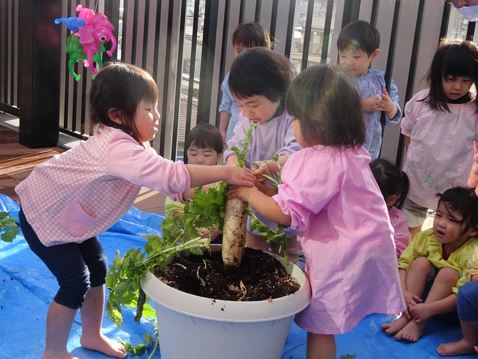 ぱんだ組が水やり等をして育ててきた大根を抜きました。