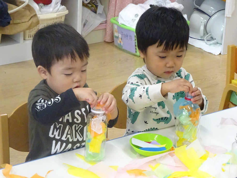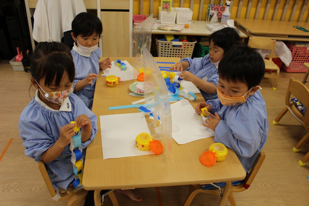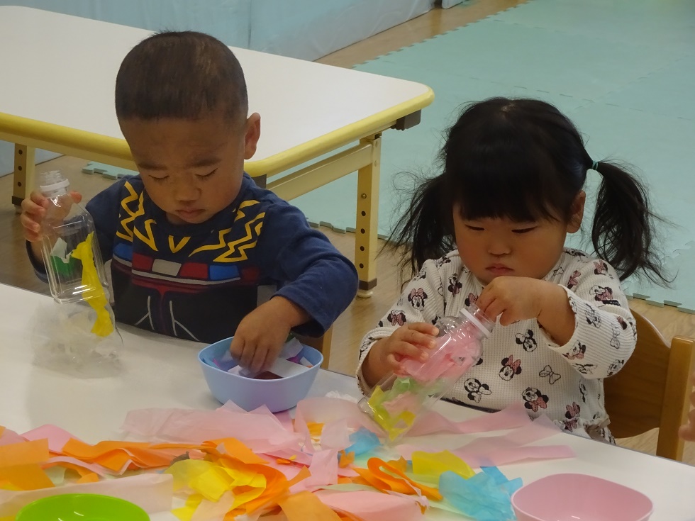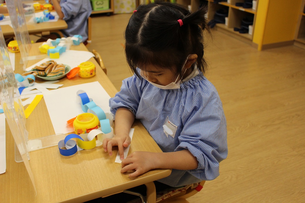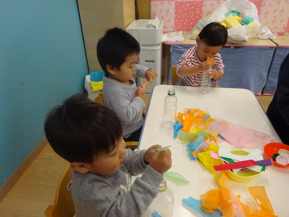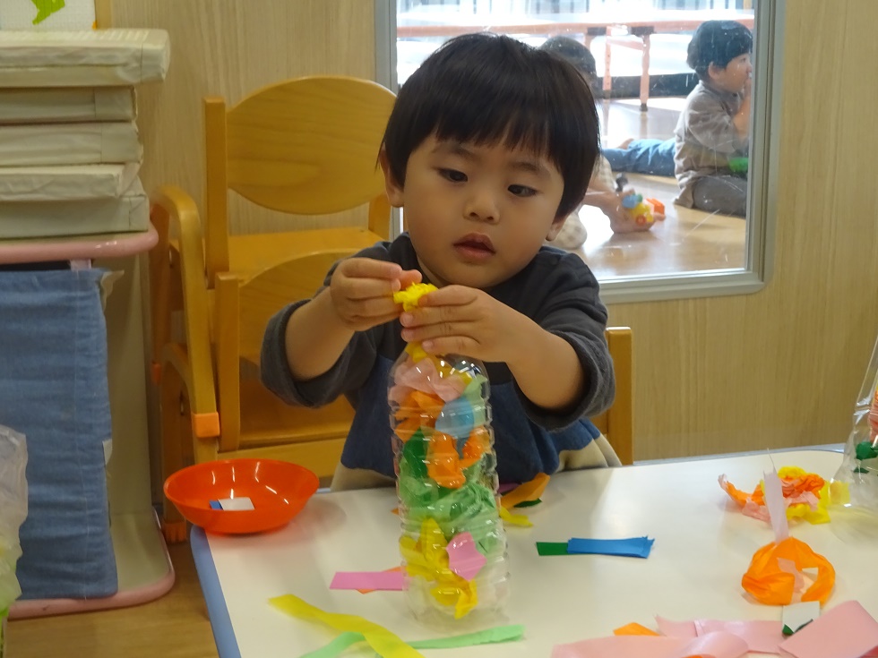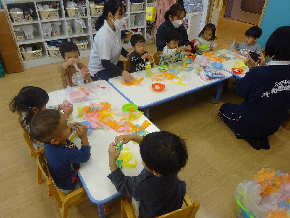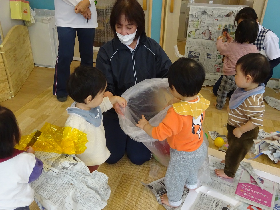 こあら組の保育室では、小さなこどもの手でも破きやすい新聞紙を