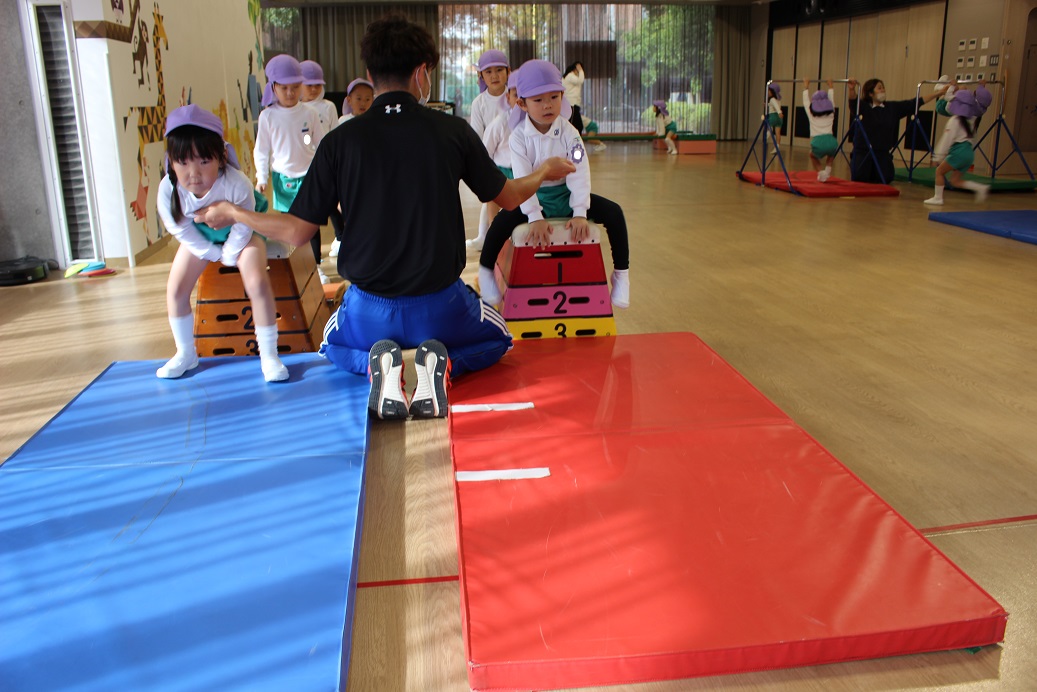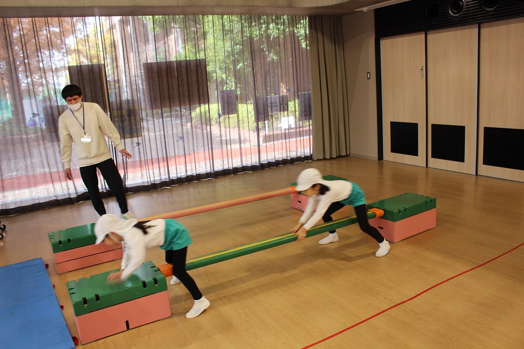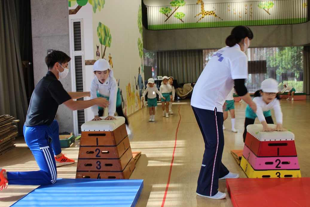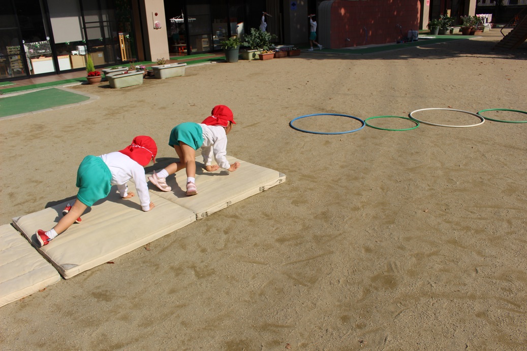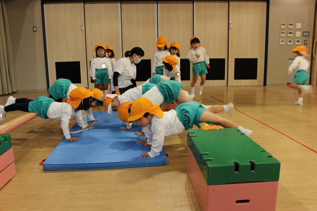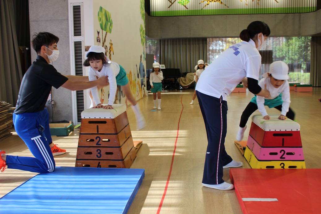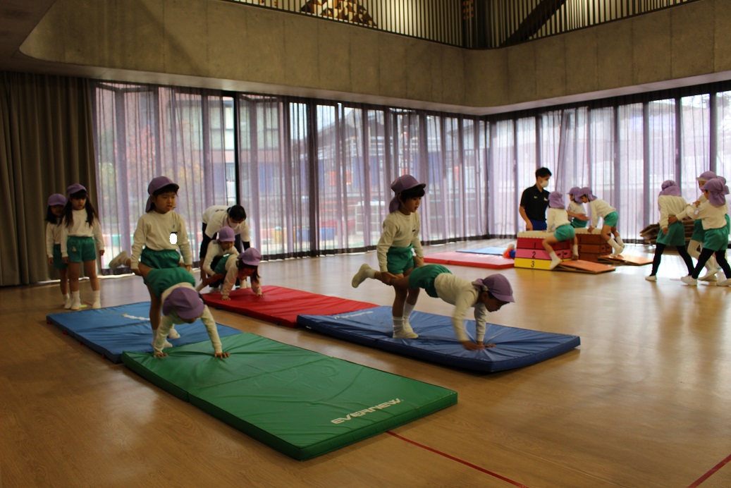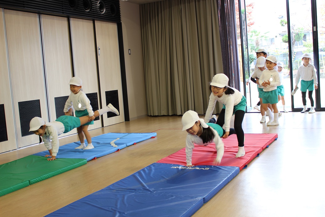 跳び箱を跳ぶ時に手で自分の身体を支えるので、クマさん歩きをしています。