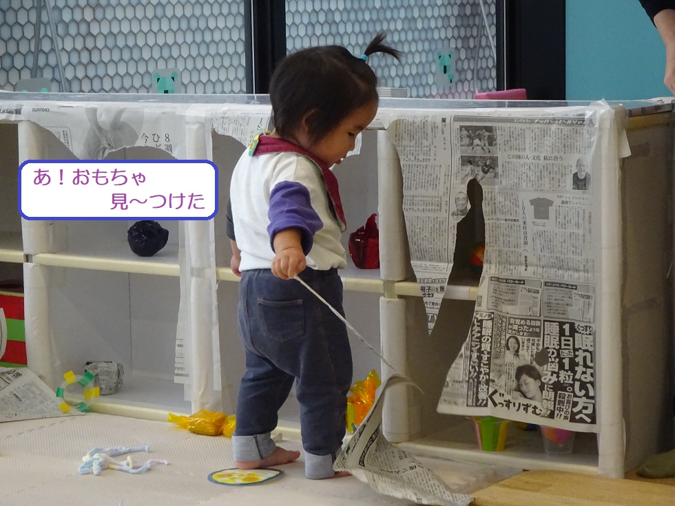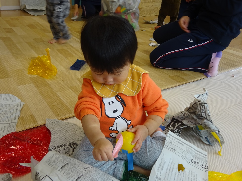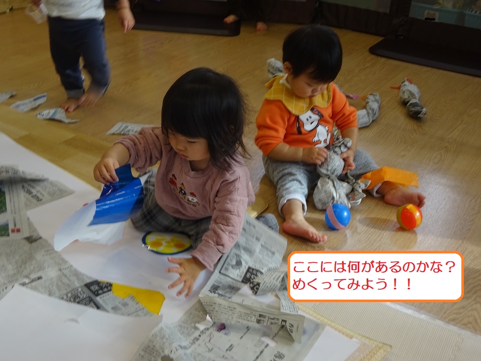 その新聞紙を破いて、中から写真やおもちゃを見つけて遊びます。