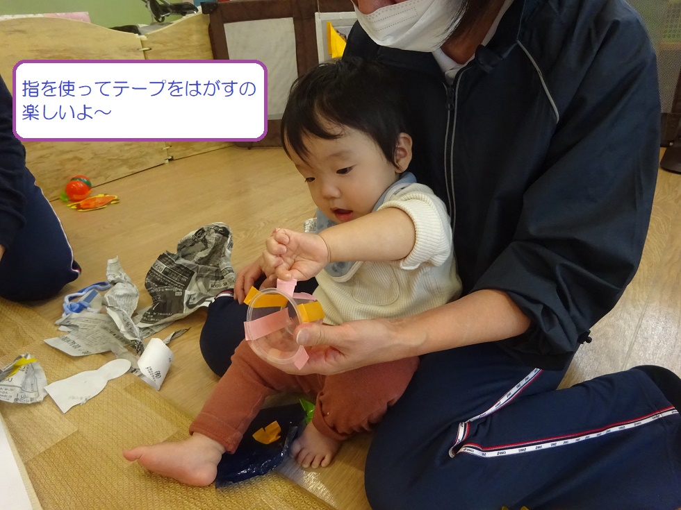 張り付けてあるビニールテープをはがして遊びます。