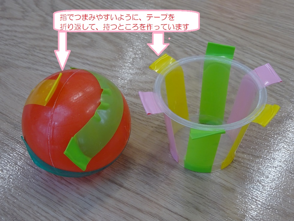 カラーボール、ゼリーカップで作ったおもちゃ。
