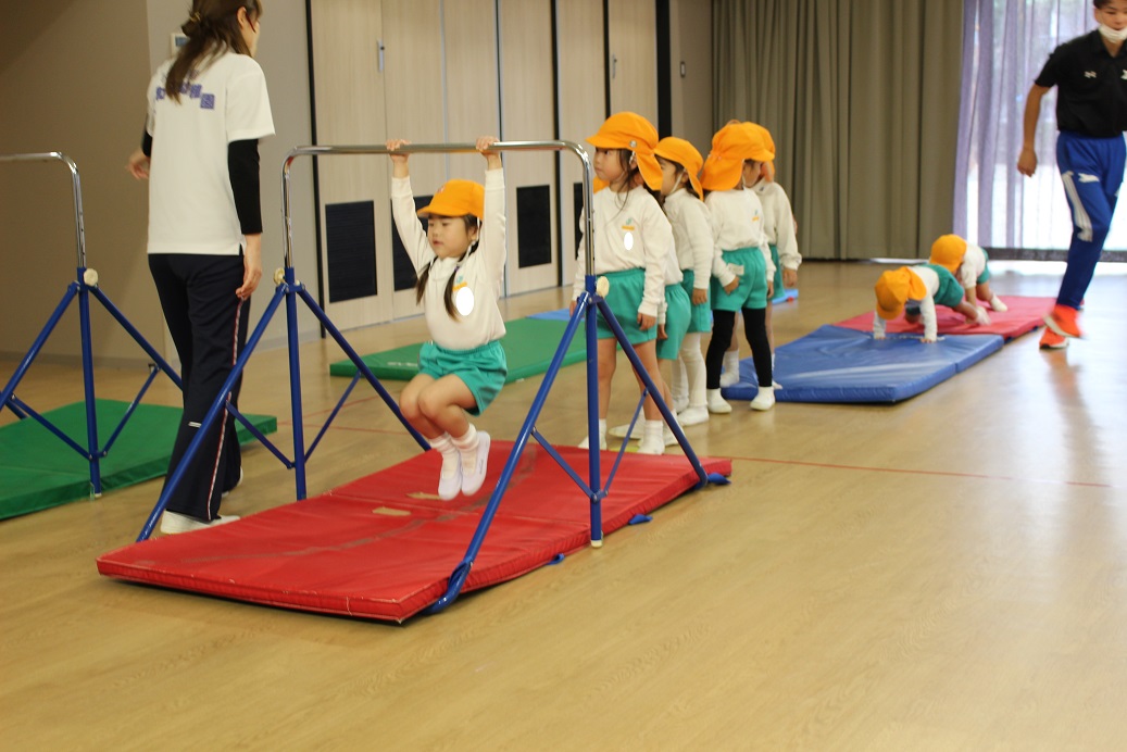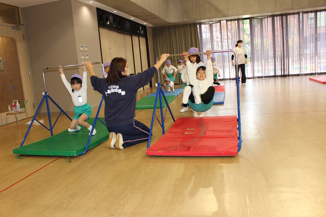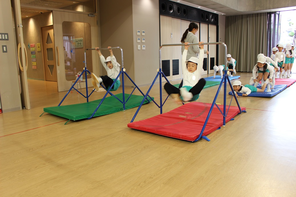 平均台に足を上げて手だけで横歩き。初めての運動でしたが、とっても上手でした。