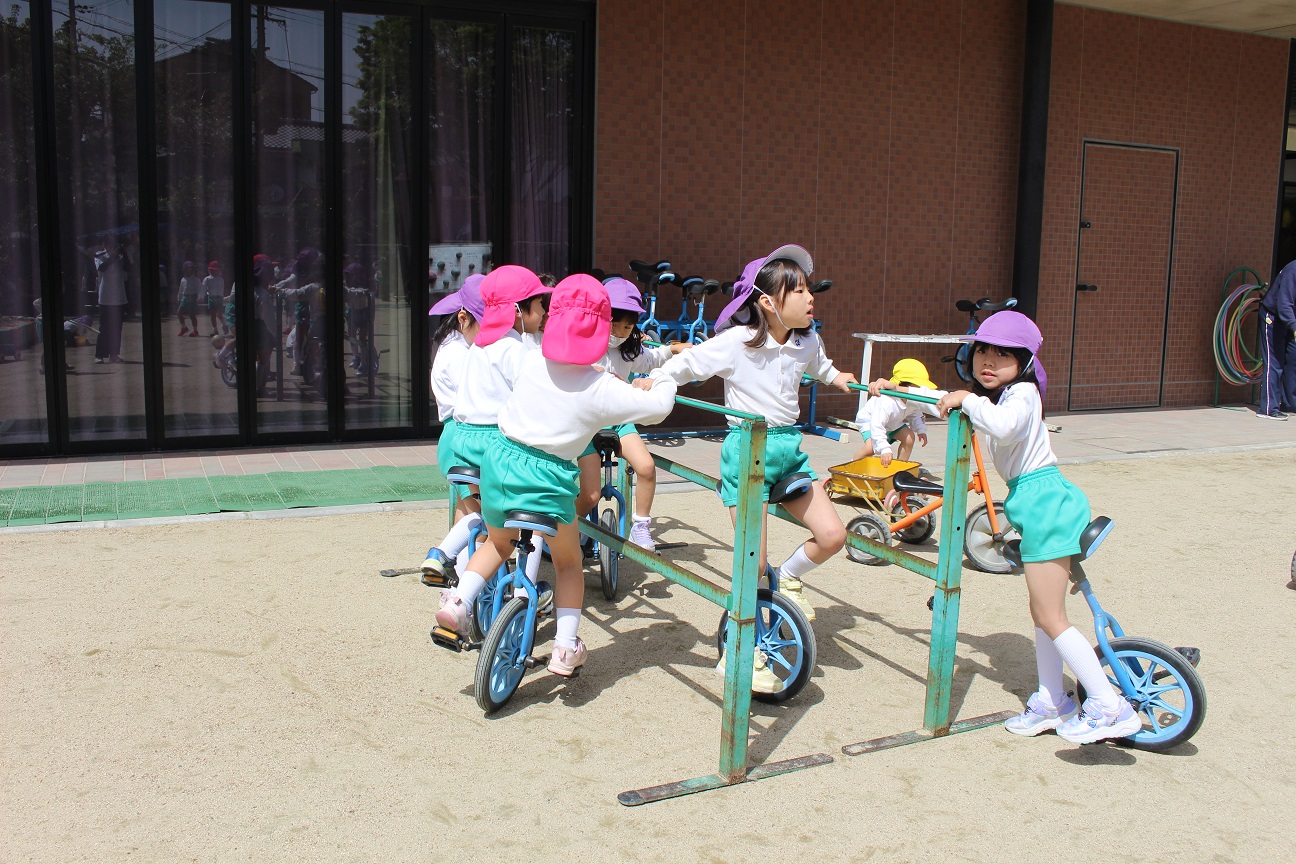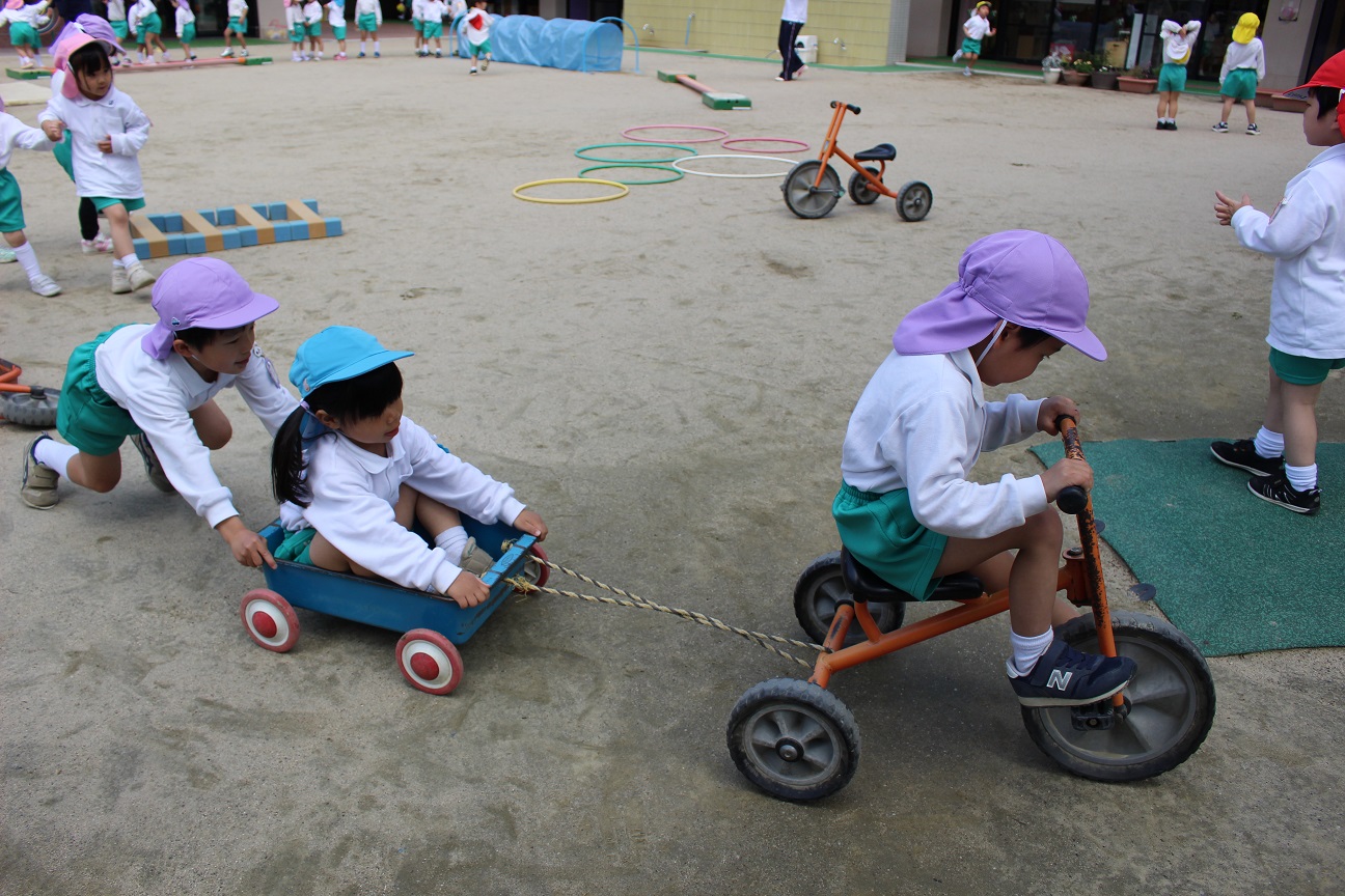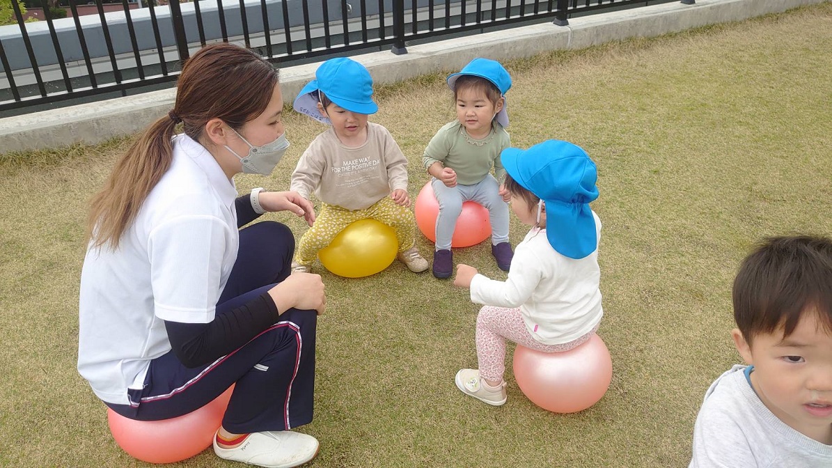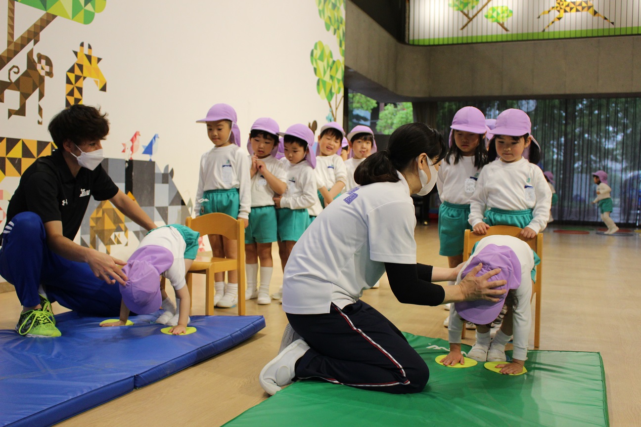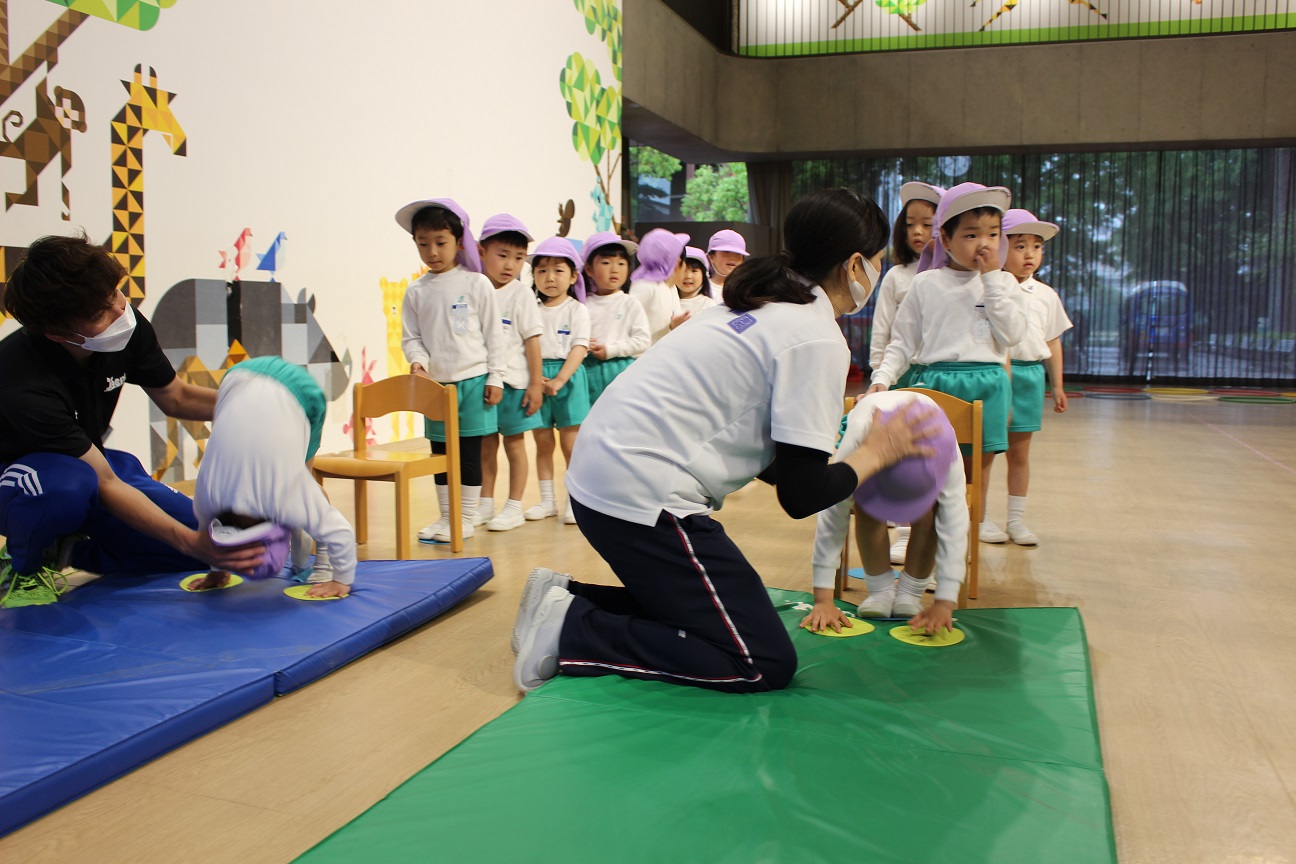 年中組の指導では、幼児イスを使って、