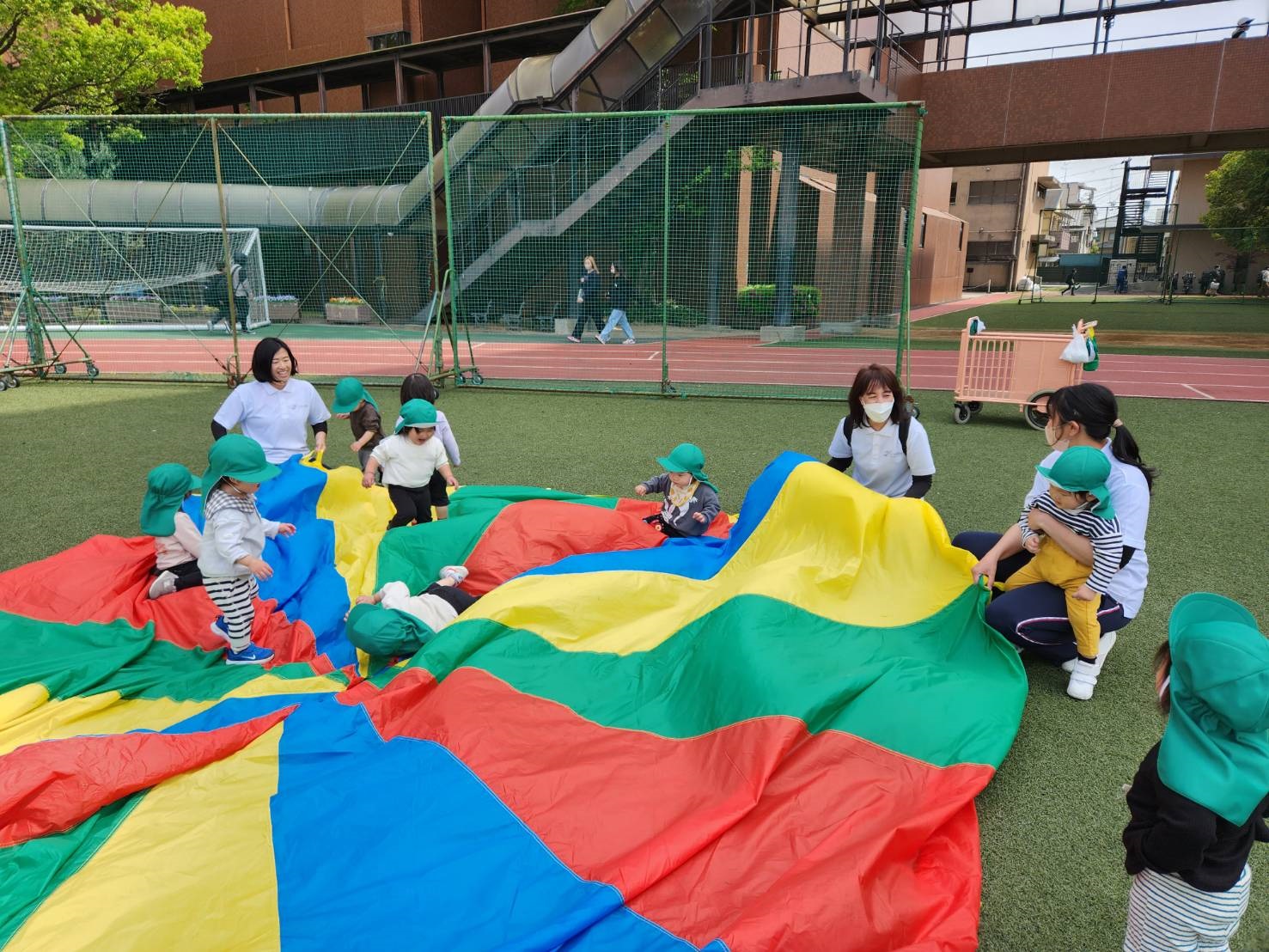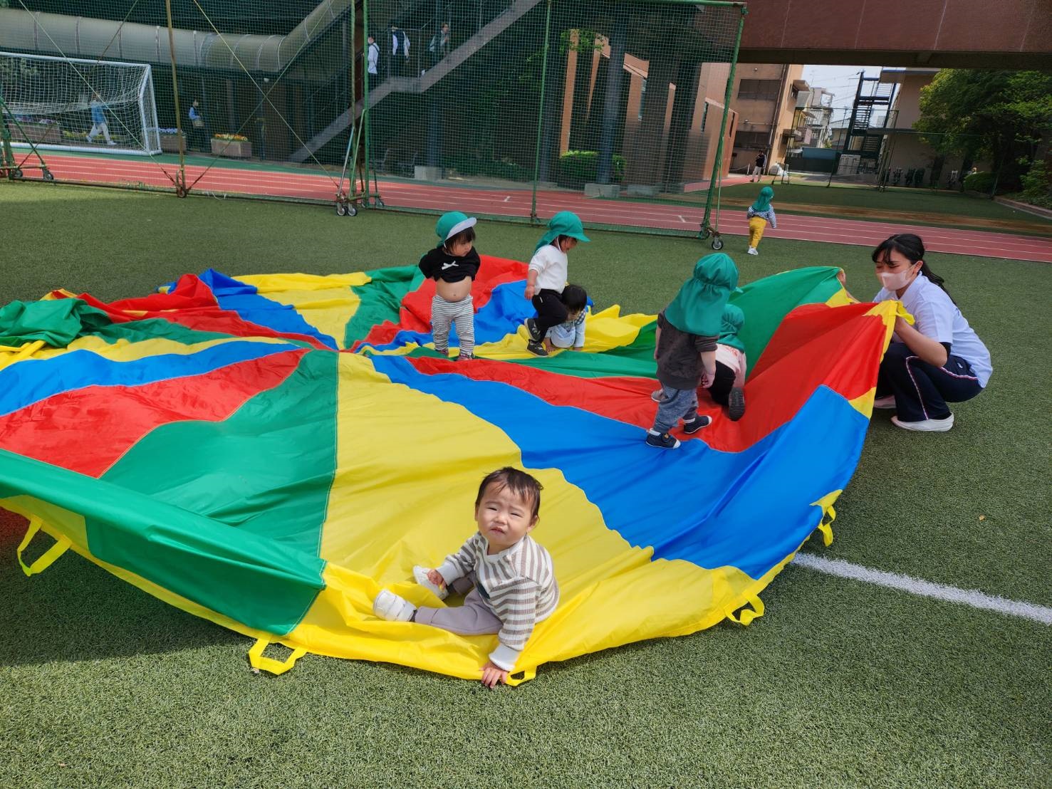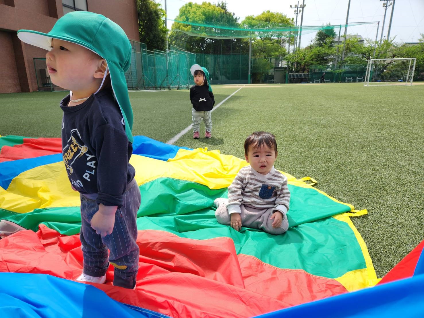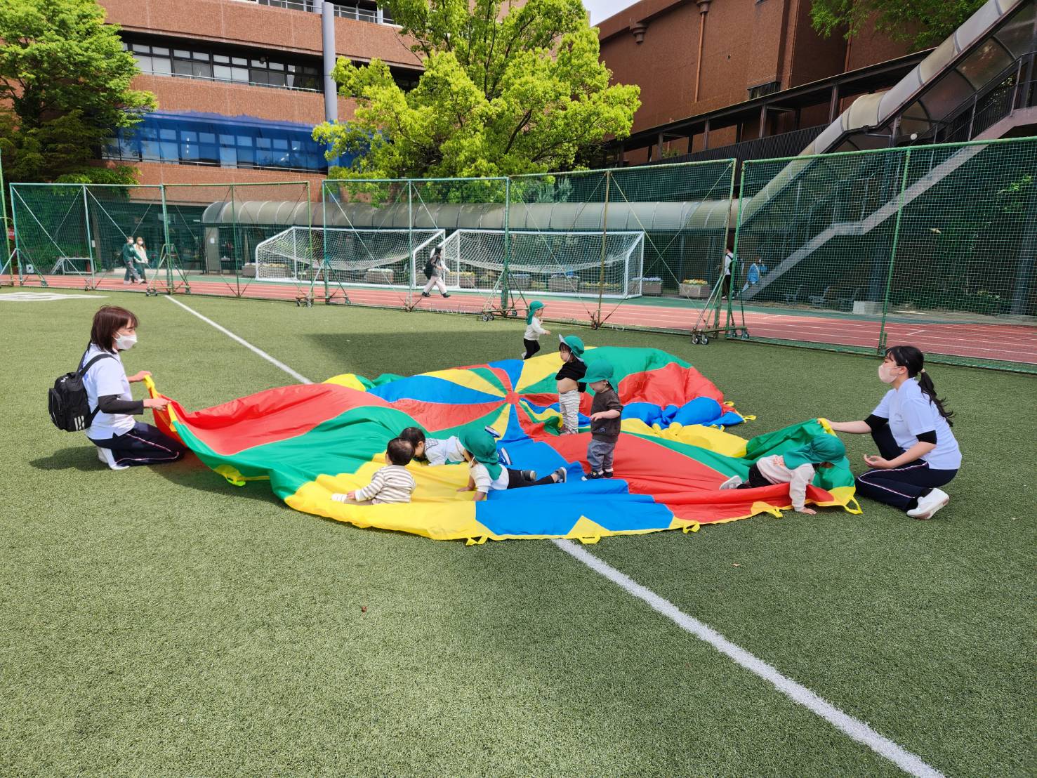 広いグラウンドで、パラバルーンを広げて楽しかったね!!