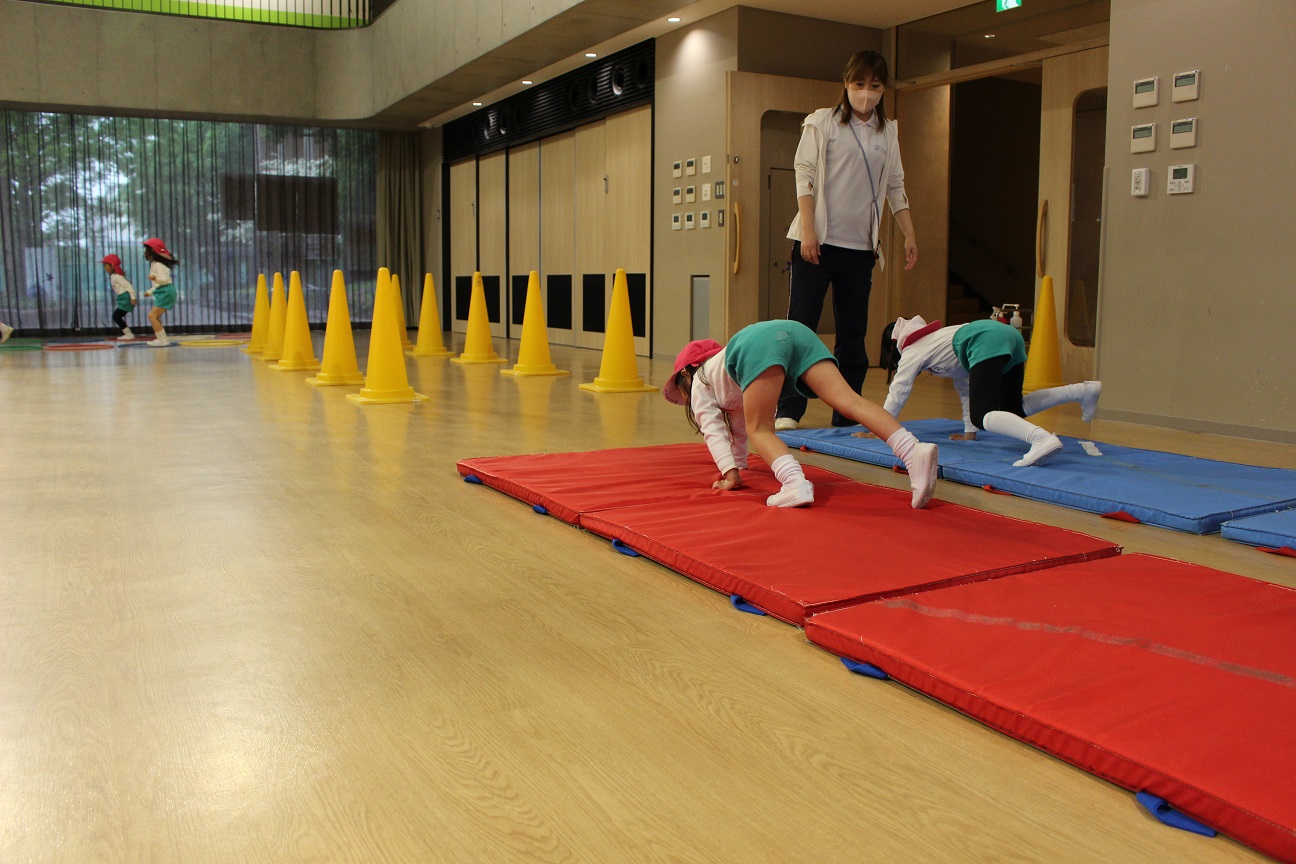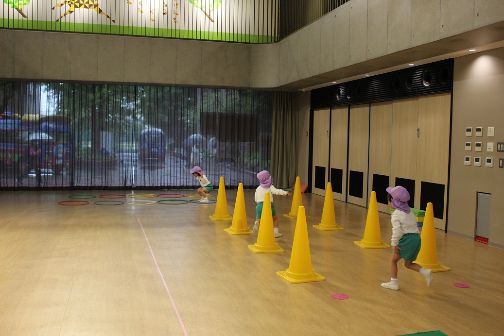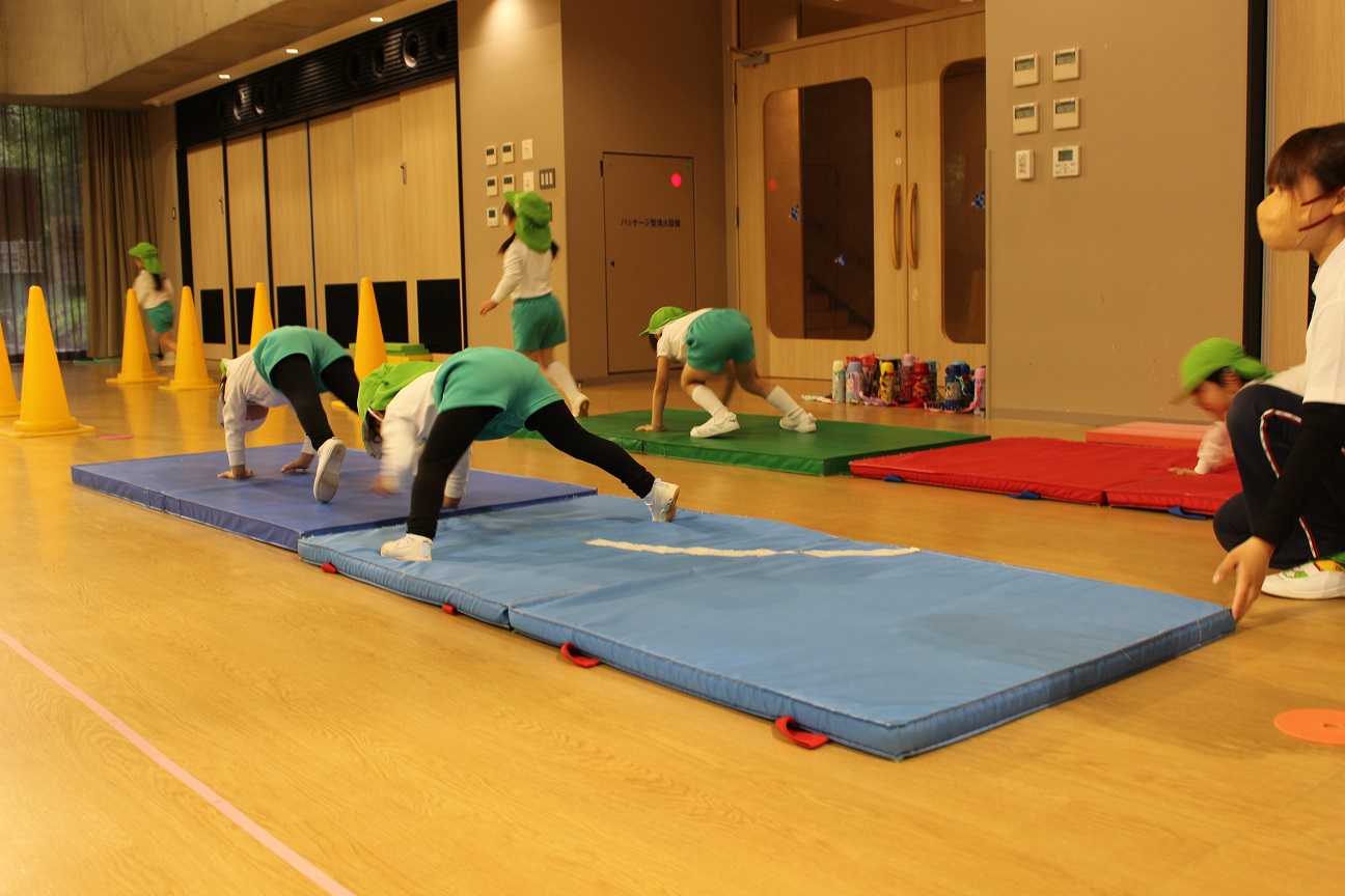 前まわり、後ろまわり、くま歩き、ジグザク歩き、両足ジャンプをしました。