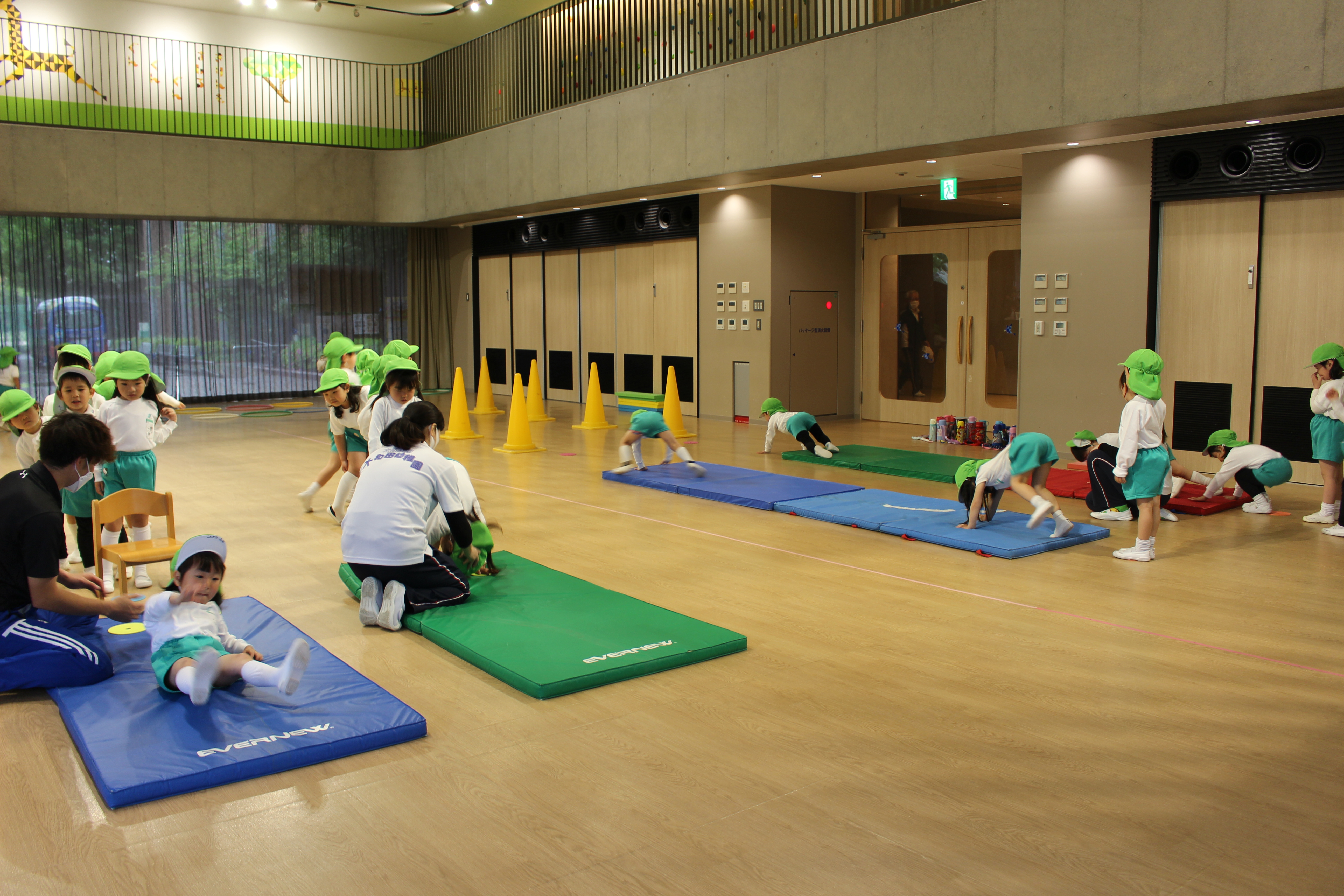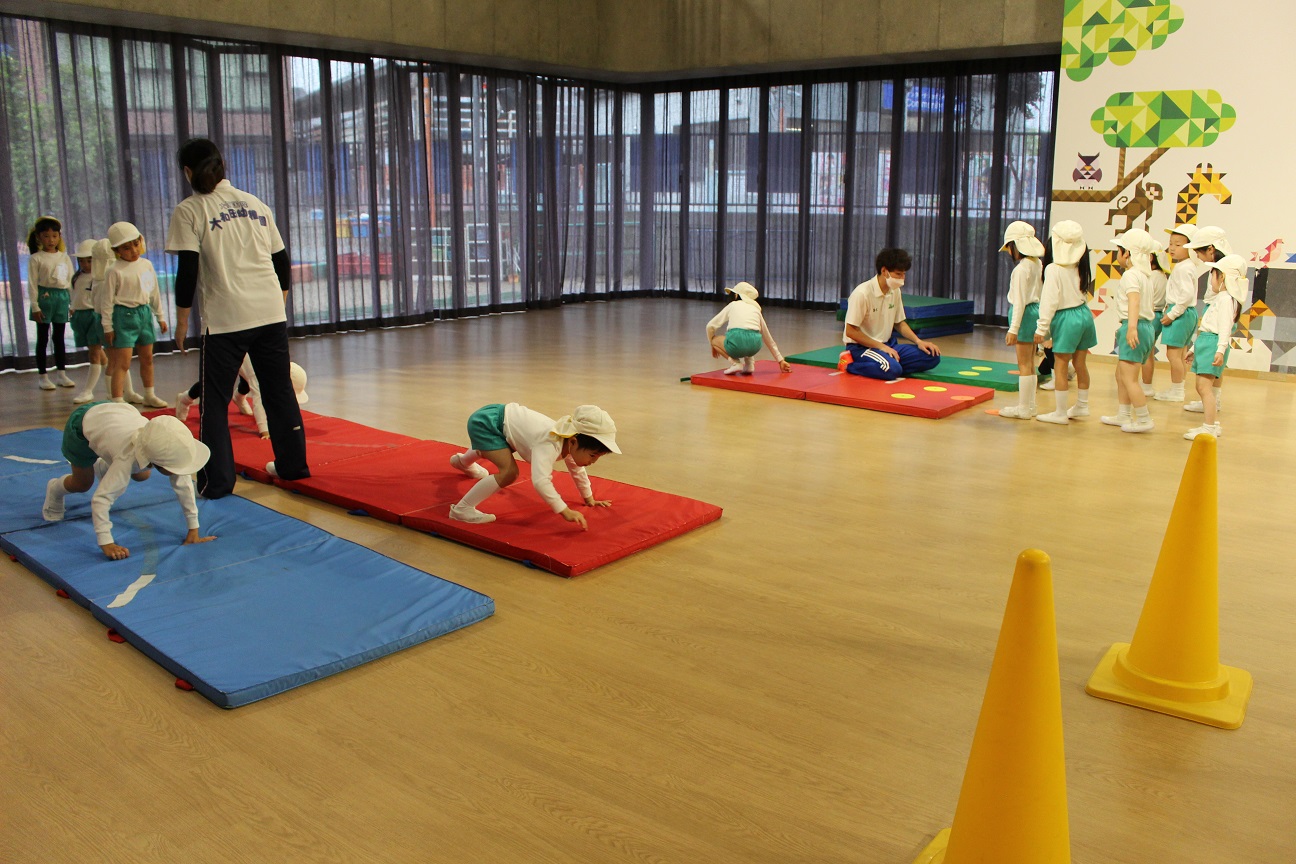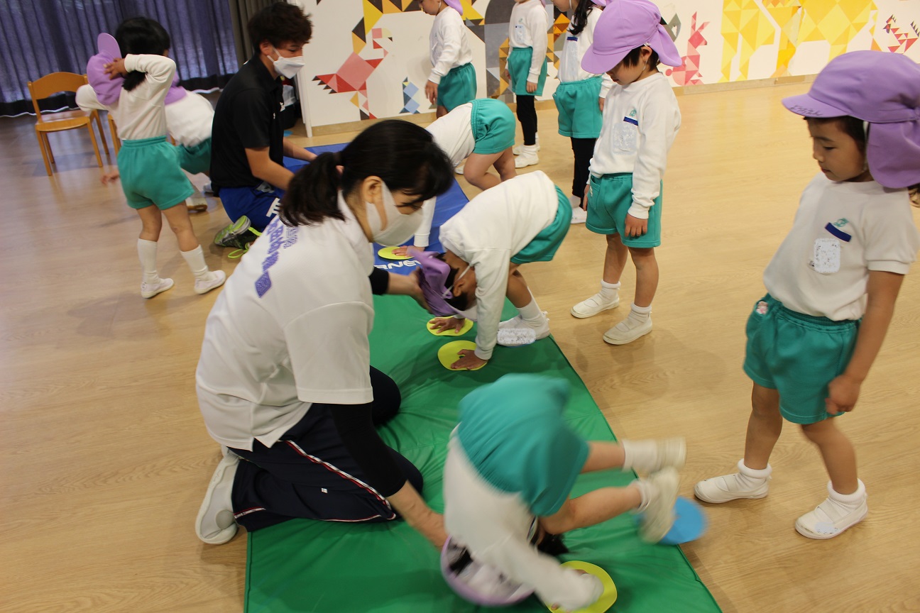 前まわり、後ろまわり、くま歩き、ジグザク歩き、両足ジャンプをしました。