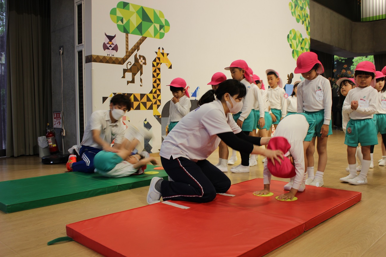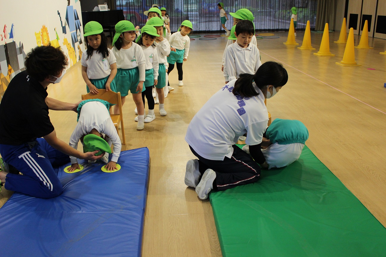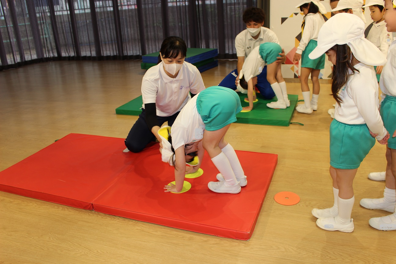 手をつく場所、足をとじることなどを学び、きちんとした体勢で前まわりができるように