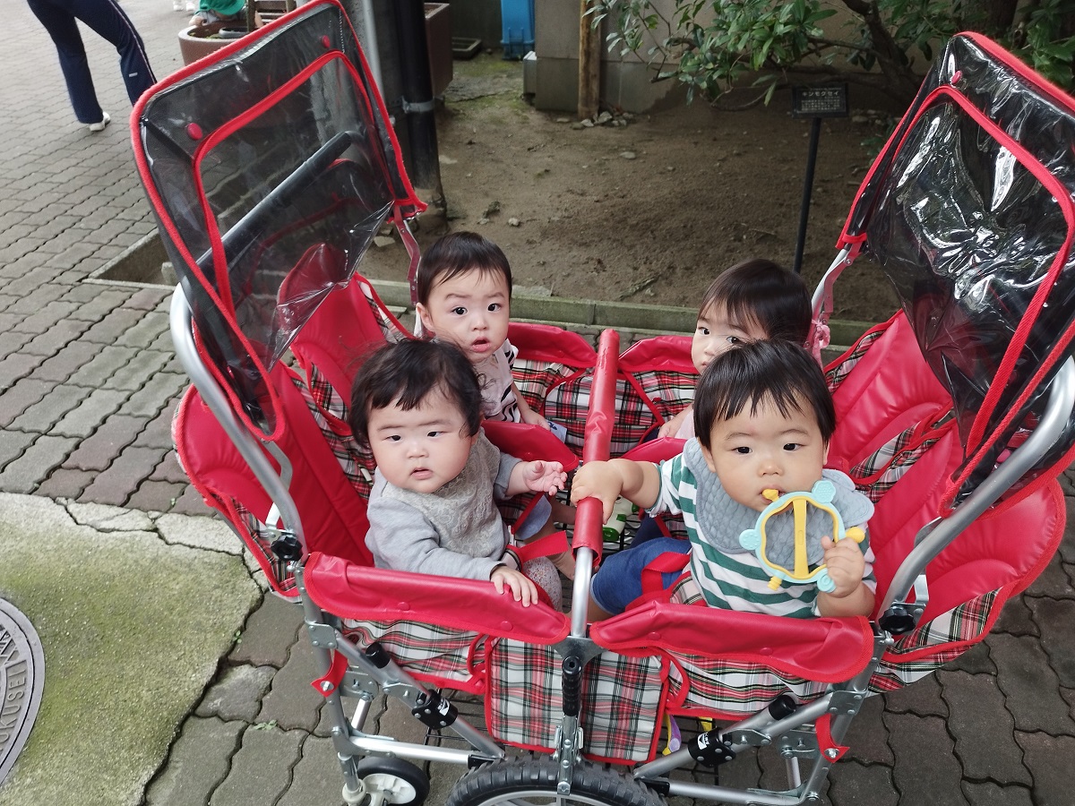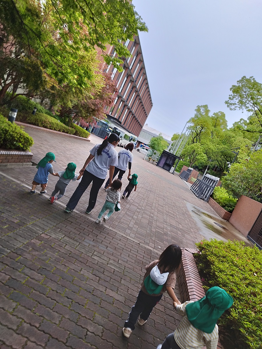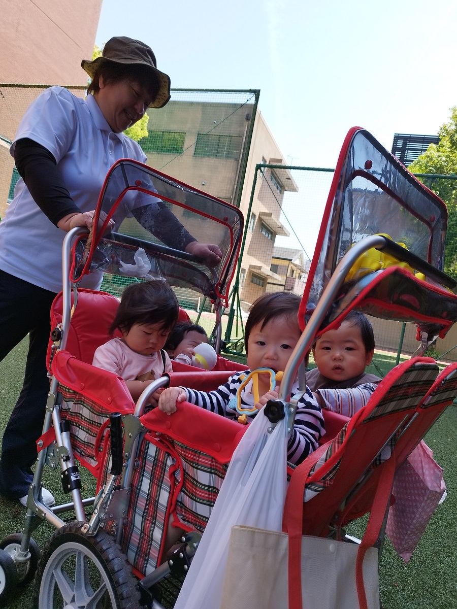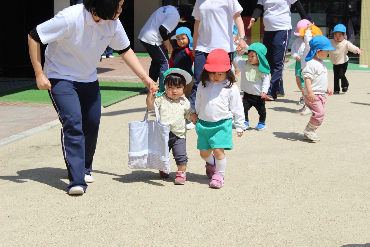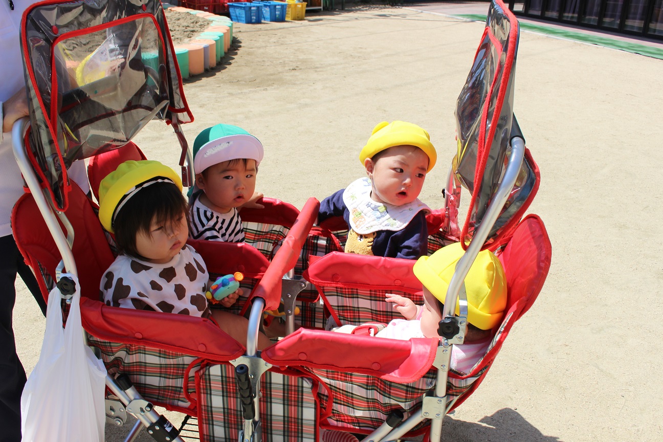 うさぎ組さんは散歩車に乗ったりお友だちと手を繋いだり、ぱんだ組さんは全員手を繋いで