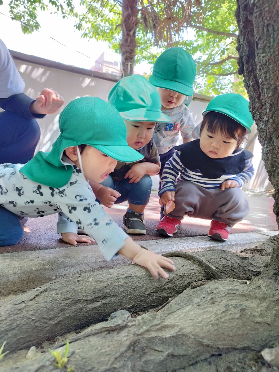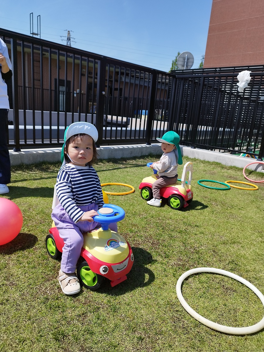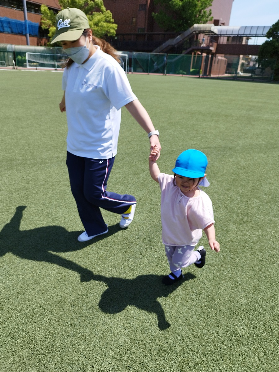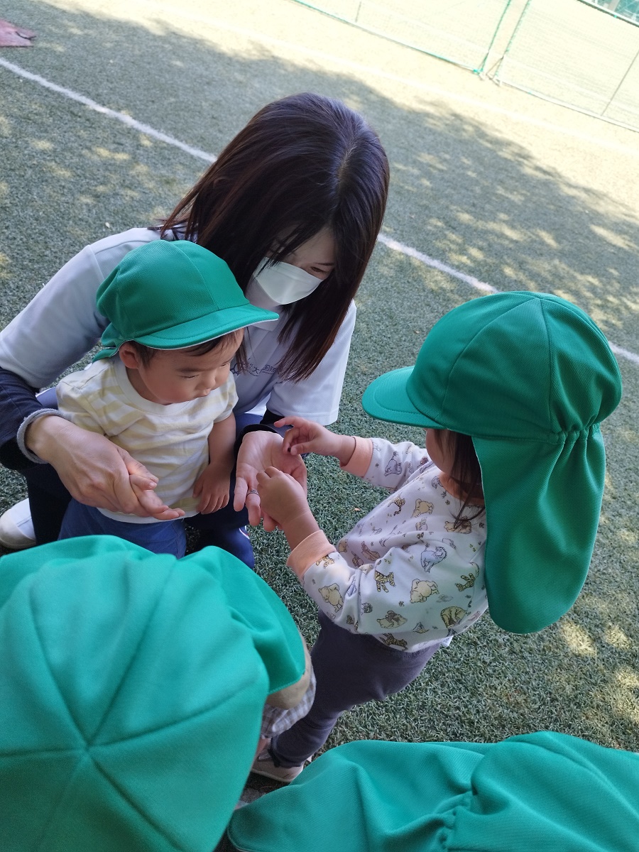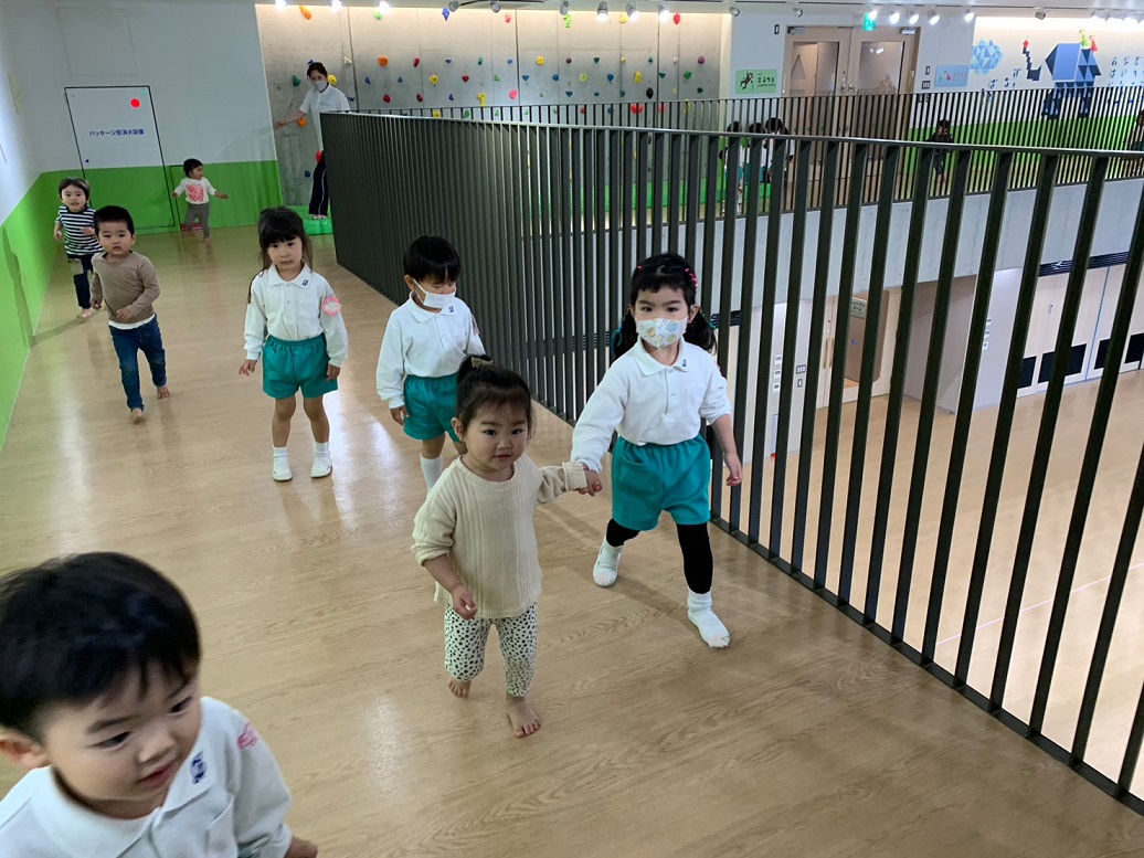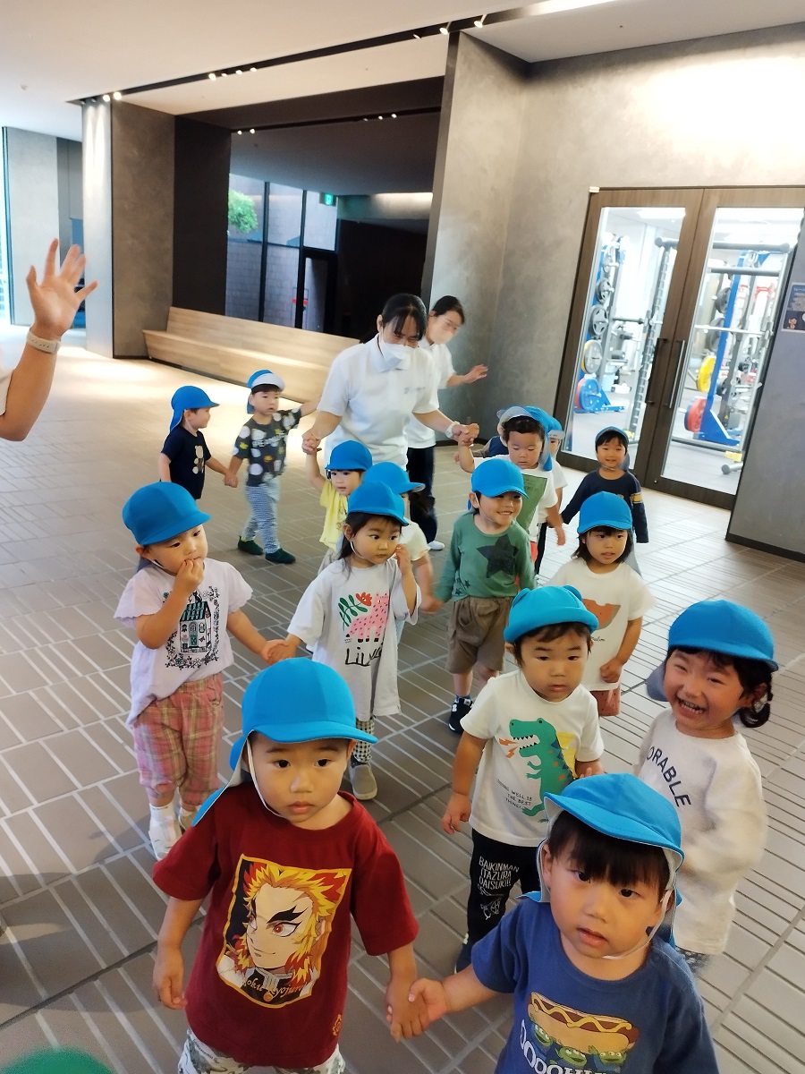 うさぎ組さんは散歩車に乗ったりお友だちと手を繋いだり、ぱんだ組さんは全員手を繋いで