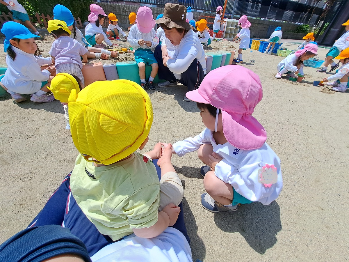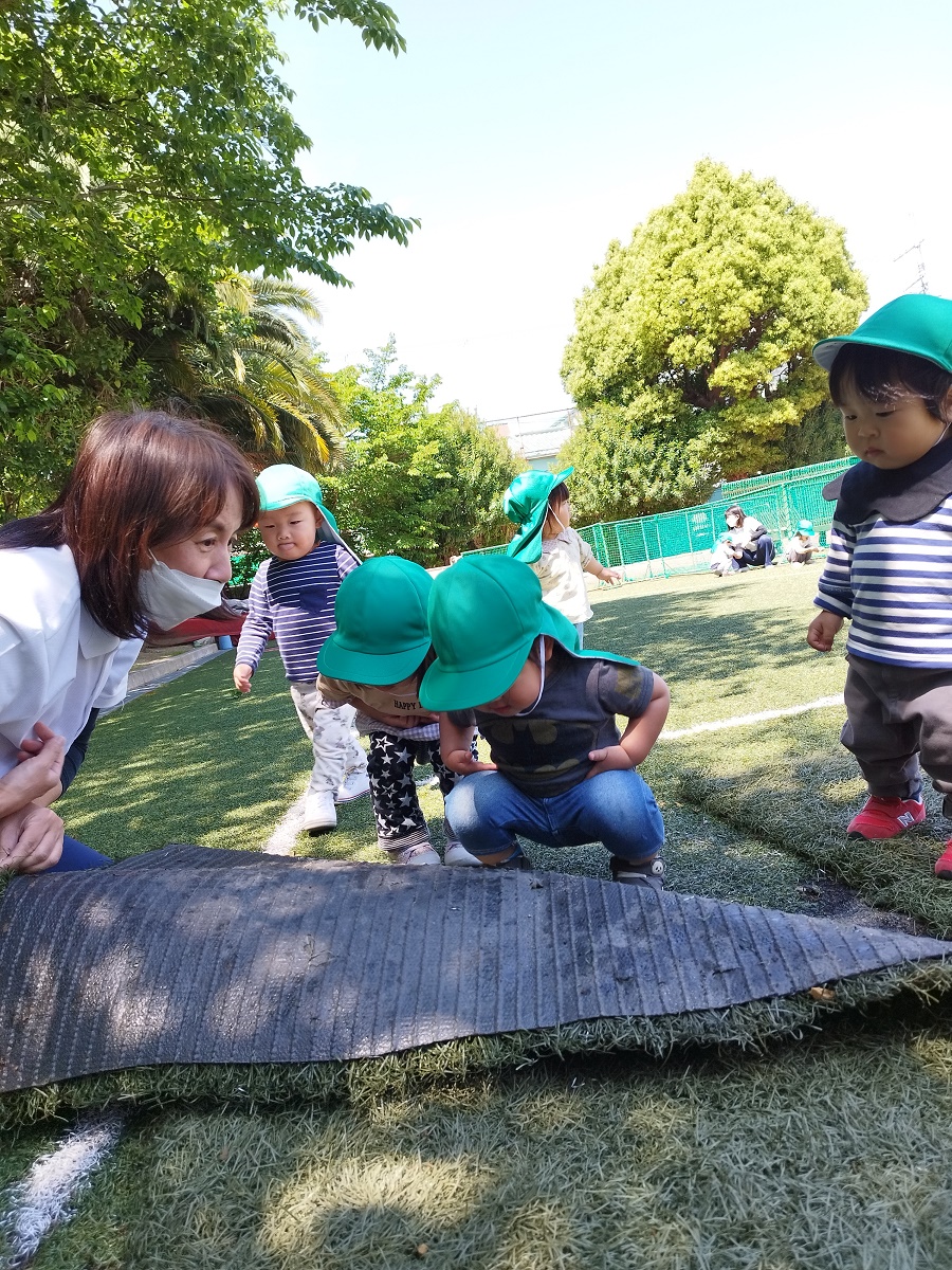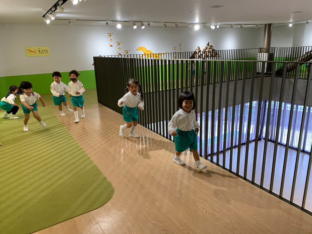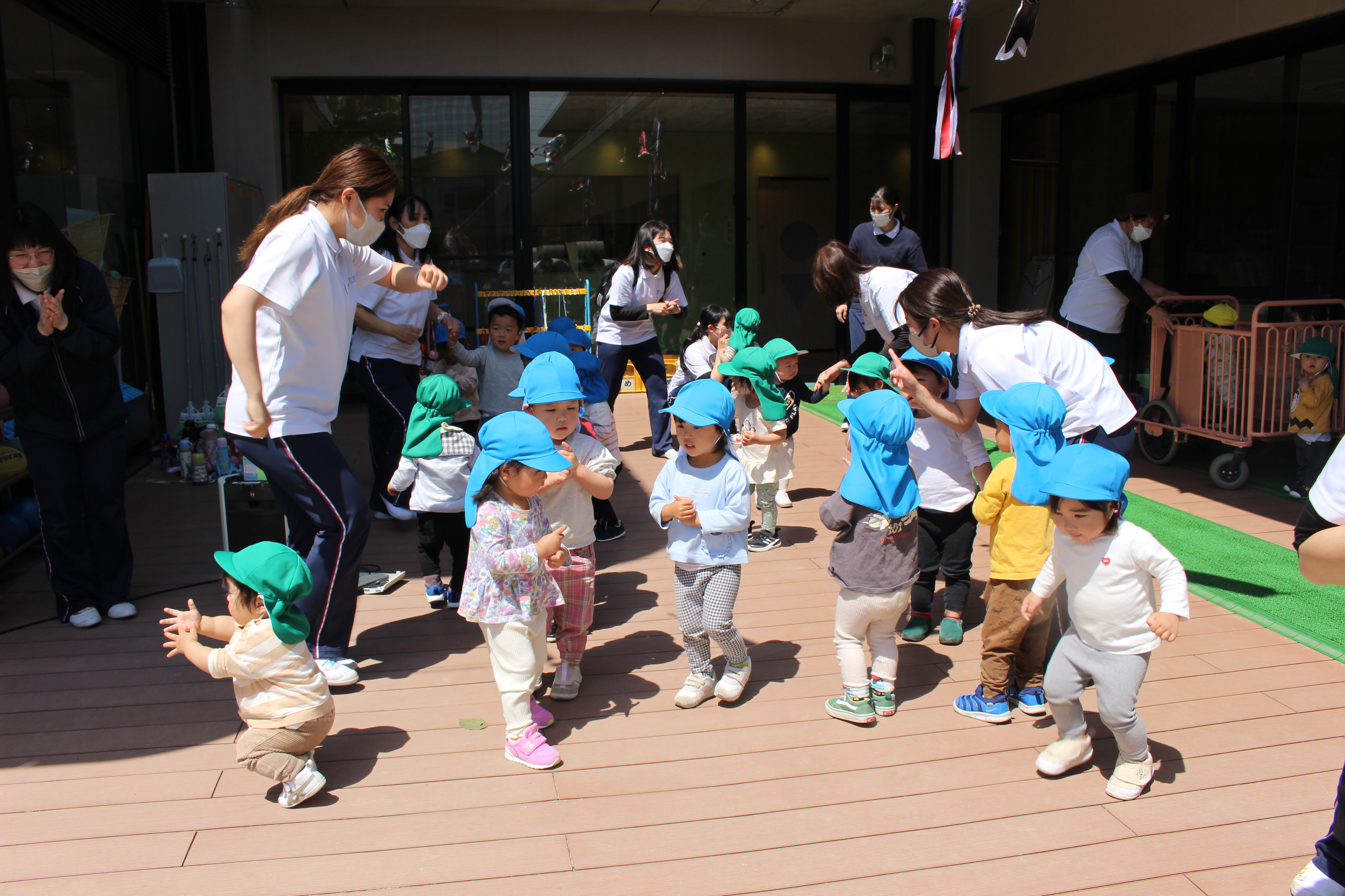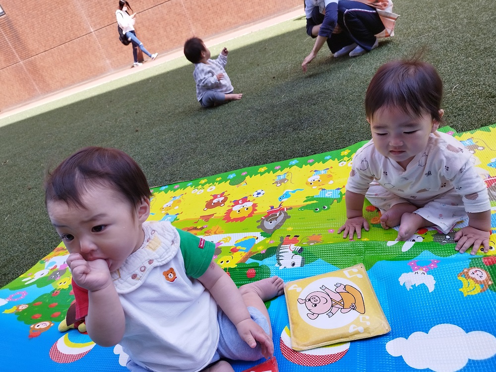 うさぎ組さんは散歩車に乗ったりお友だちと手を繋いだり、ぱんだ組さんは全員手を繋いで