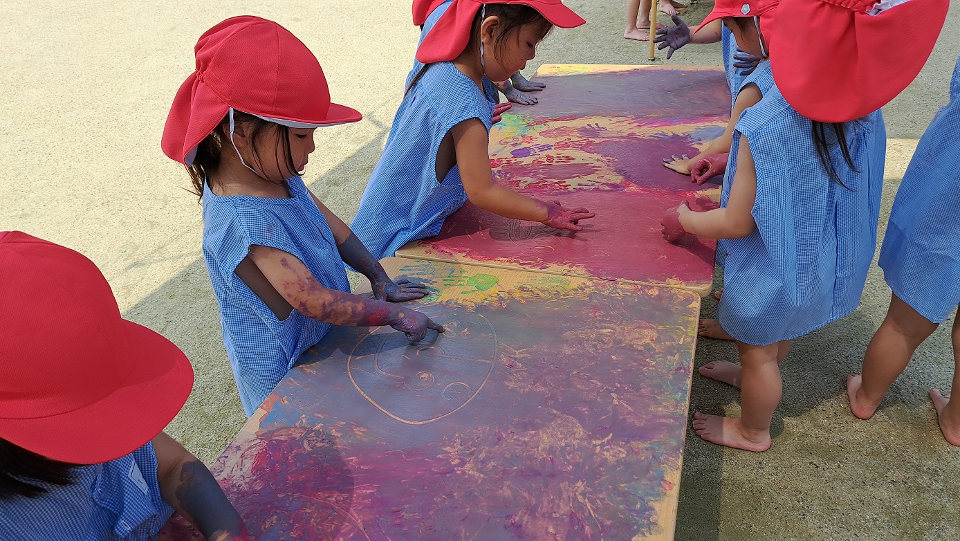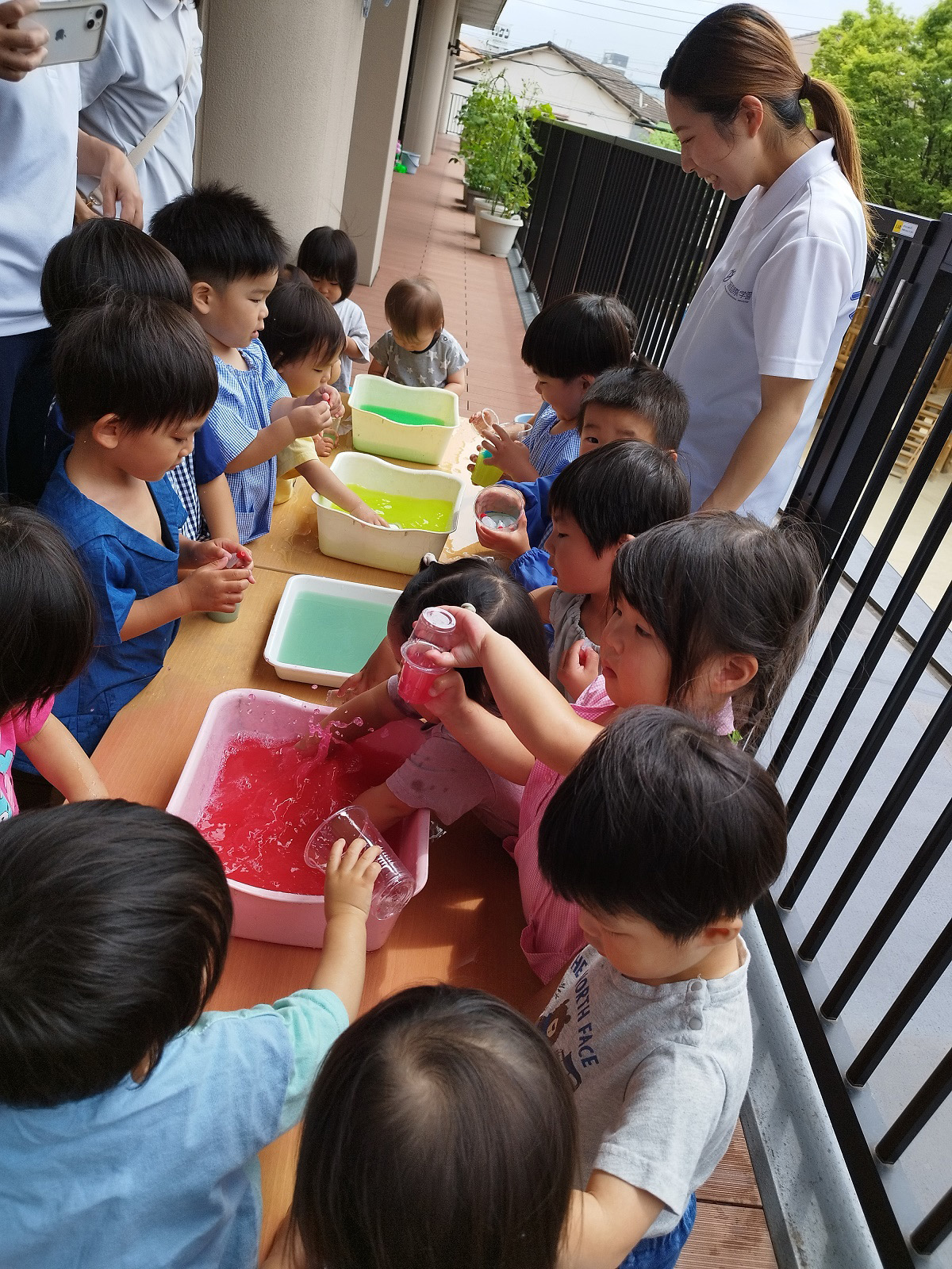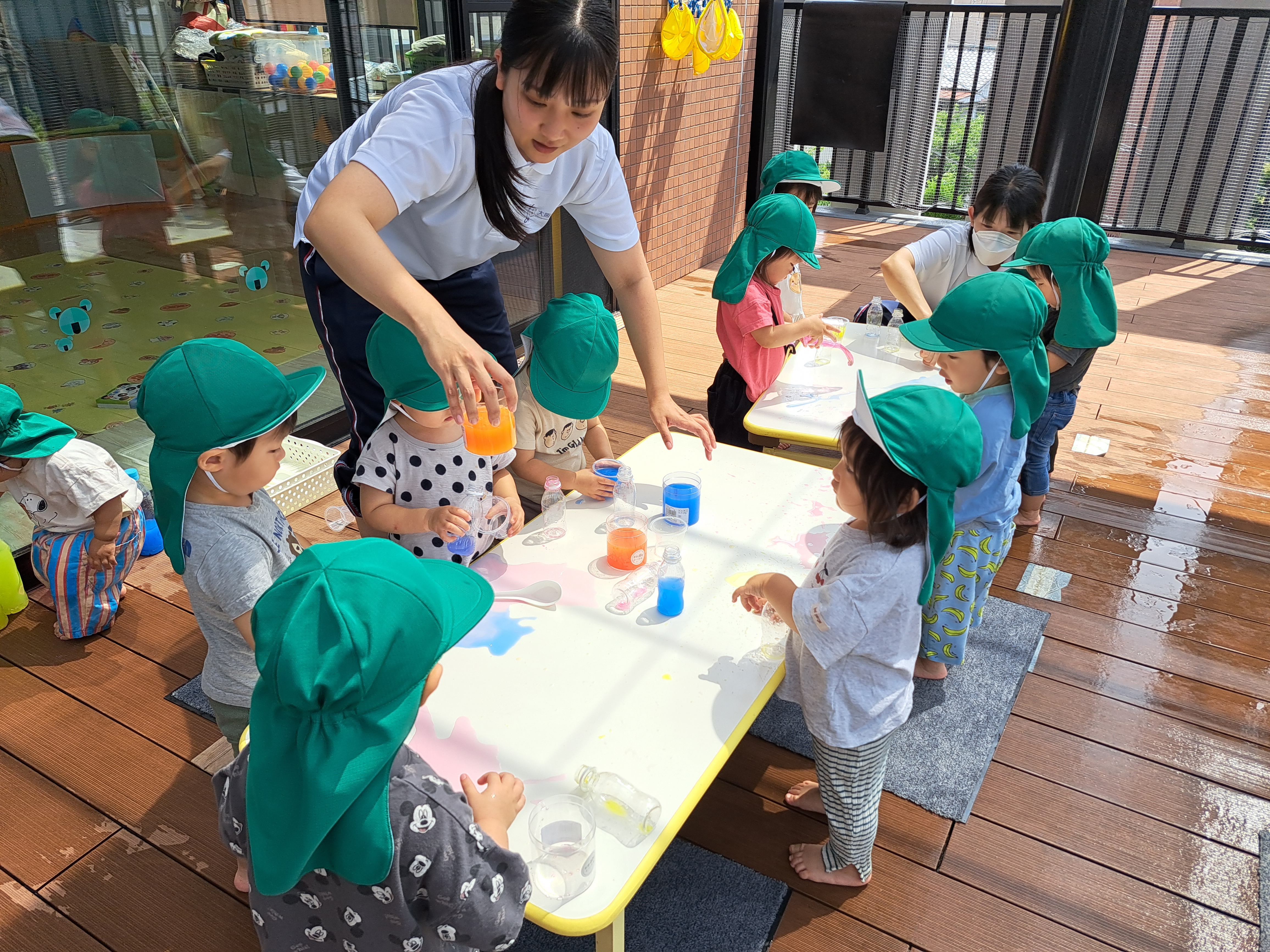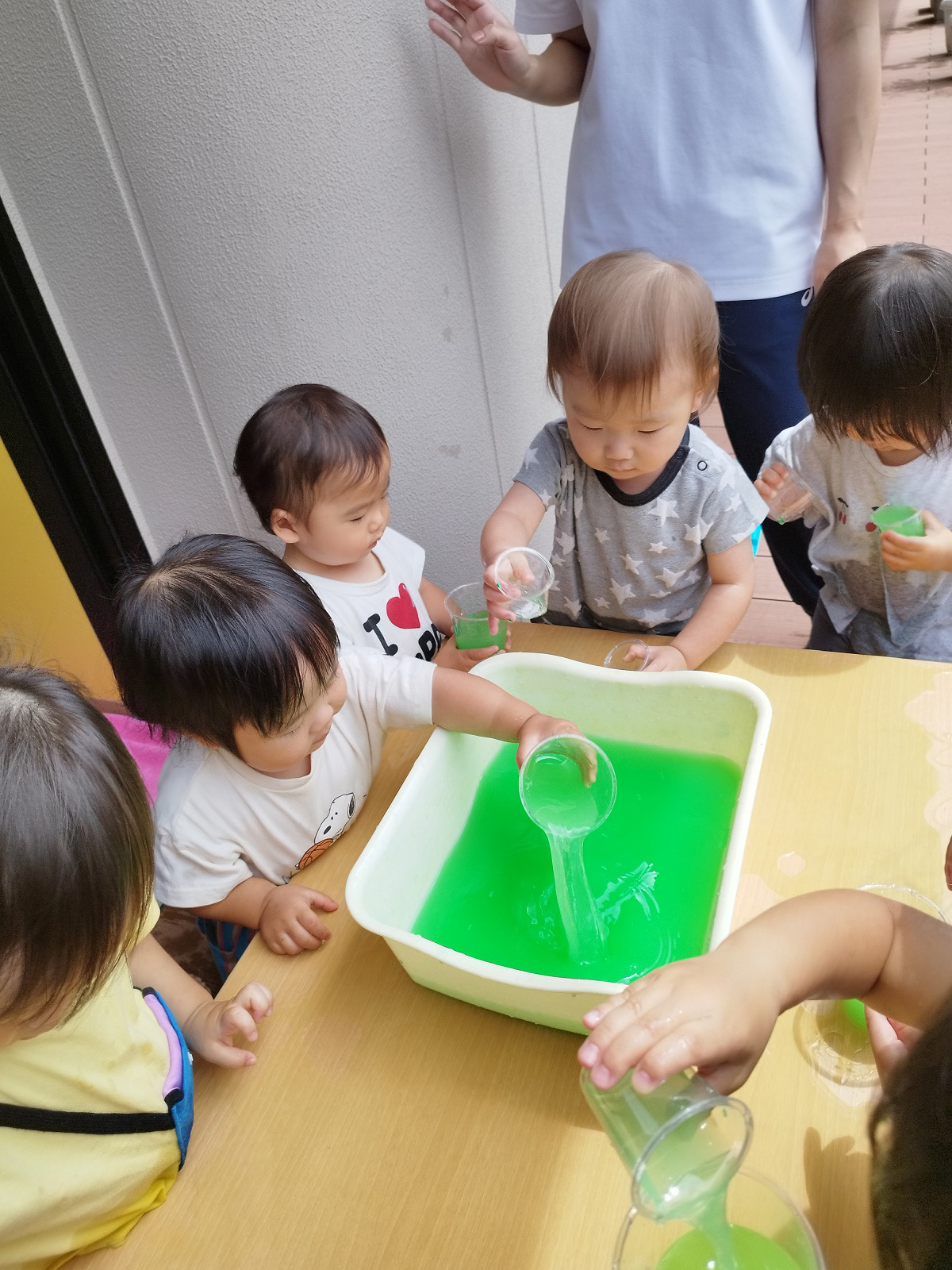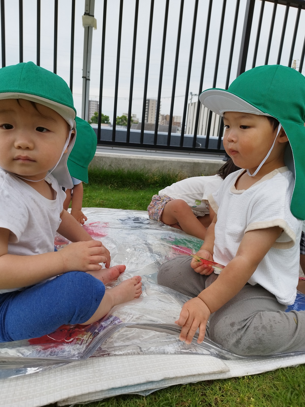 今日のうさぎ組さんは園内散歩♪フォレストホールではあやめ組さんが音楽発表会の練習中!素敵な合奏を聞かせてくれ、自然と体が音楽に合わせて動いていました!ひよこ組さんがテラスで色水遊びをしていたので一緒に参加させてもらいました♪カップですくったり、別の色の所に混ぜたりと楽しんでいました。「そろそろおしまいにしましょう!」と声掛けすると「いやだ!!」と泣き出す子どももいました(笑)ひよこさん!また一緒に遊んでね♪