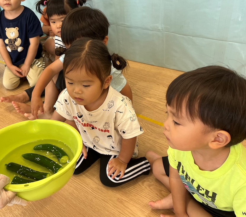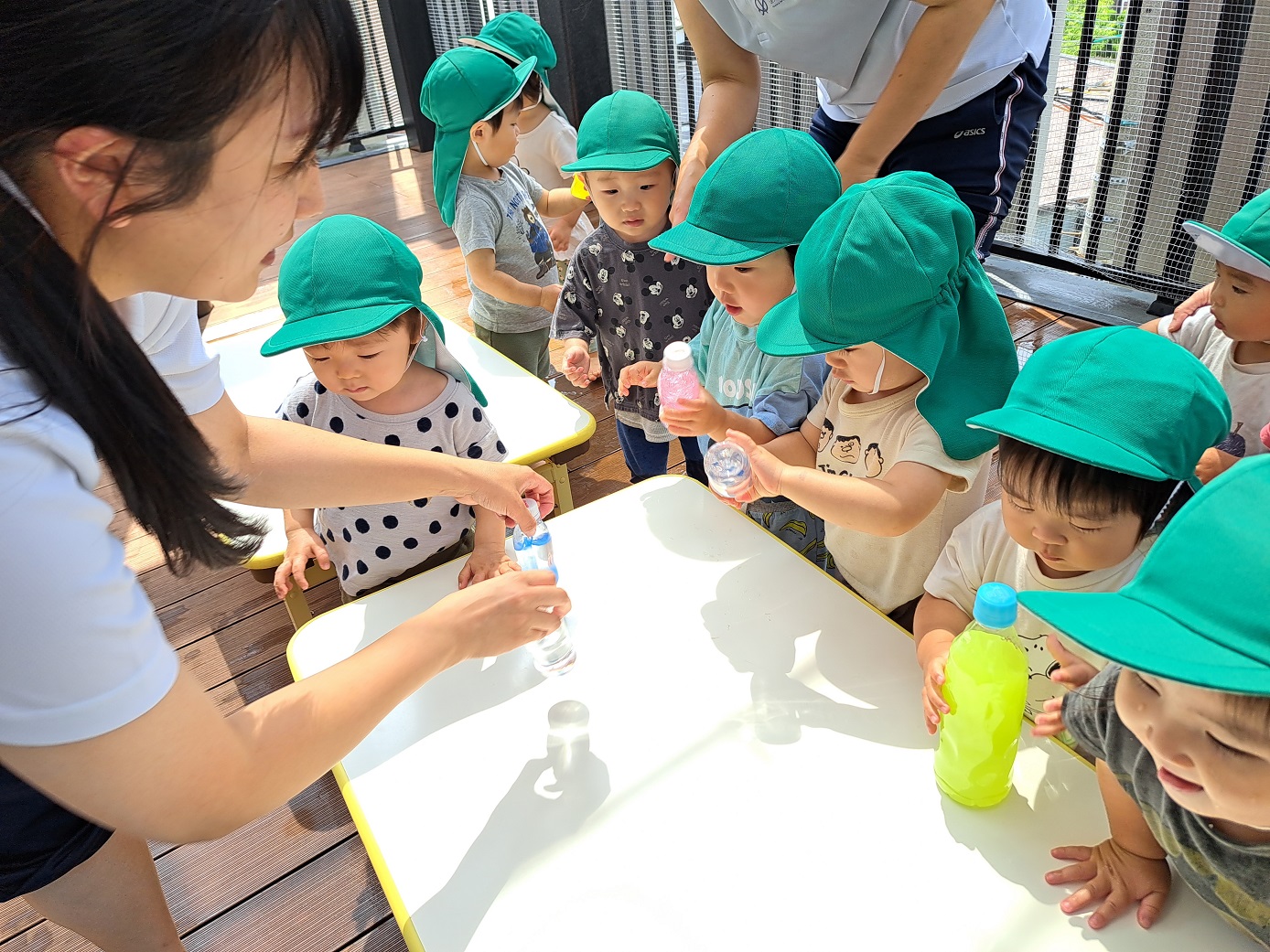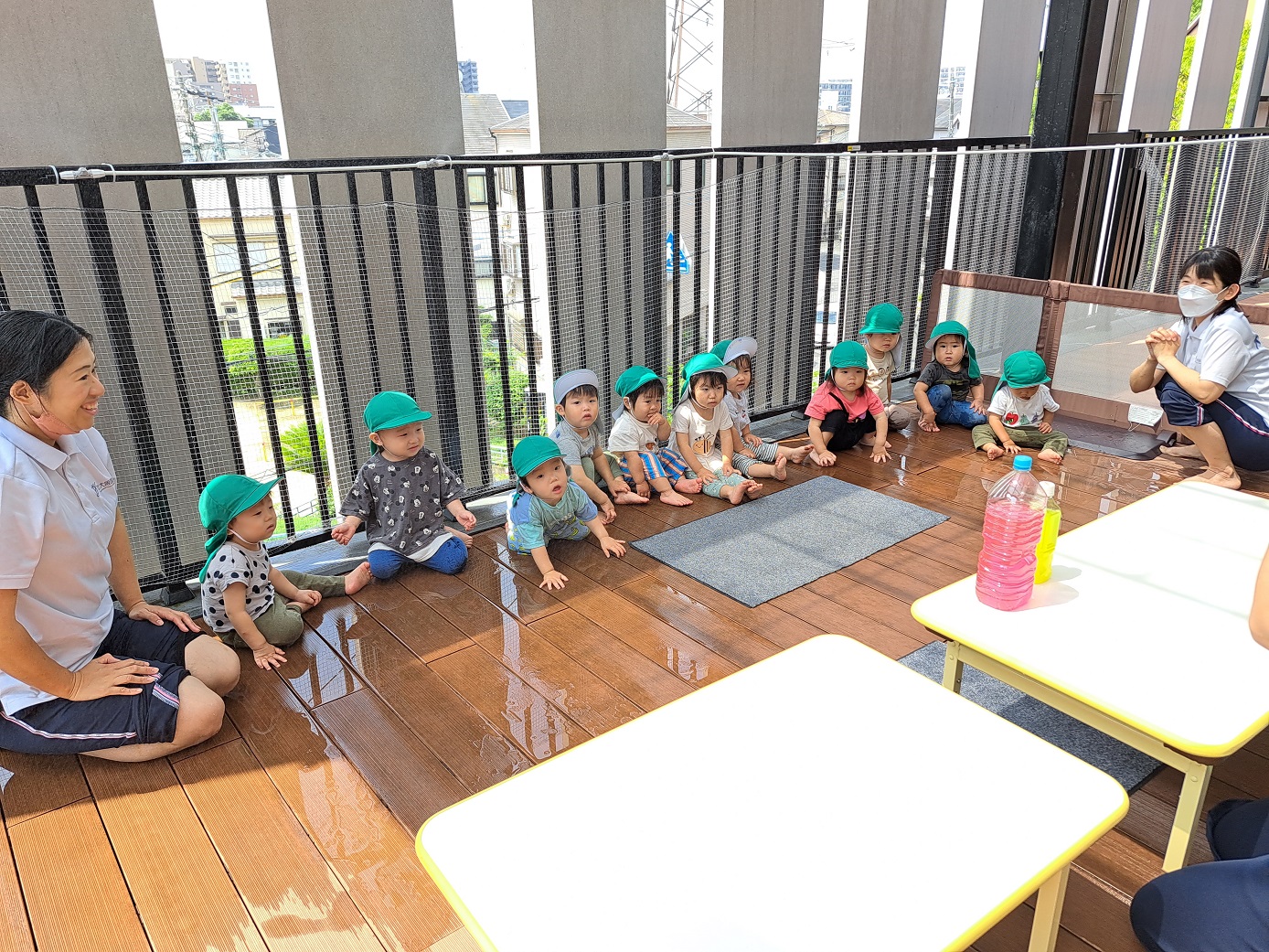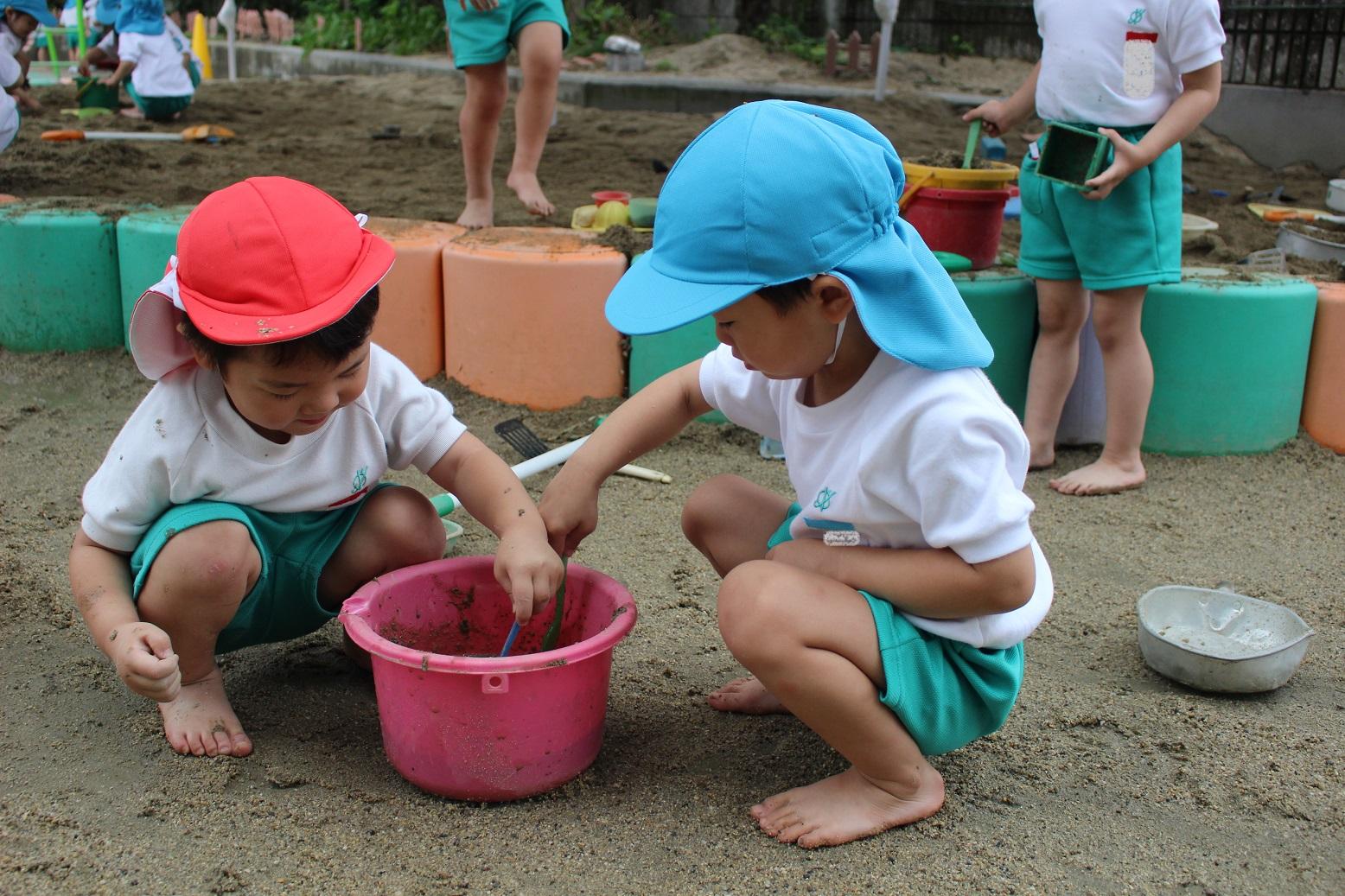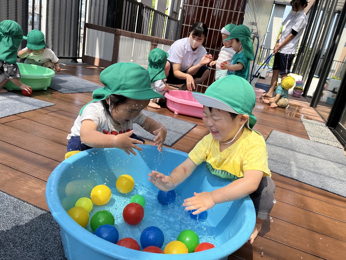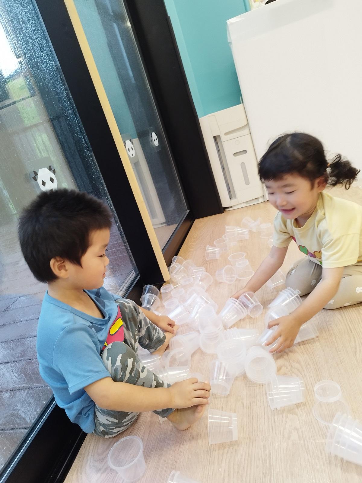 今日のうさぎ組さんは園内散歩♪フォレストホールではあやめ組さんが音楽発表会の練習中!素敵な合奏を聞かせてくれ、自然と体が音楽に合わせて動いていました!ひよこ組さんがテラスで色水遊びをしていたので一緒に参加させてもらいました♪カップですくったり、別の色の所に混ぜたりと楽しんでいました。「そろそろおしまいにしましょう!」と声掛けすると「いやだ!!」と泣き出す子どももいました(笑)ひよこさん!また一緒に遊んでね♪