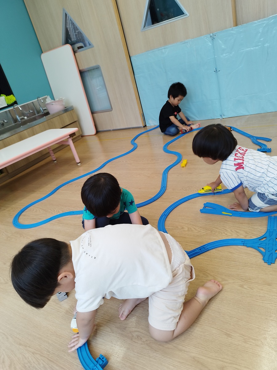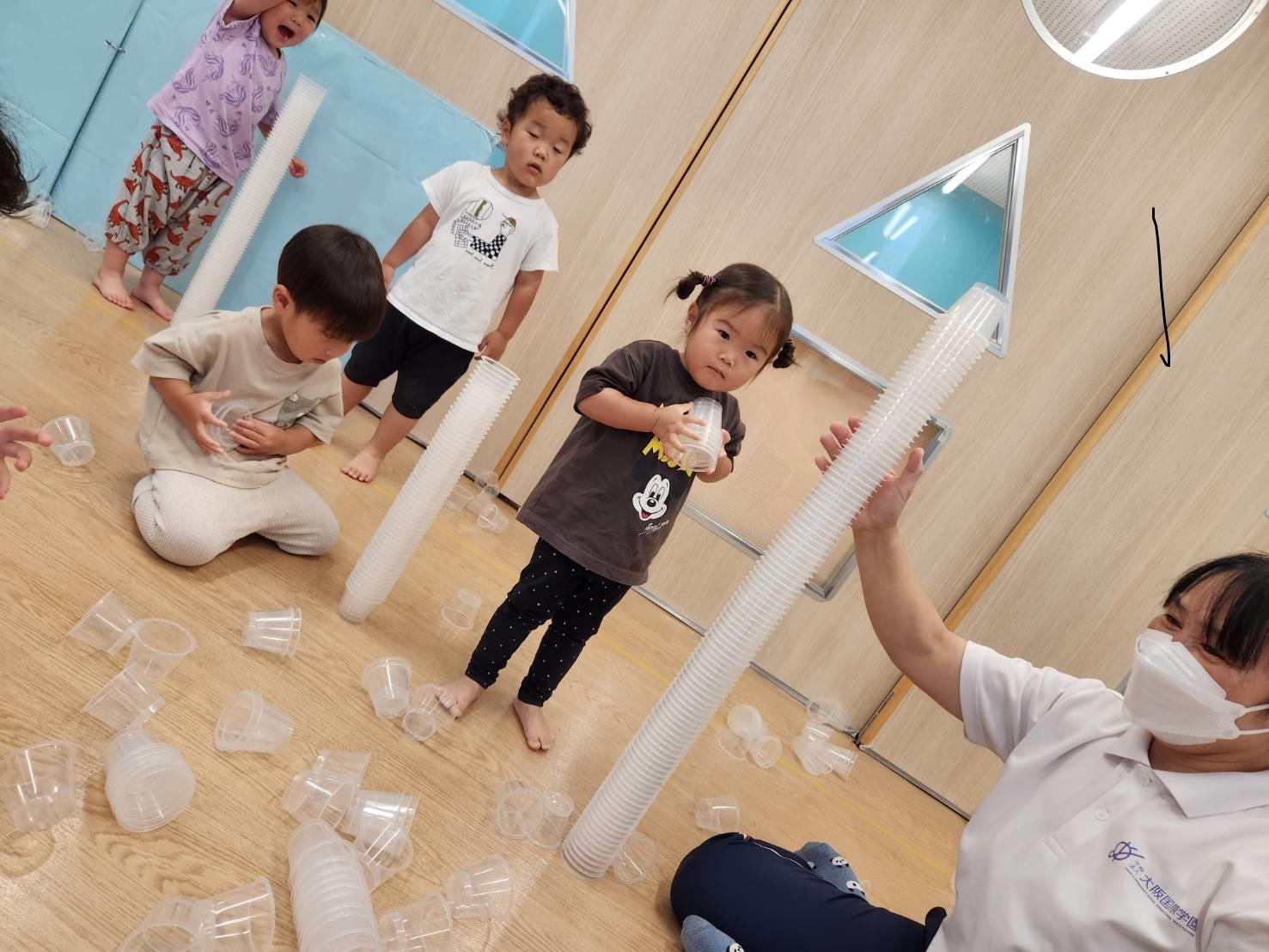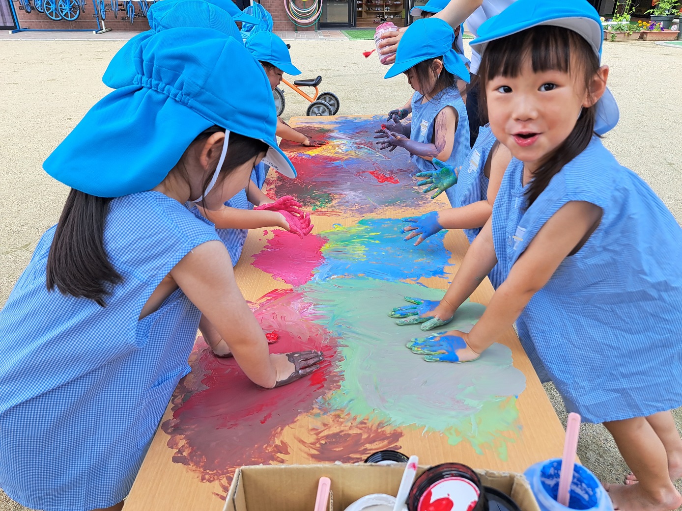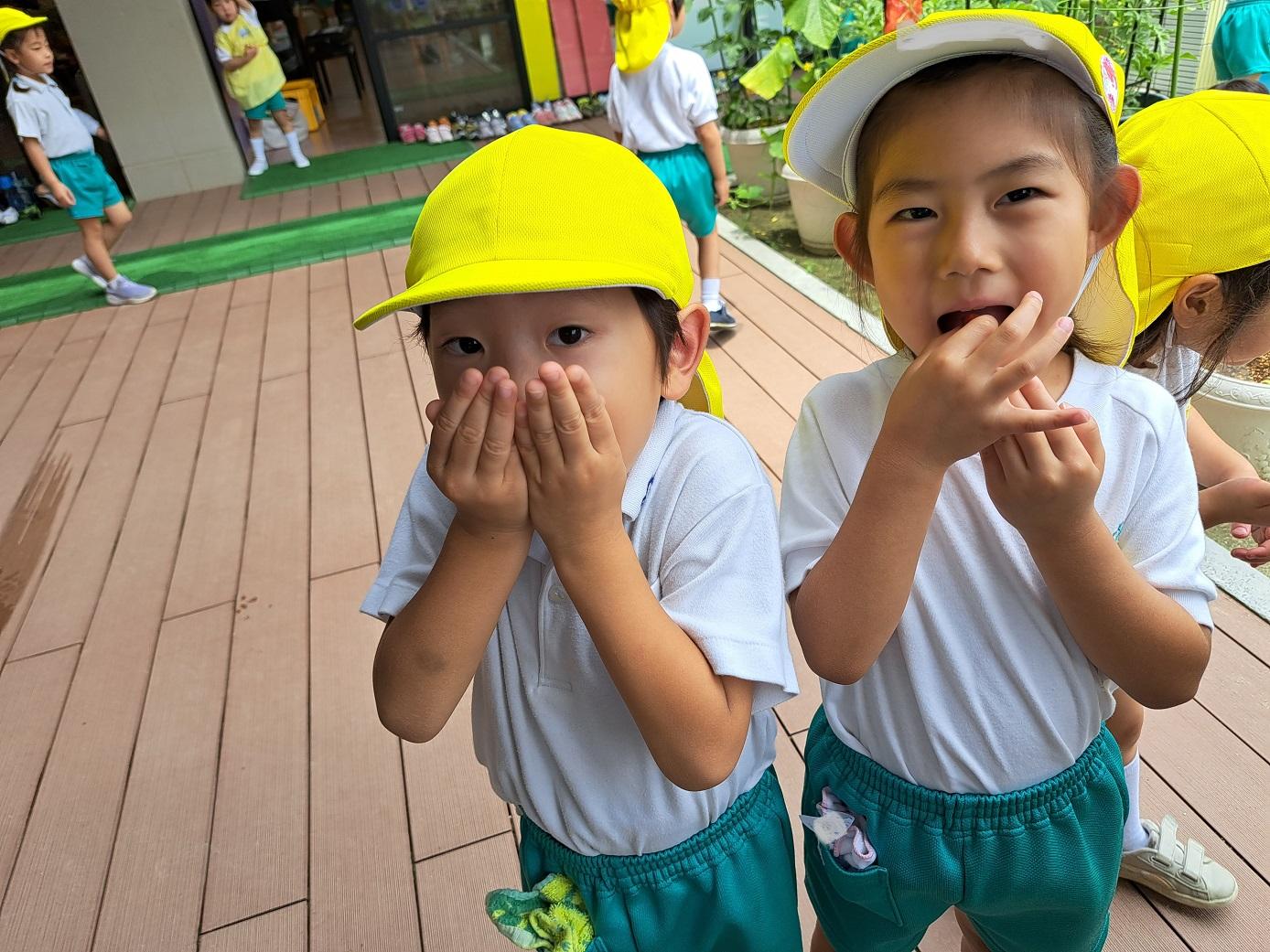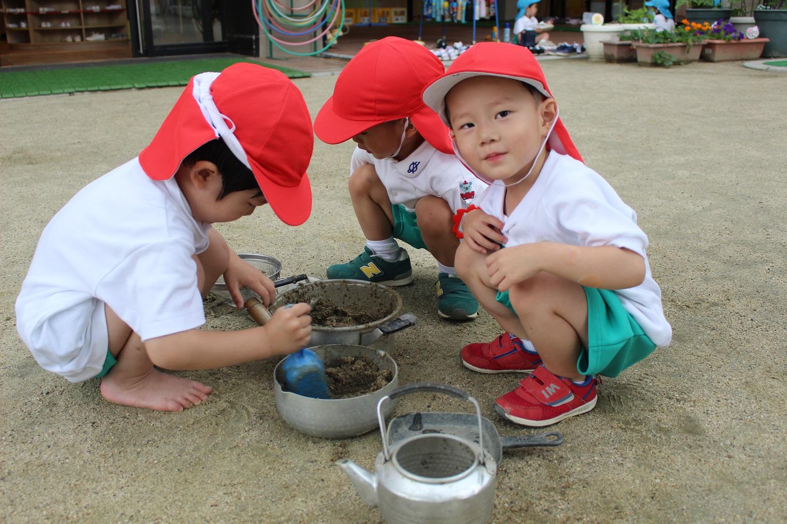 今日のうさぎ組さんは園内散歩♪フォレストホールではあやめ組さんが音楽発表会の練習中!素敵な合奏を聞かせてくれ、自然と体が音楽に合わせて動いていました!ひよこ組さんがテラスで色水遊びをしていたので一緒に参加させてもらいました♪カップですくったり、別の色の所に混ぜたりと楽しんでいました。「そろそろおしまいにしましょう!」と声掛けすると「いやだ!!」と泣き出す子どももいました(笑)ひよこさん!また一緒に遊んでね♪