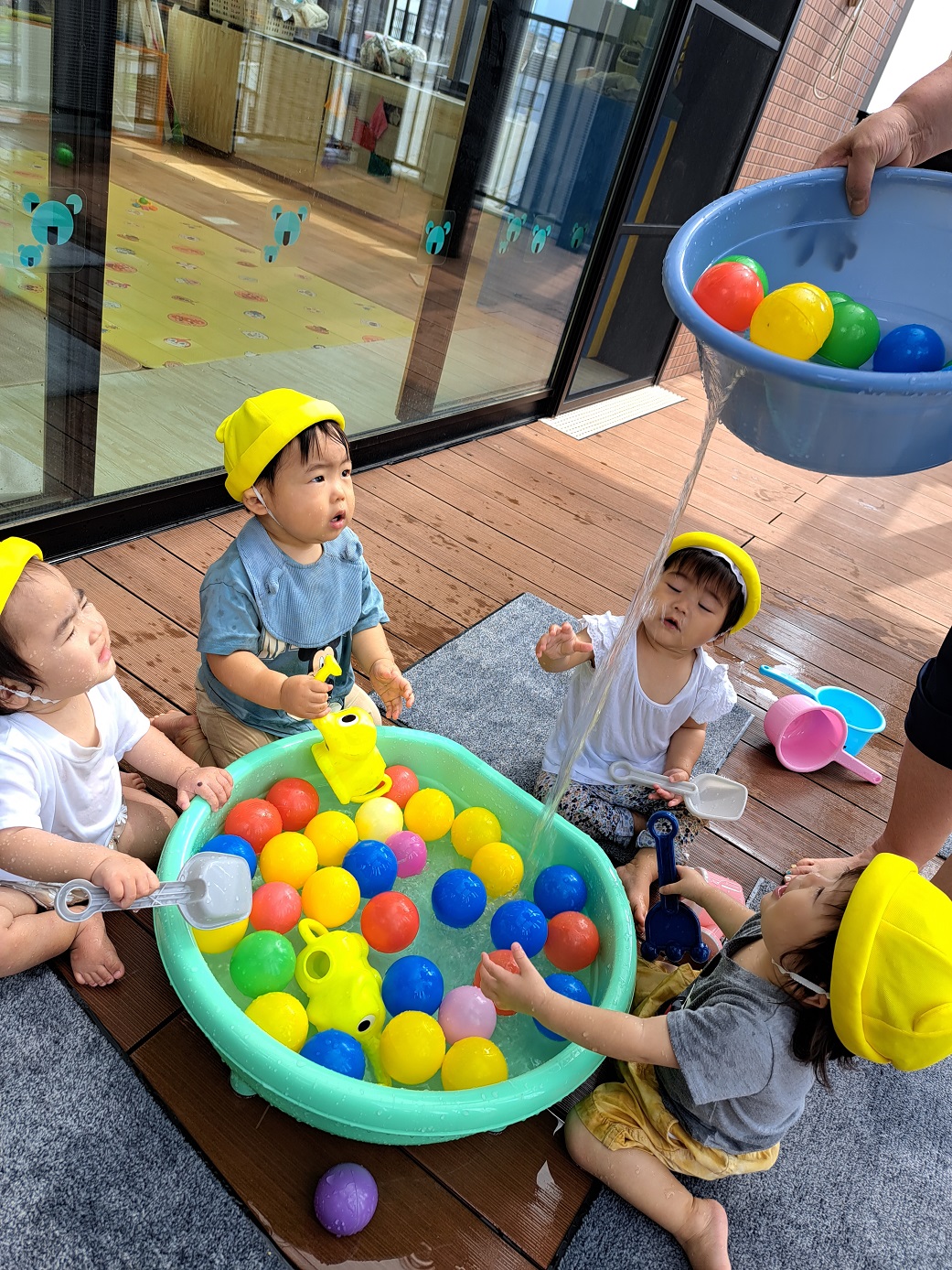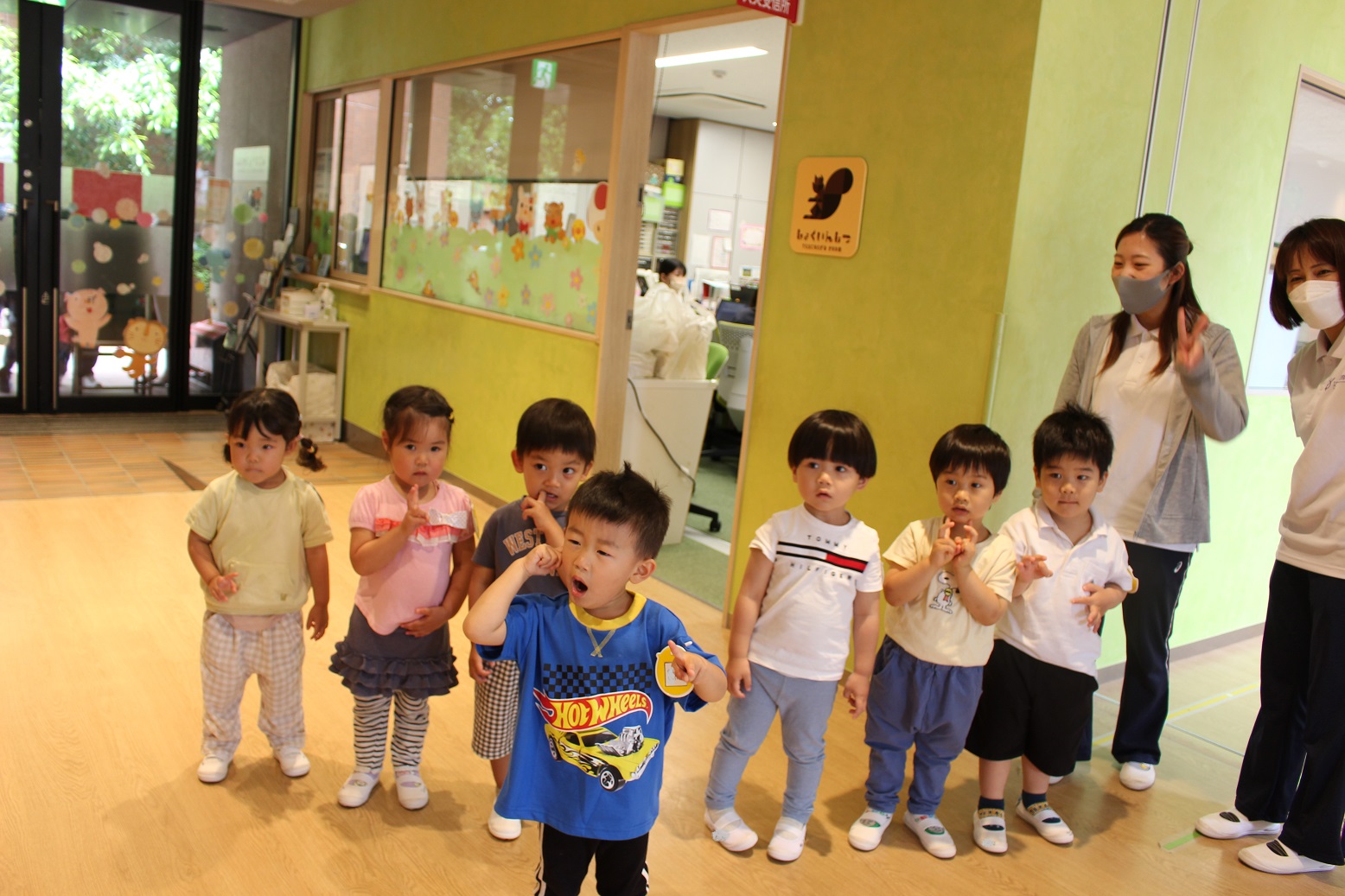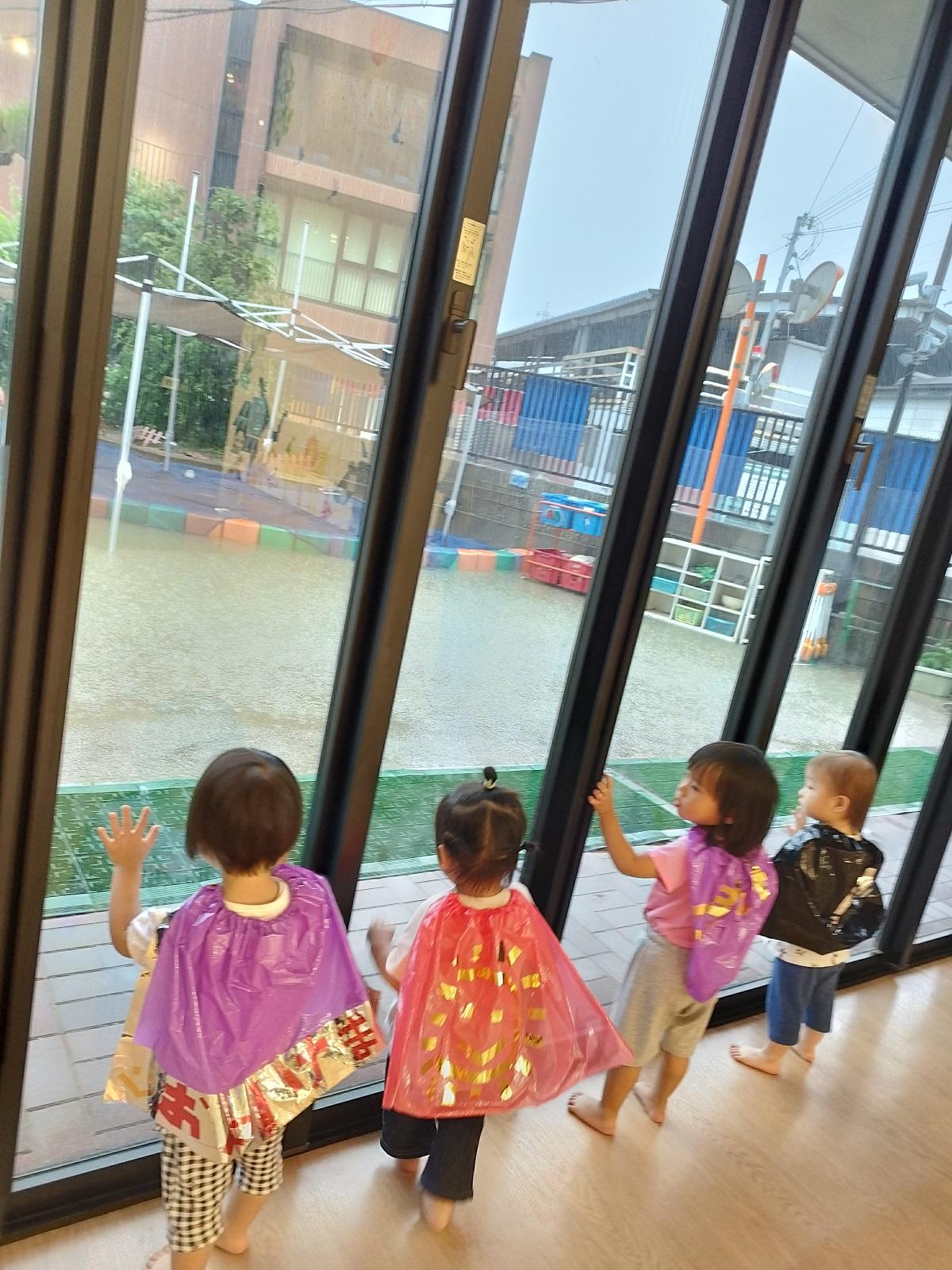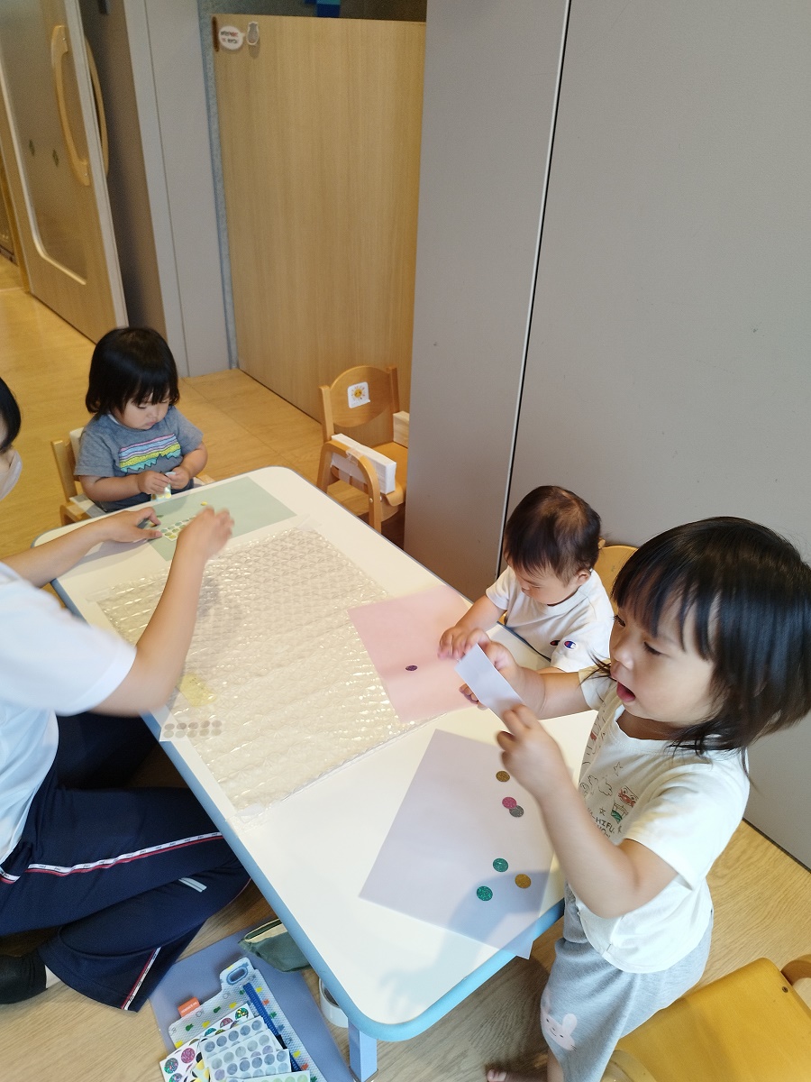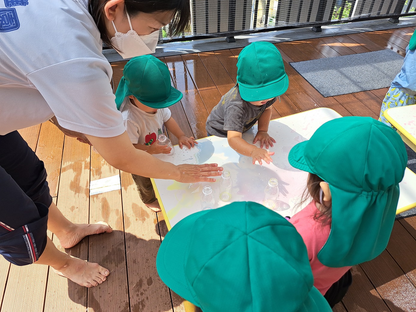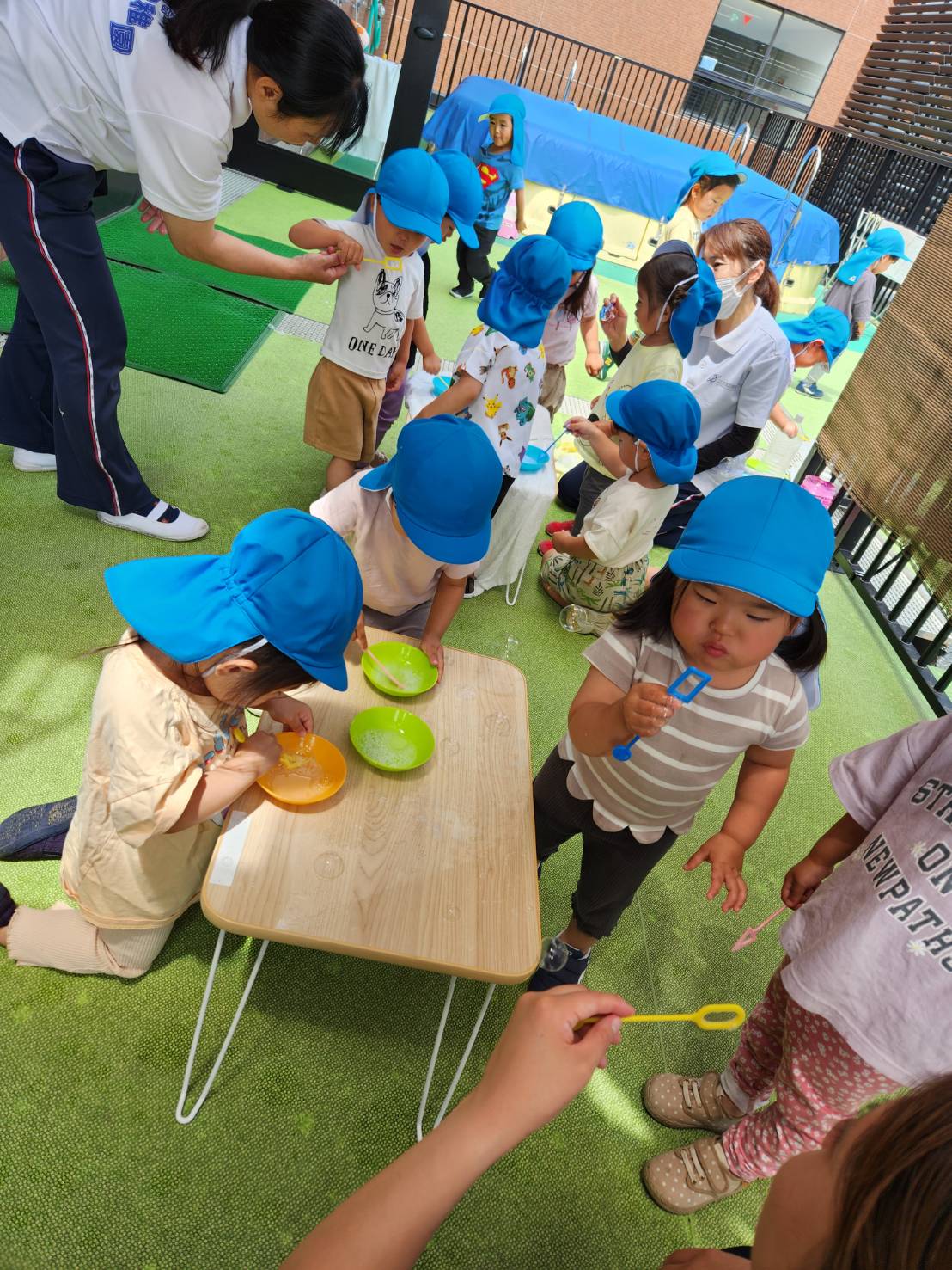 今日のうさぎ組さんは園内散歩♪フォレストホールではあやめ組さんが音楽発表会の練習中!素敵な合奏を聞かせてくれ、自然と体が音楽に合わせて動いていました!ひよこ組さんがテラスで色水遊びをしていたので一緒に参加させてもらいました♪カップですくったり、別の色の所に混ぜたりと楽しんでいました。「そろそろおしまいにしましょう!」と声掛けすると「いやだ!!」と泣き出す子どももいました(笑)ひよこさん!また一緒に遊んでね♪
