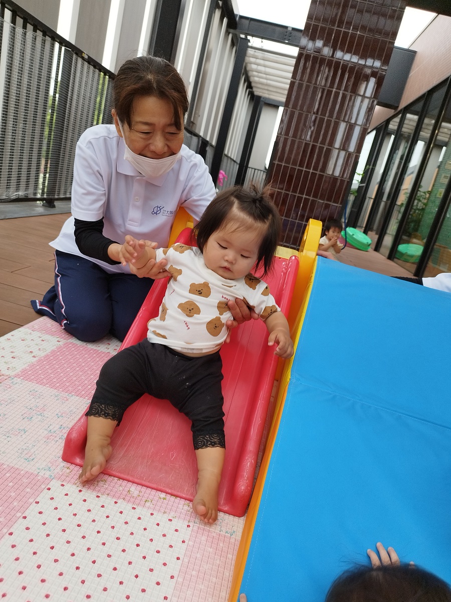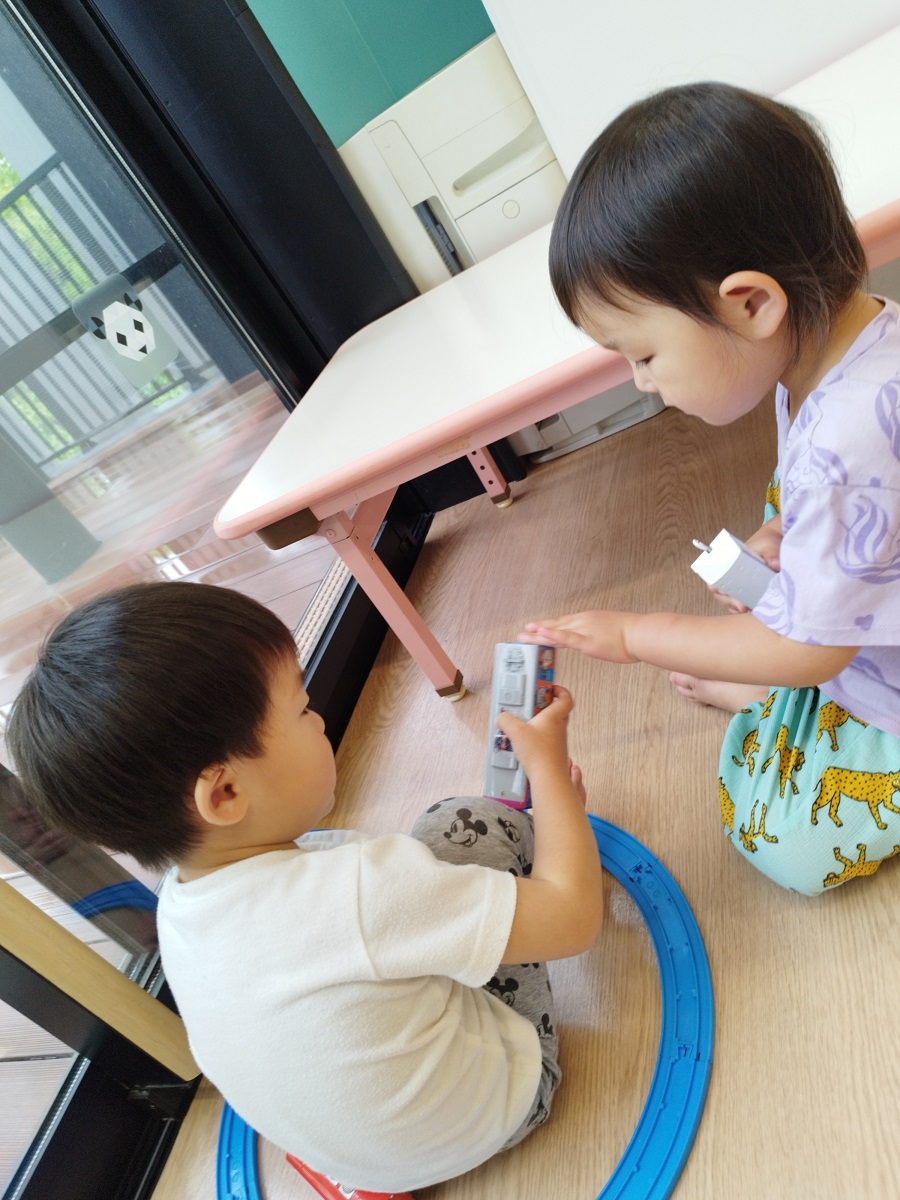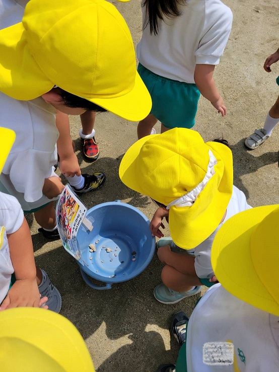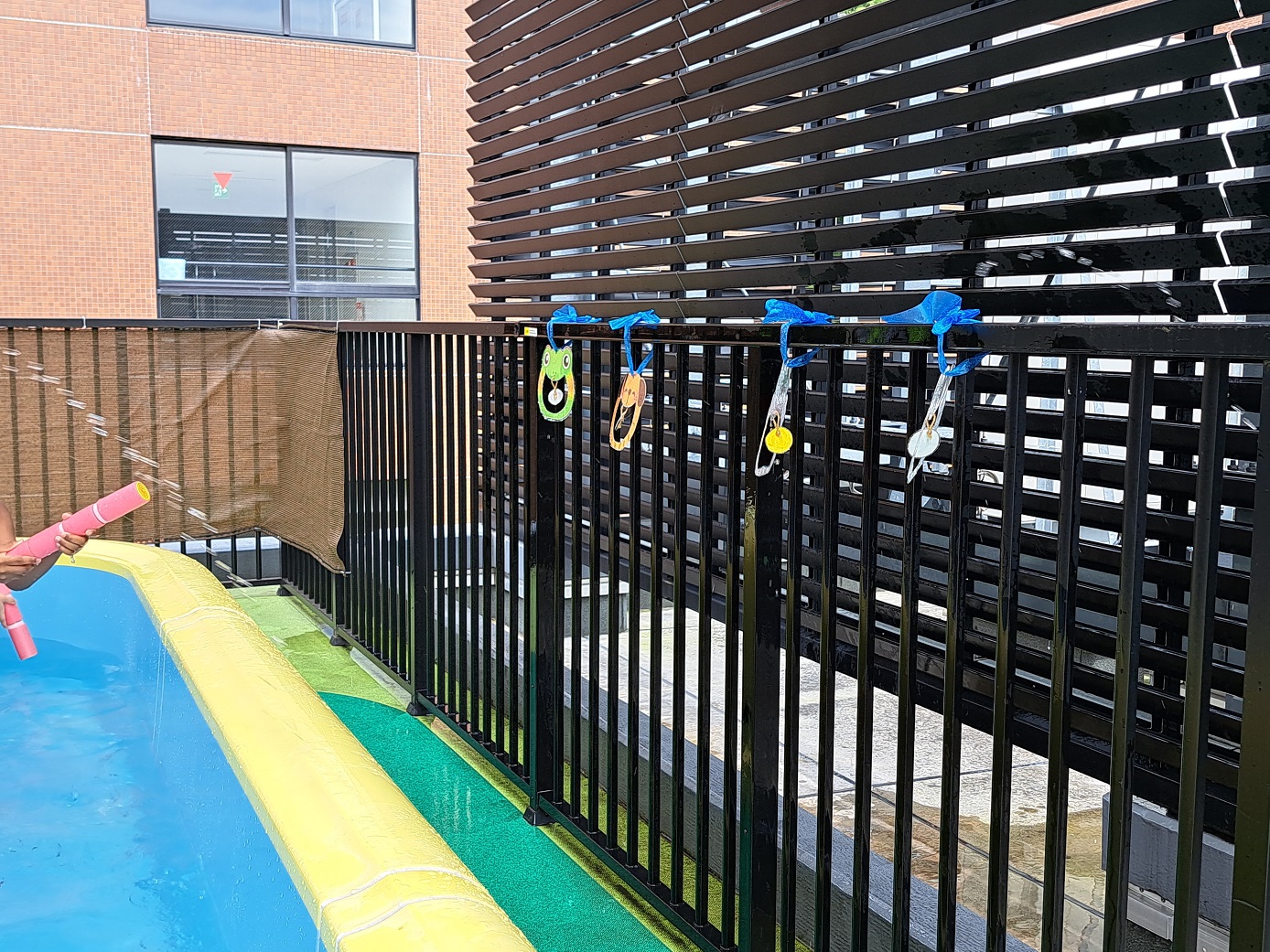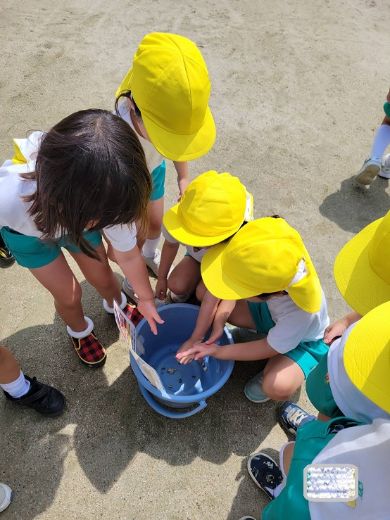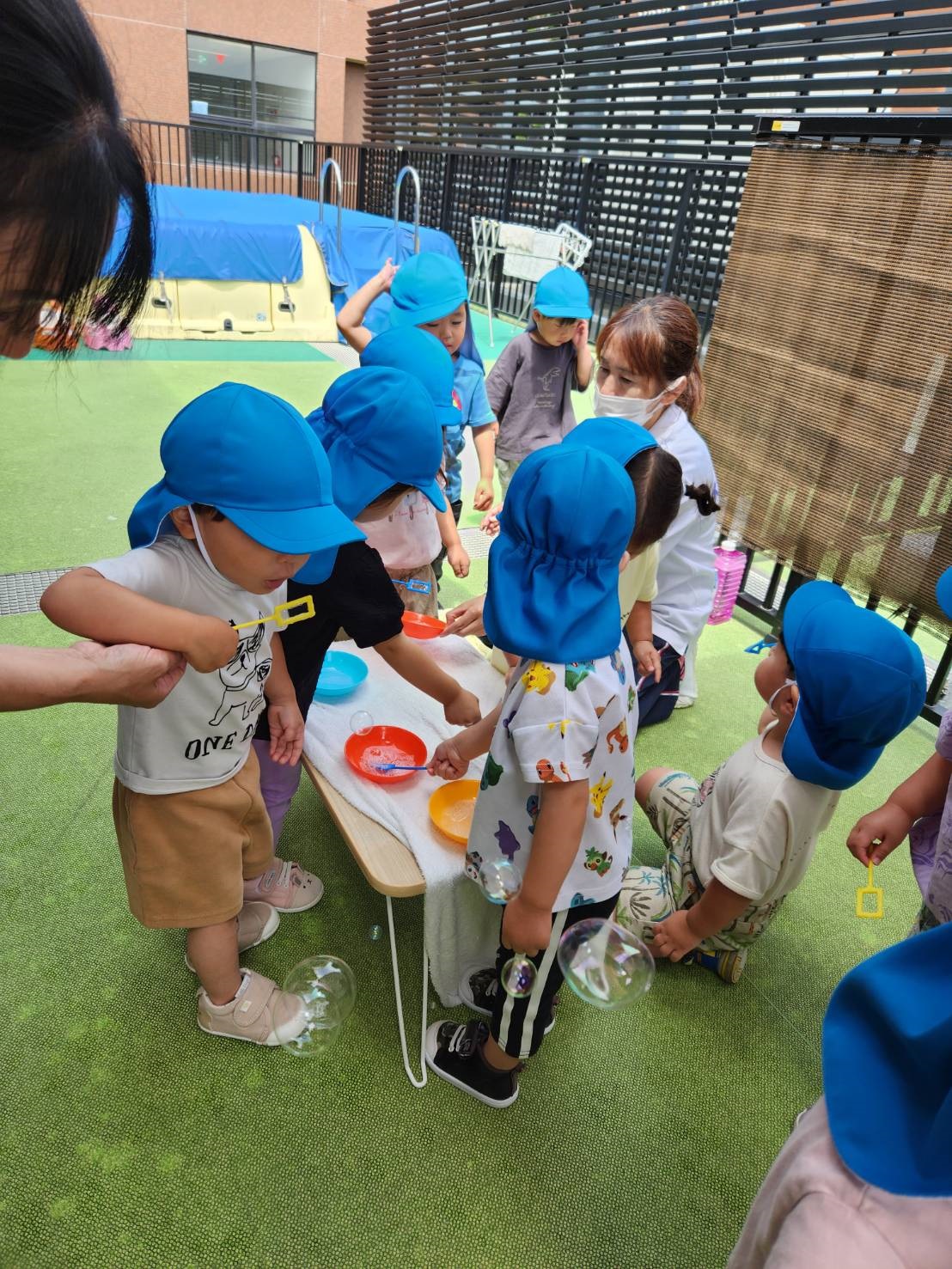 今日のうさぎ組さんは園内散歩♪フォレストホールではあやめ組さんが音楽発表会の練習中!素敵な合奏を聞かせてくれ、自然と体が音楽に合わせて動いていました!ひよこ組さんがテラスで色水遊びをしていたので一緒に参加させてもらいました♪カップですくったり、別の色の所に混ぜたりと楽しんでいました。「そろそろおしまいにしましょう!」と声掛けすると「いやだ!!」と泣き出す子どももいました(笑)ひよこさん!また一緒に遊んでね♪
