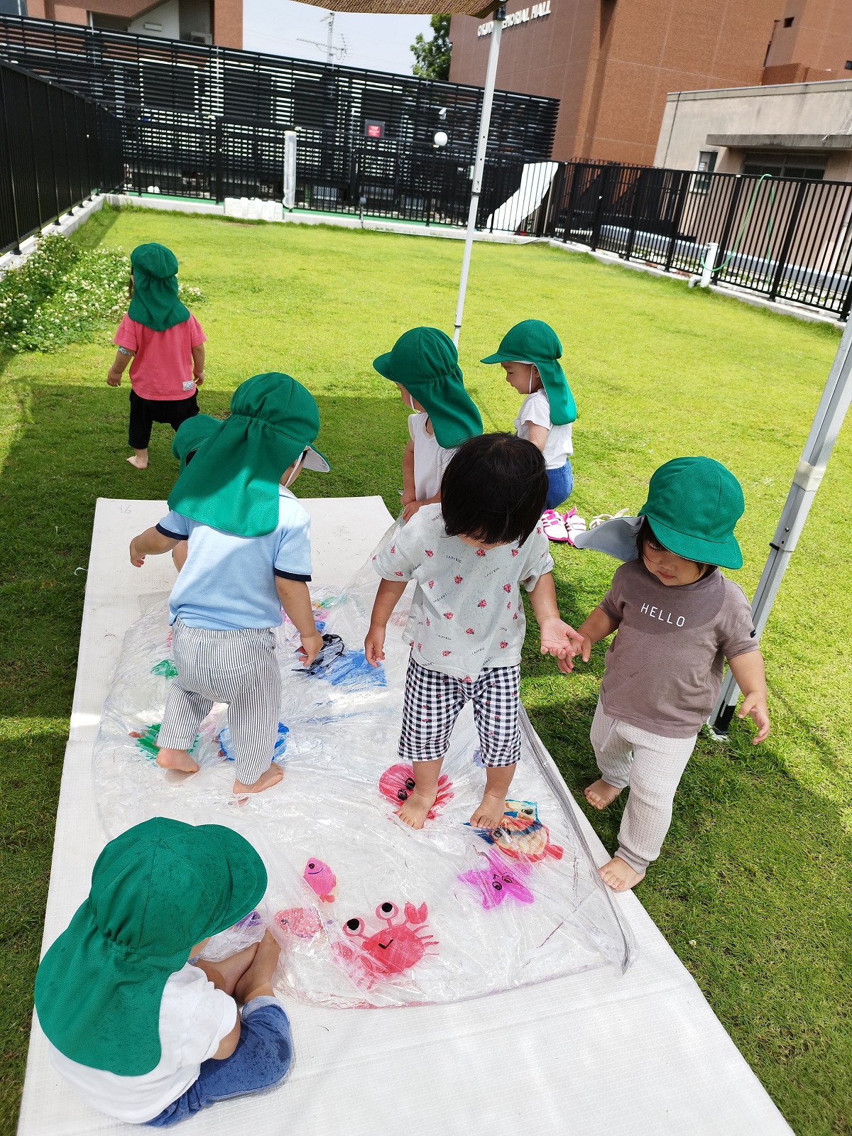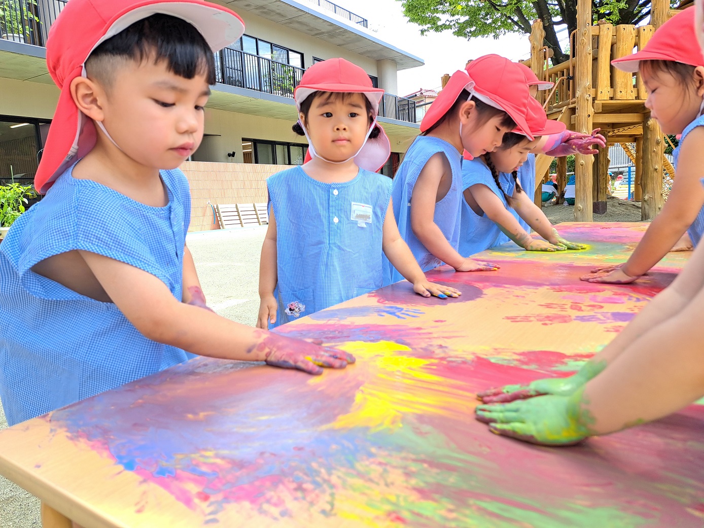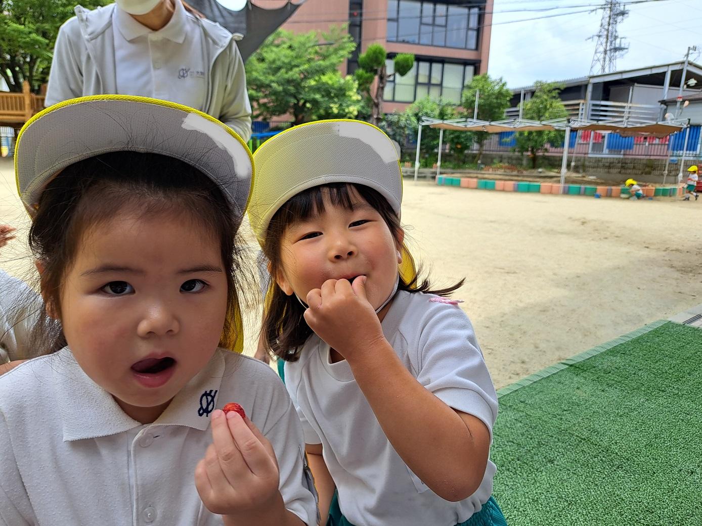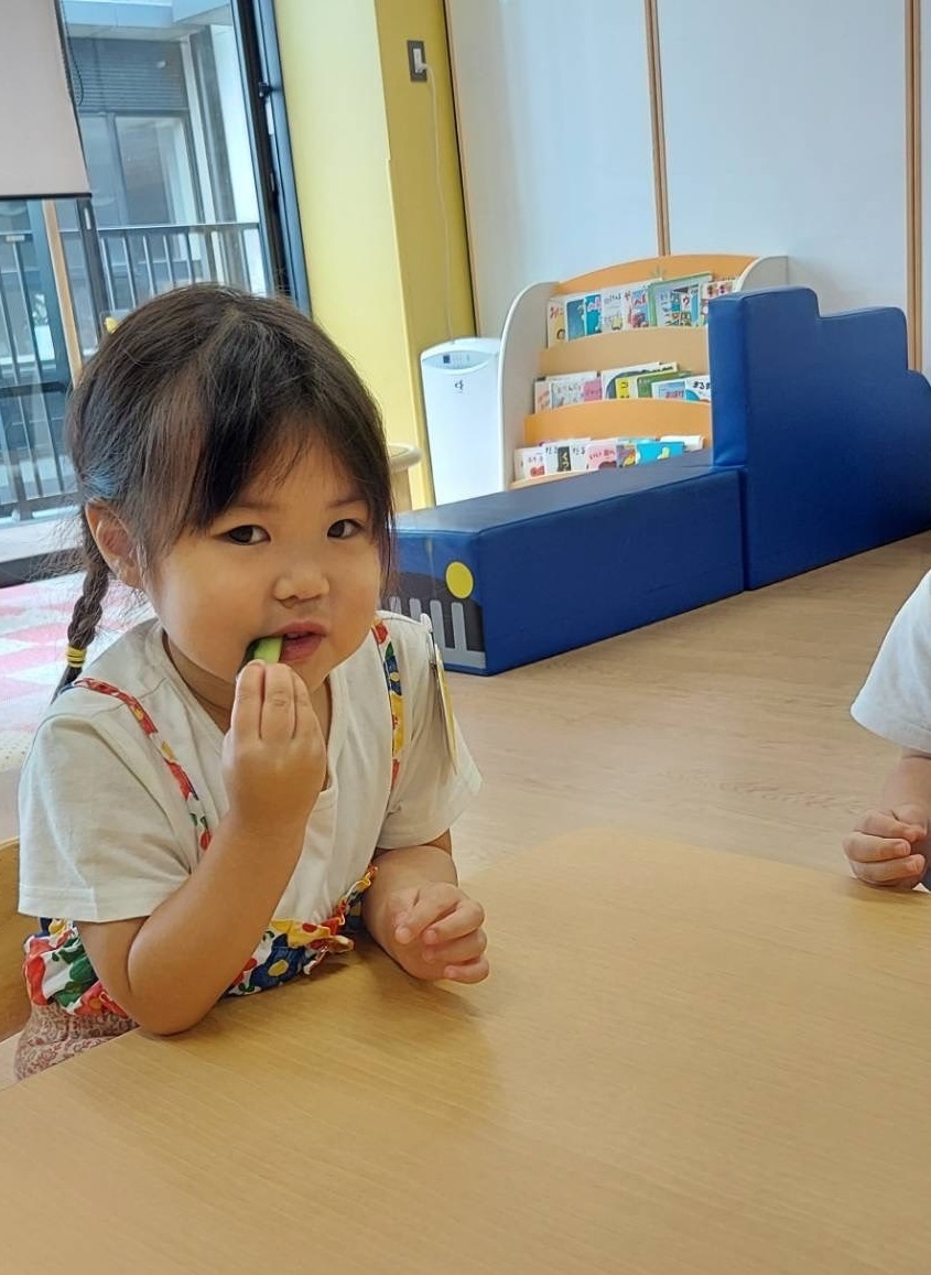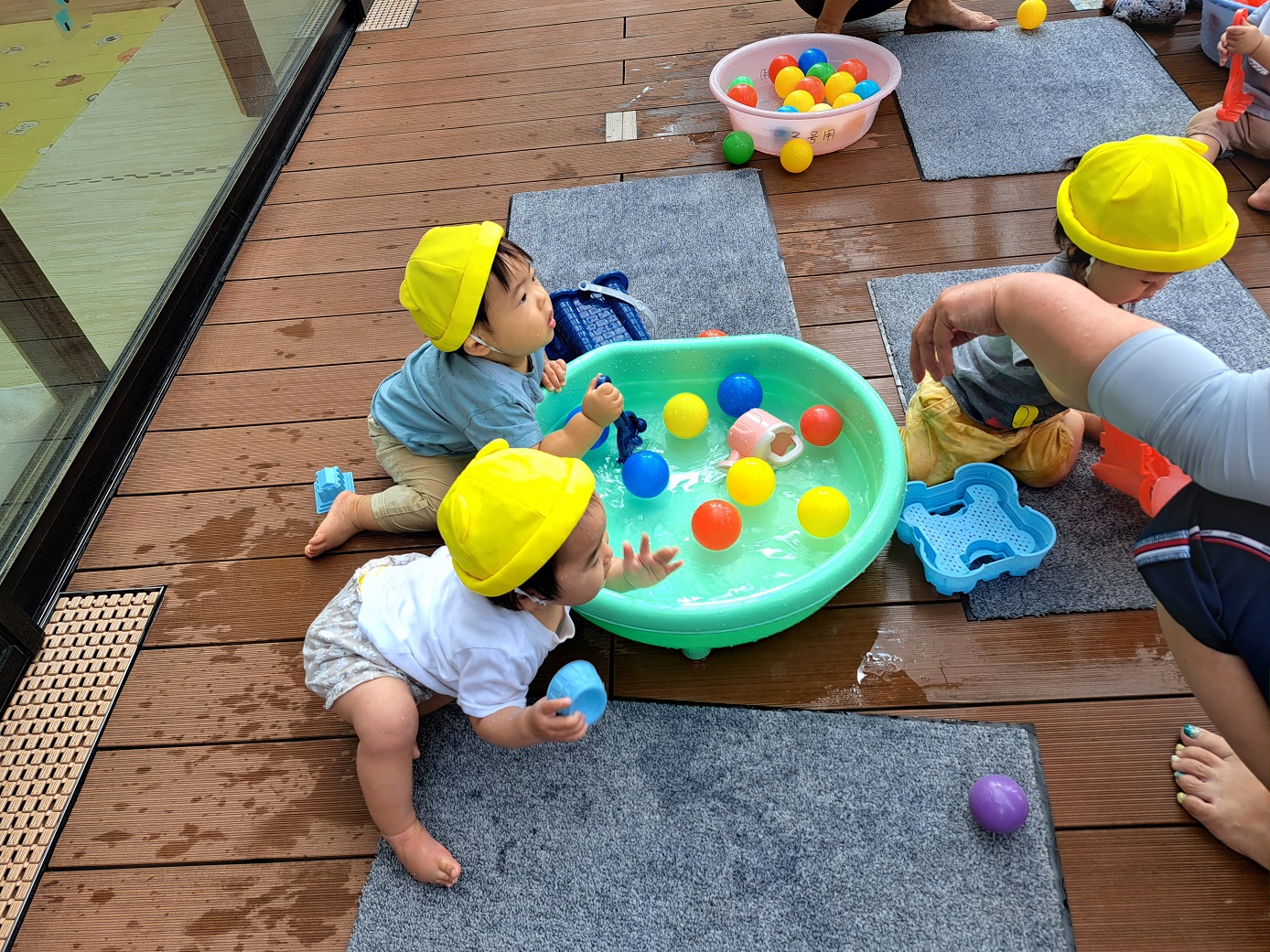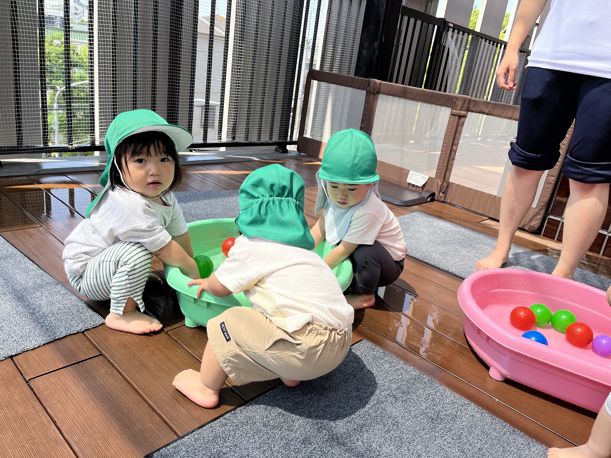 今日のうさぎ組さんは園内散歩♪フォレストホールではあやめ組さんが音楽発表会の練習中!素敵な合奏を聞かせてくれ、自然と体が音楽に合わせて動いていました!ひよこ組さんがテラスで色水遊びをしていたので一緒に参加させてもらいました♪カップですくったり、別の色の所に混ぜたりと楽しんでいました。「そろそろおしまいにしましょう!」と声掛けすると「いやだ!!」と泣き出す子どももいました(笑)ひよこさん!また一緒に遊んでね♪