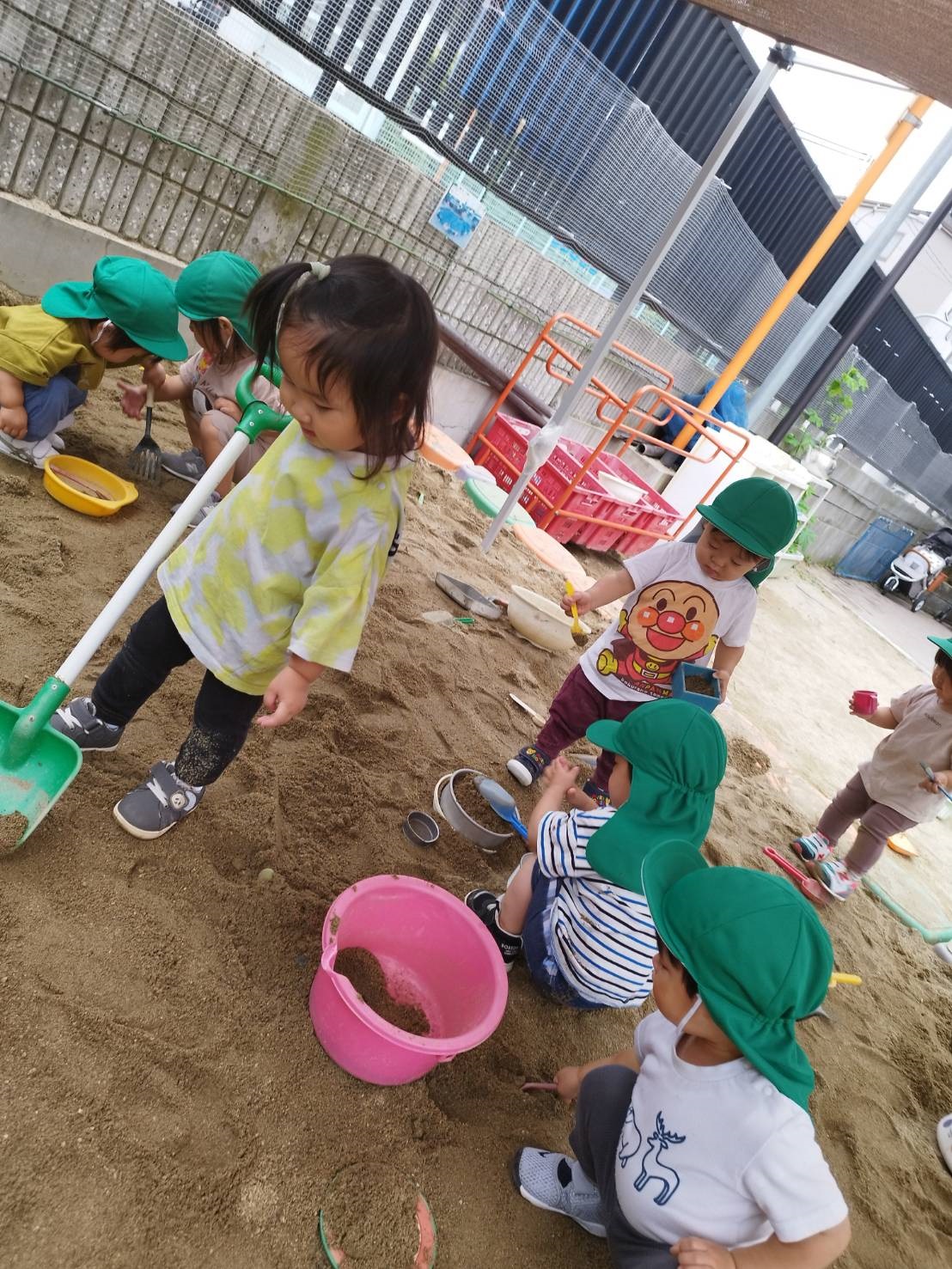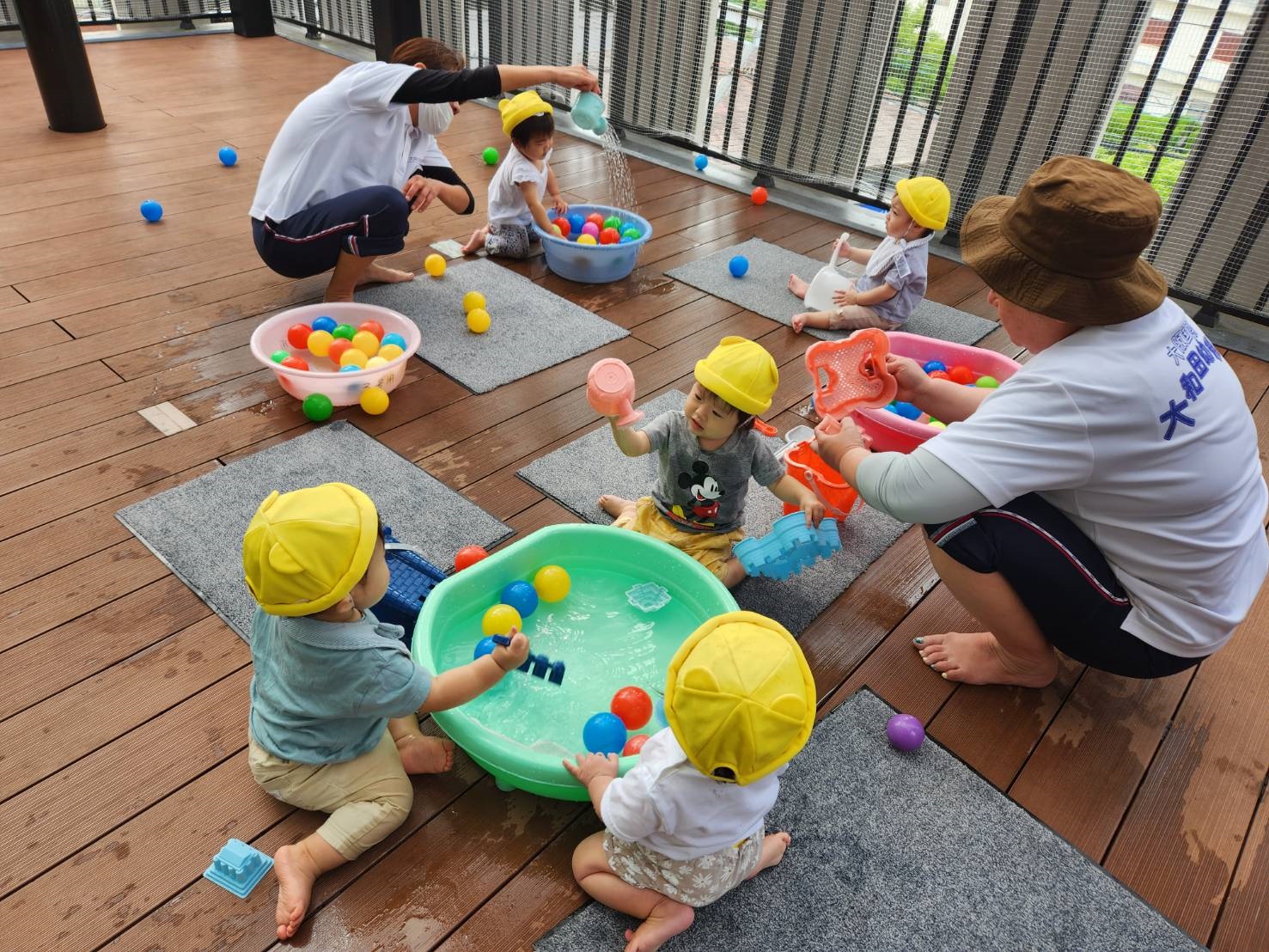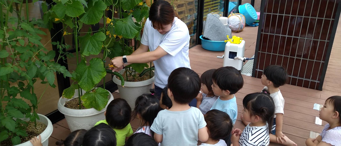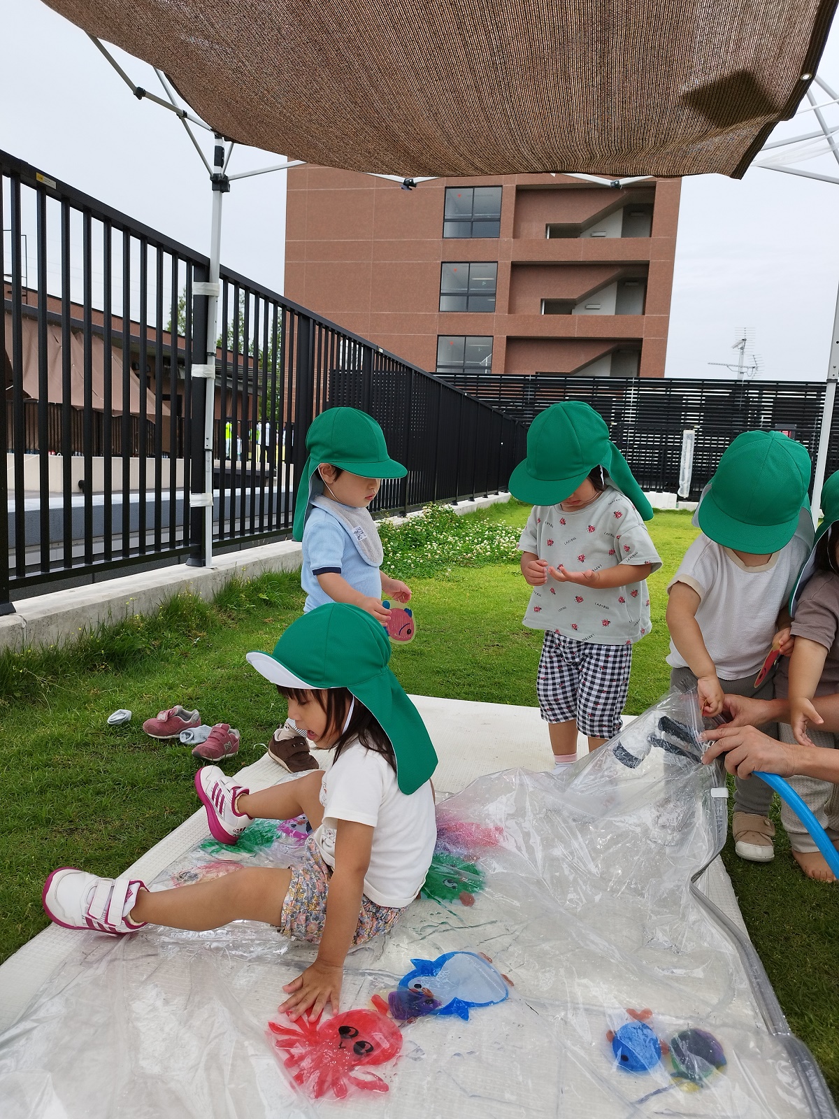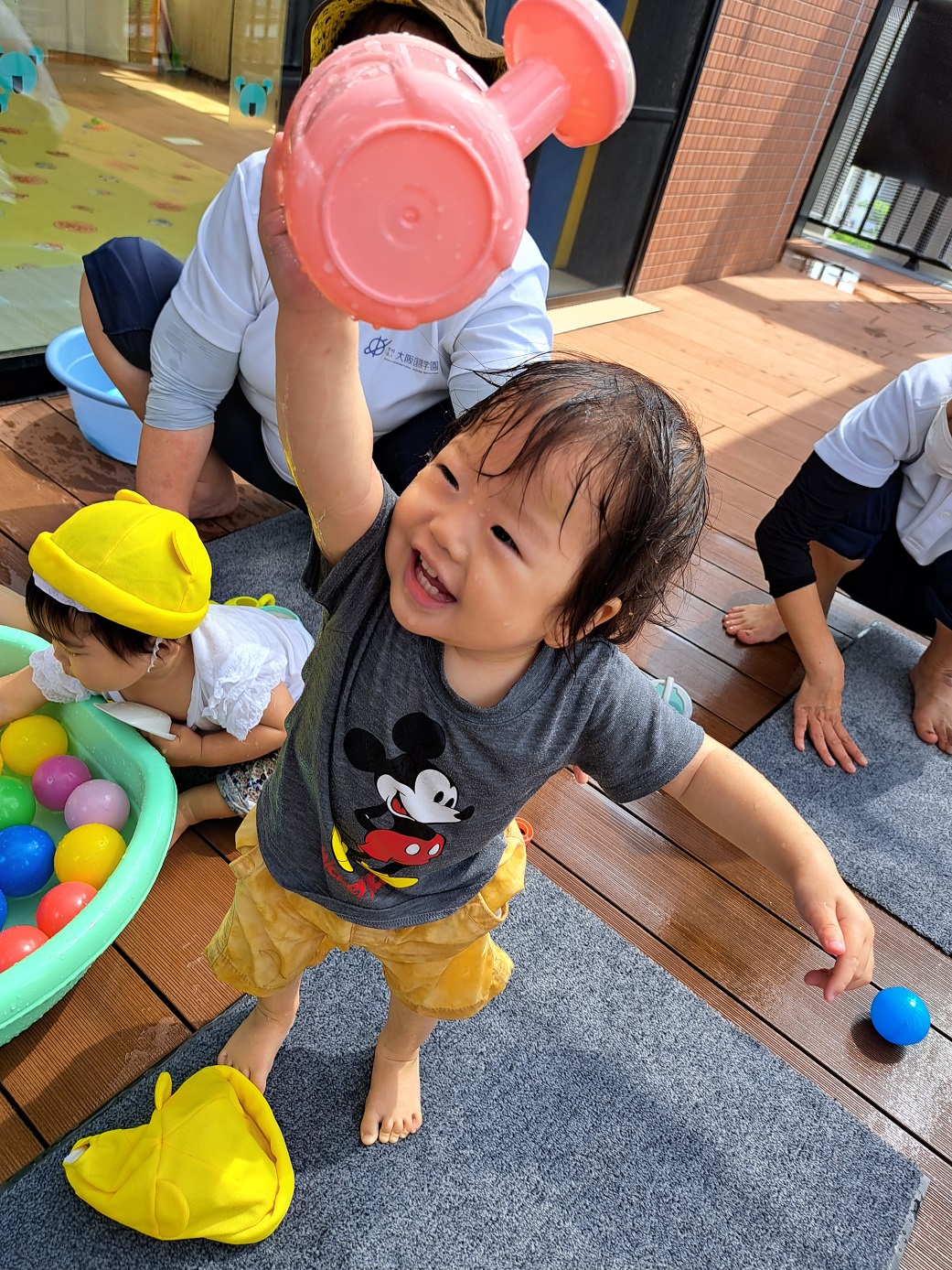 今日のうさぎ組さんは園内散歩♪フォレストホールではあやめ組さんが音楽発表会の練習中!素敵な合奏を聞かせてくれ、自然と体が音楽に合わせて動いていました!ひよこ組さんがテラスで色水遊びをしていたので一緒に参加させてもらいました♪カップですくったり、別の色の所に混ぜたりと楽しんでいました。「そろそろおしまいにしましょう!」と声掛けすると「いやだ!!」と泣き出す子どももいました(笑)ひよこさん!また一緒に遊んでね♪