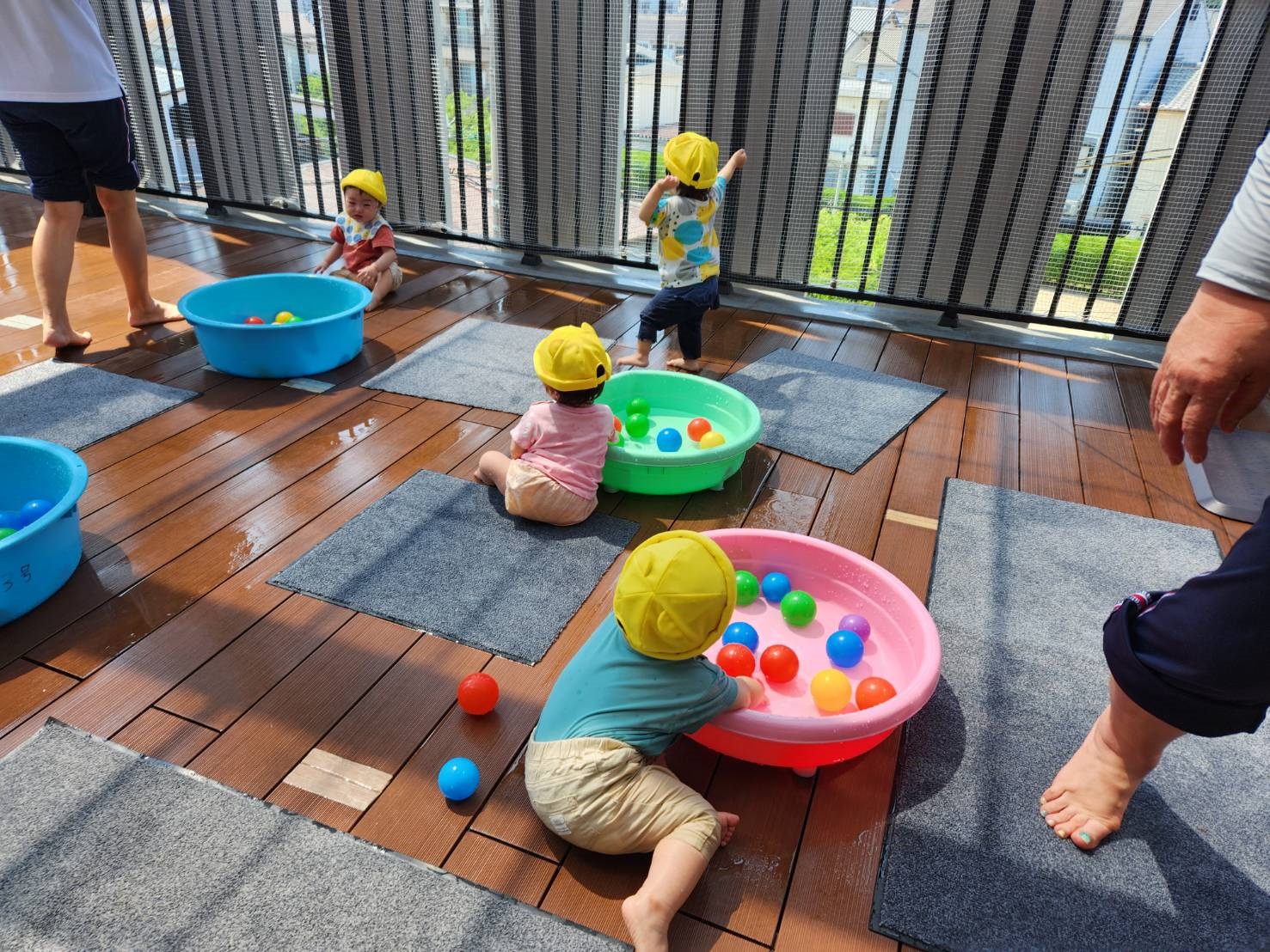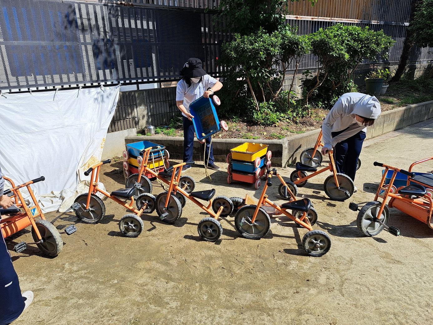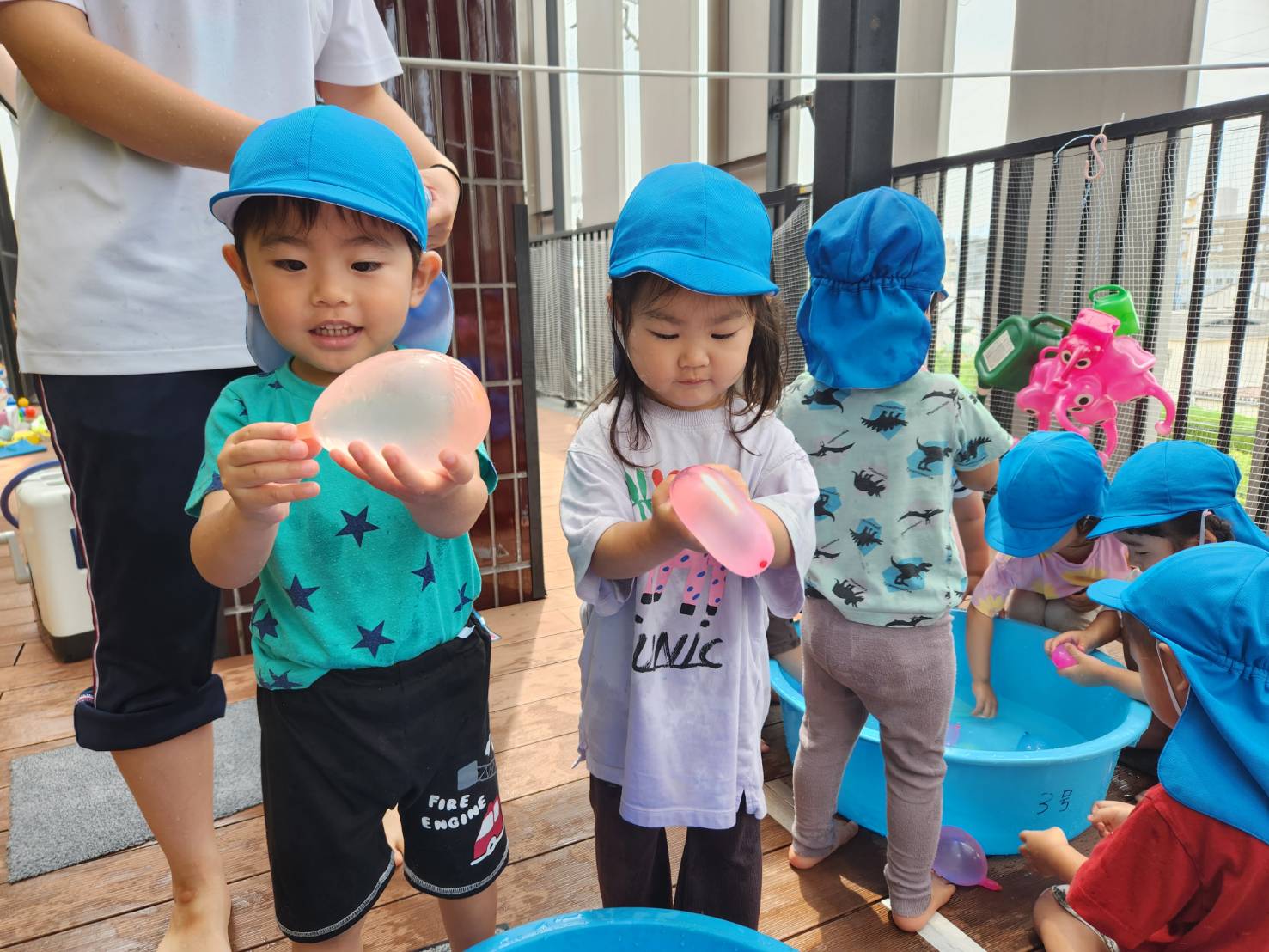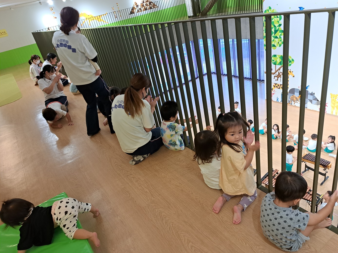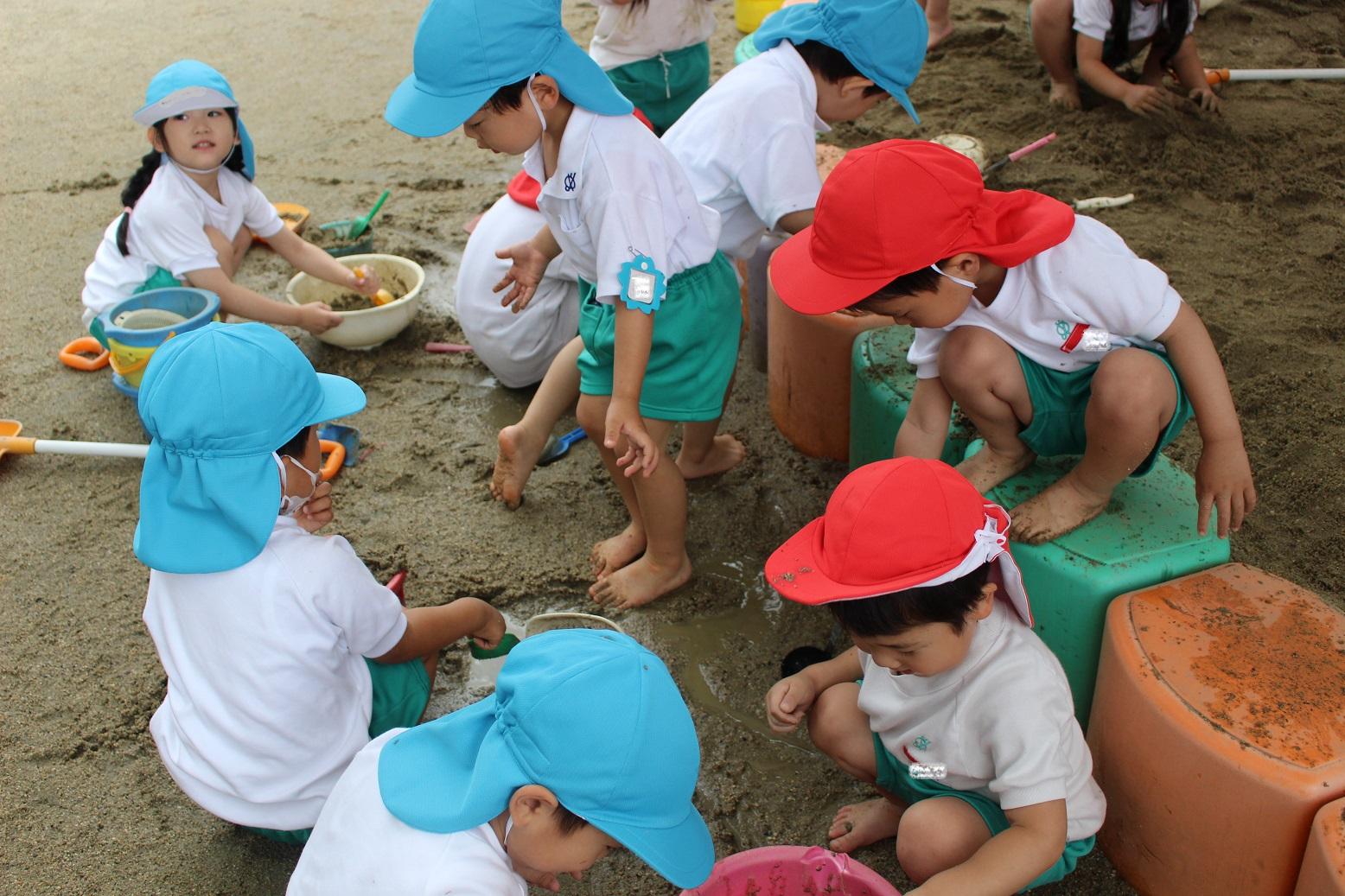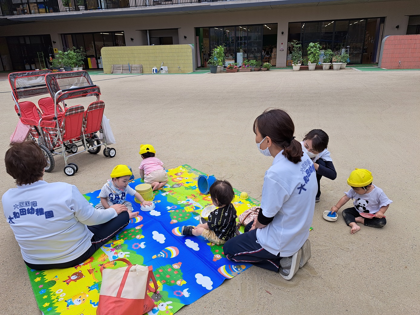 今日のうさぎ組さんは園内散歩♪フォレストホールではあやめ組さんが音楽発表会の練習中!素敵な合奏を聞かせてくれ、自然と体が音楽に合わせて動いていました!ひよこ組さんがテラスで色水遊びをしていたので一緒に参加させてもらいました♪カップですくったり、別の色の所に混ぜたりと楽しんでいました。「そろそろおしまいにしましょう!」と声掛けすると「いやだ!!」と泣き出す子どももいました(笑)ひよこさん!また一緒に遊んでね♪