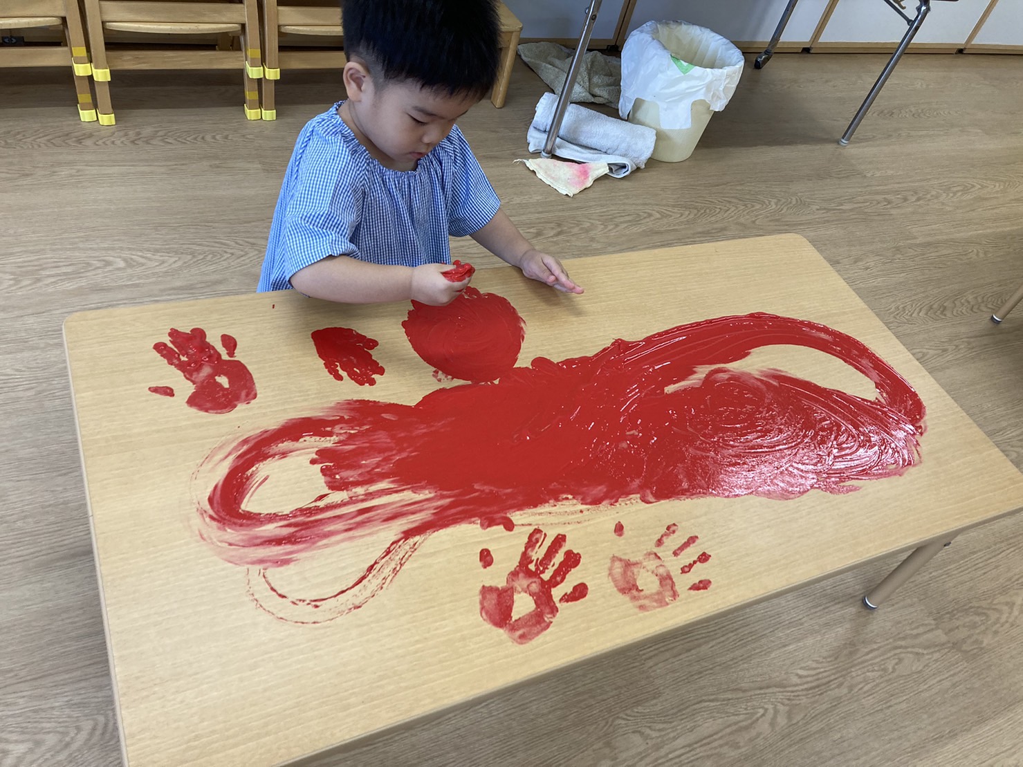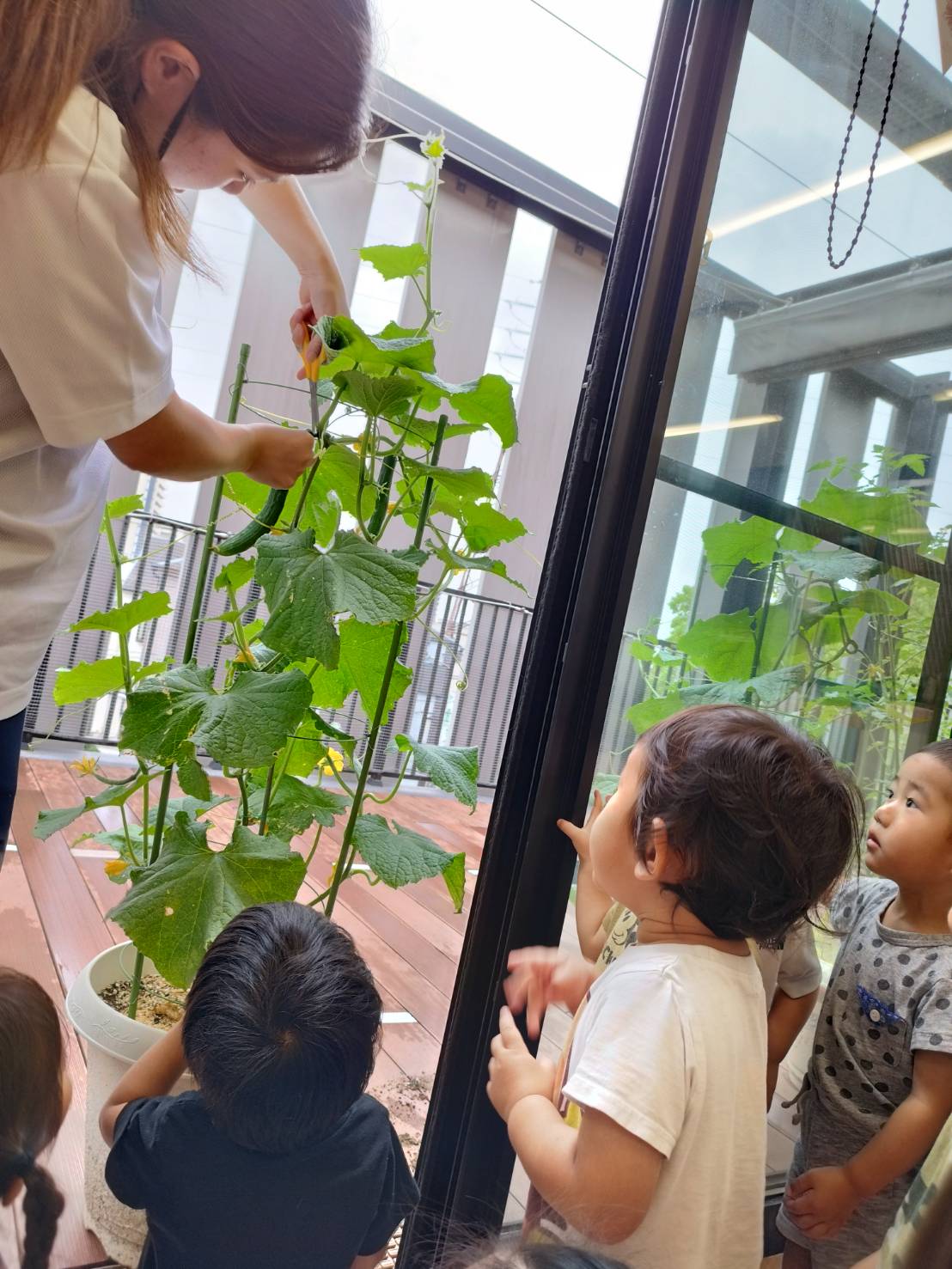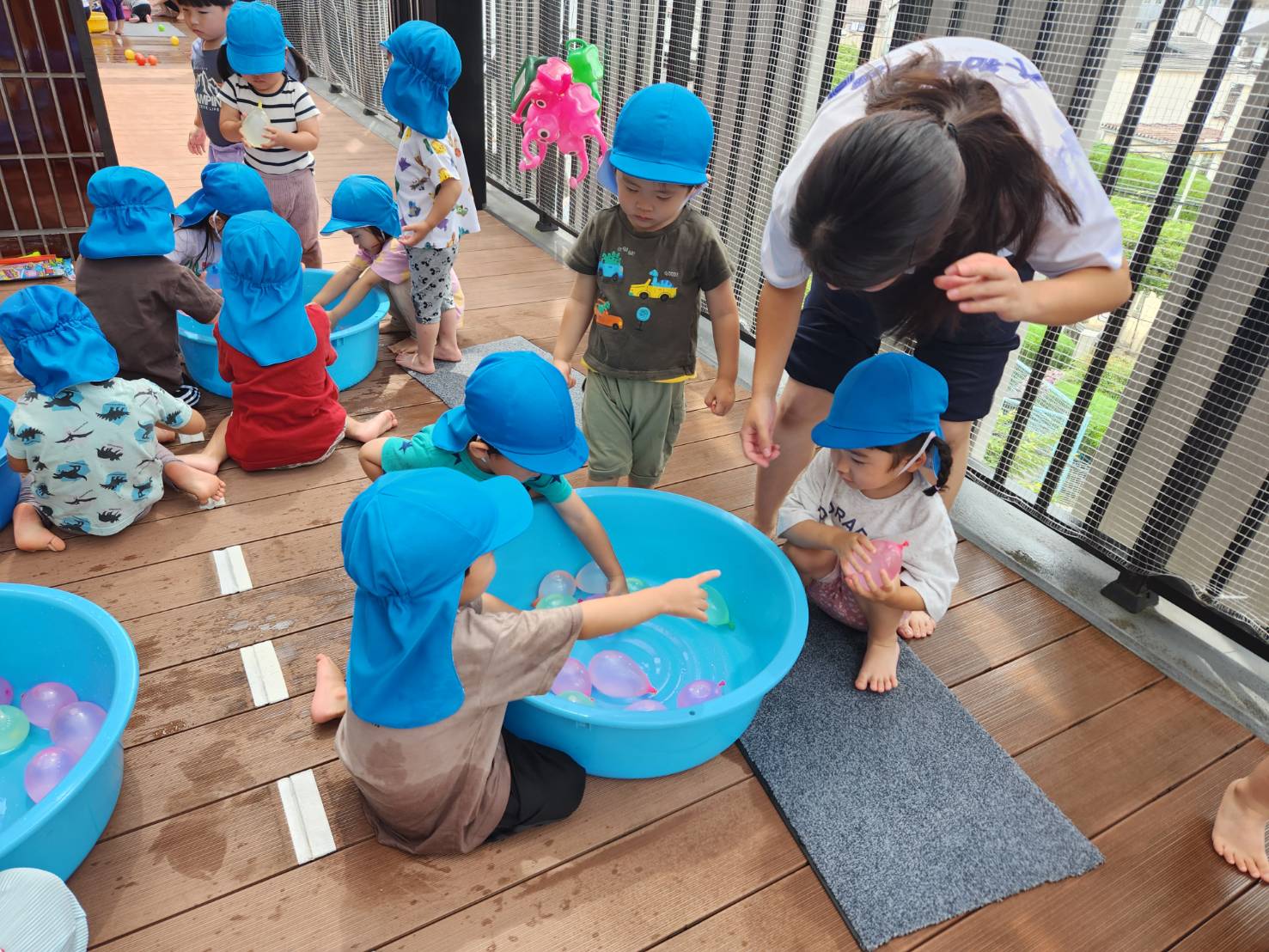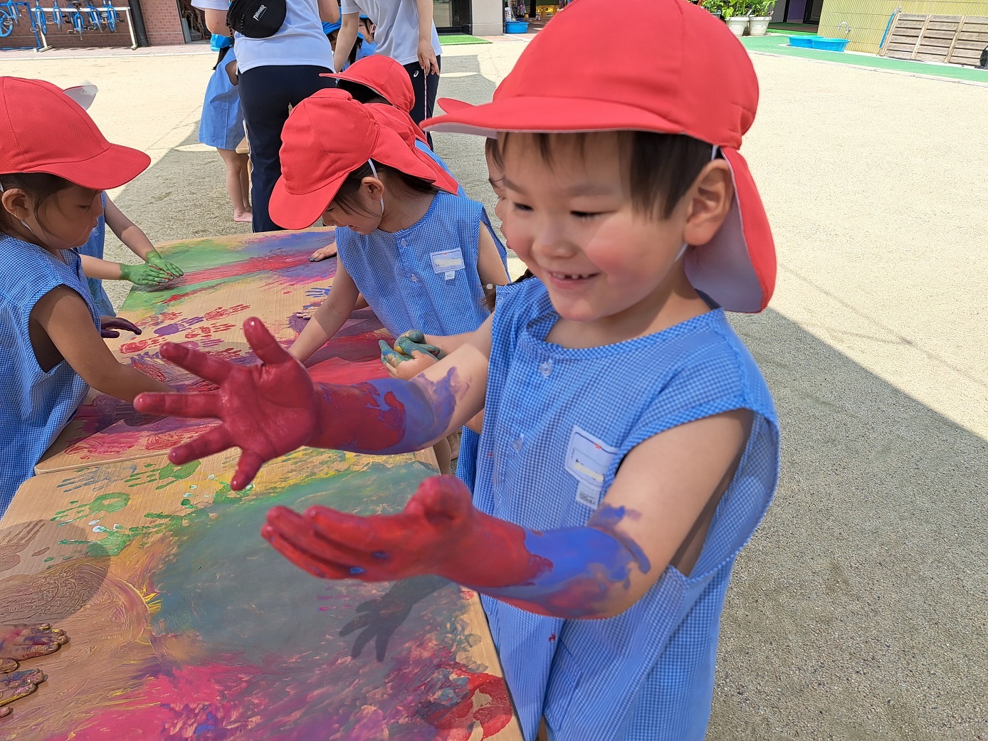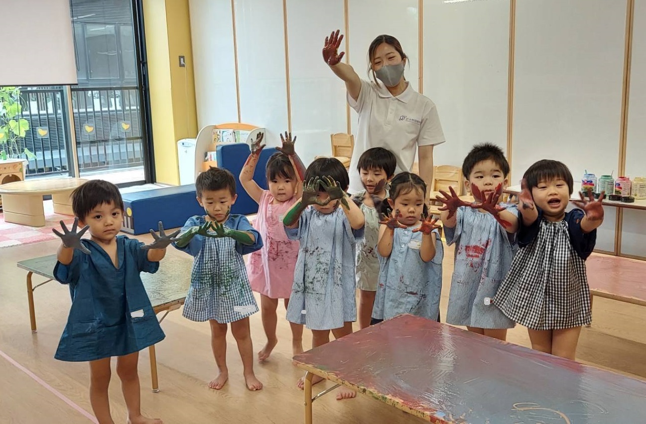 今日のうさぎ組さんは園内散歩♪フォレストホールではあやめ組さんが音楽発表会の練習中!素敵な合奏を聞かせてくれ、自然と体が音楽に合わせて動いていました!ひよこ組さんがテラスで色水遊びをしていたので一緒に参加させてもらいました♪カップですくったり、別の色の所に混ぜたりと楽しんでいました。「そろそろおしまいにしましょう!」と声掛けすると「いやだ!!」と泣き出す子どももいました(笑)ひよこさん!また一緒に遊んでね♪
