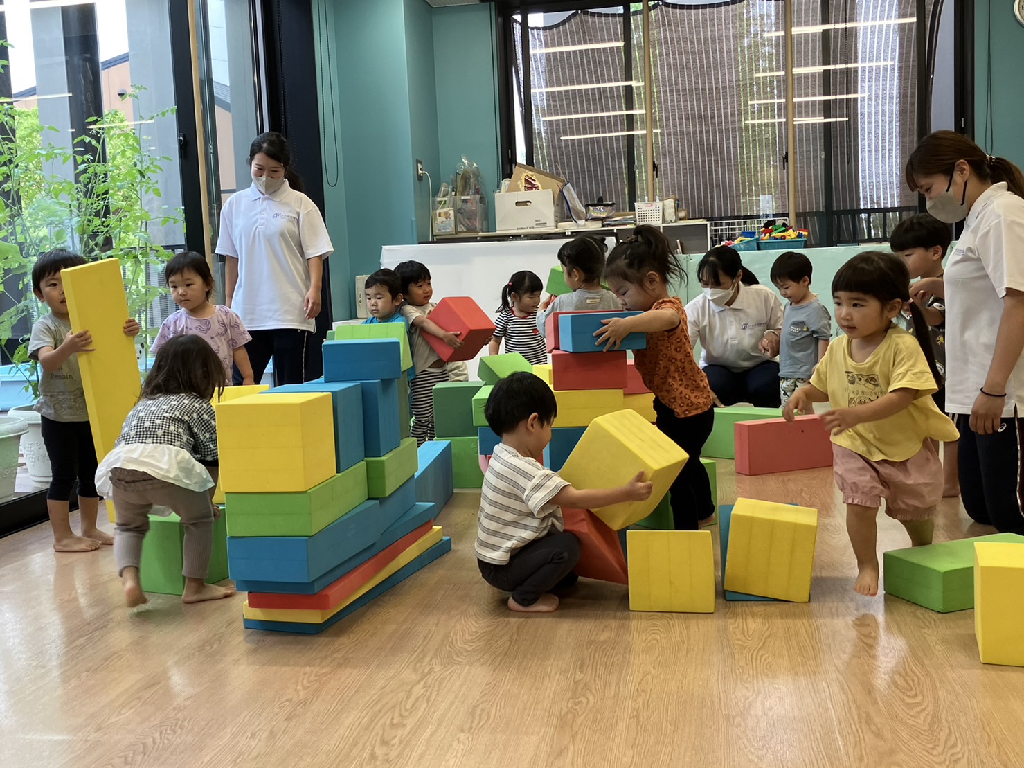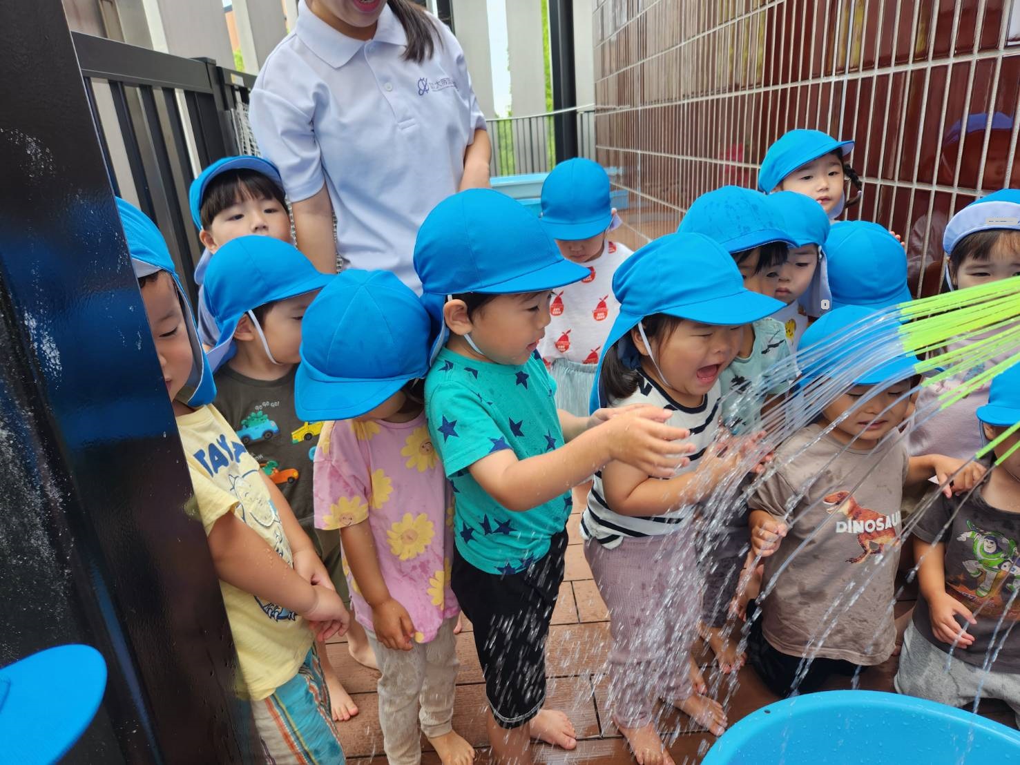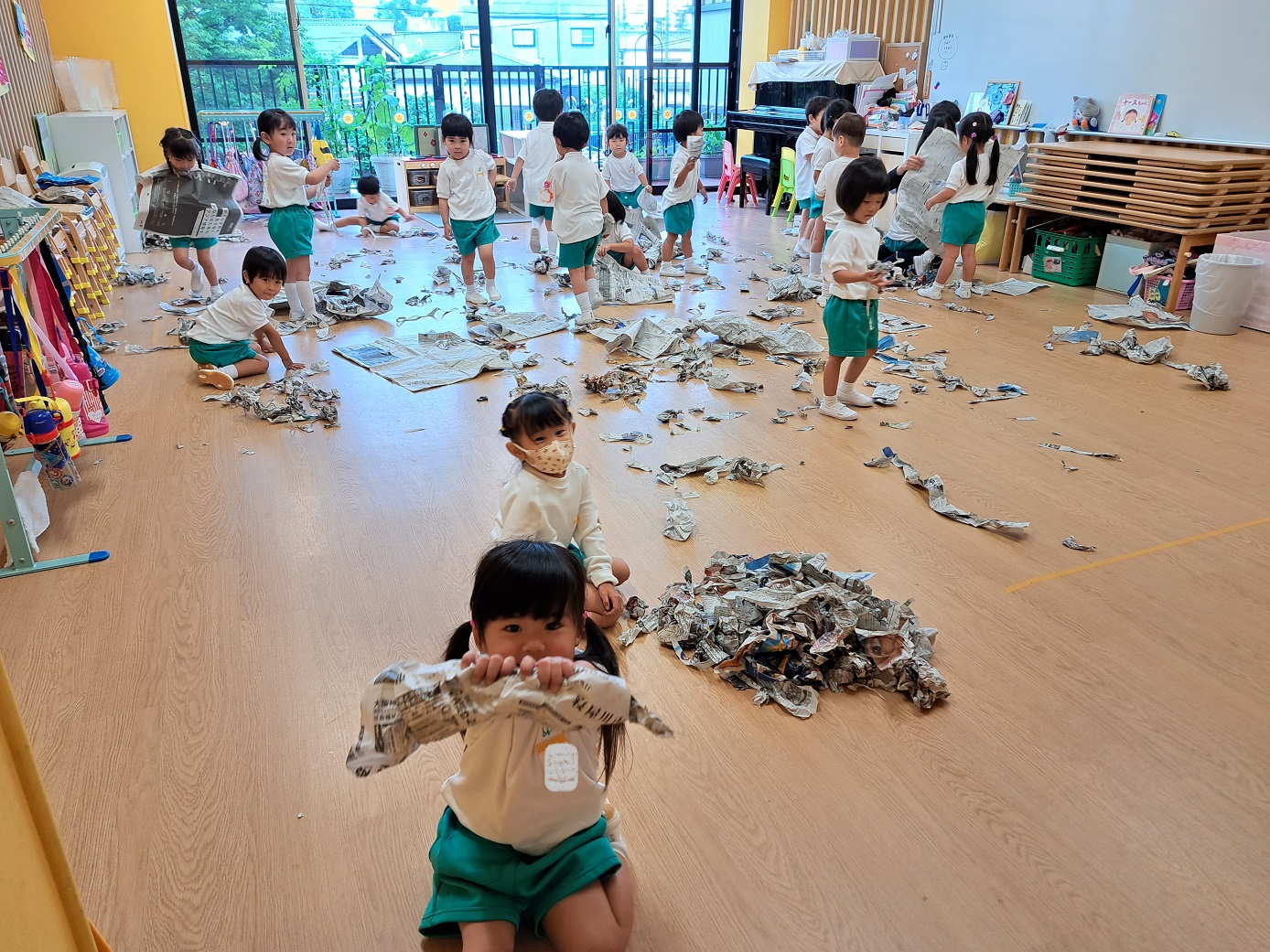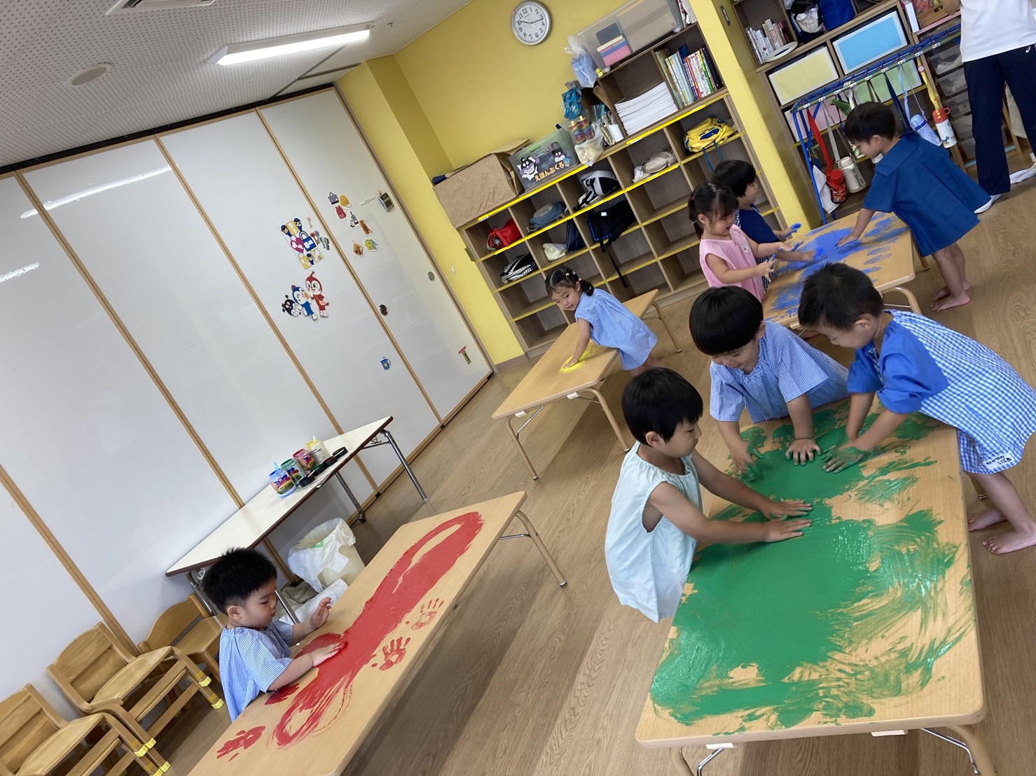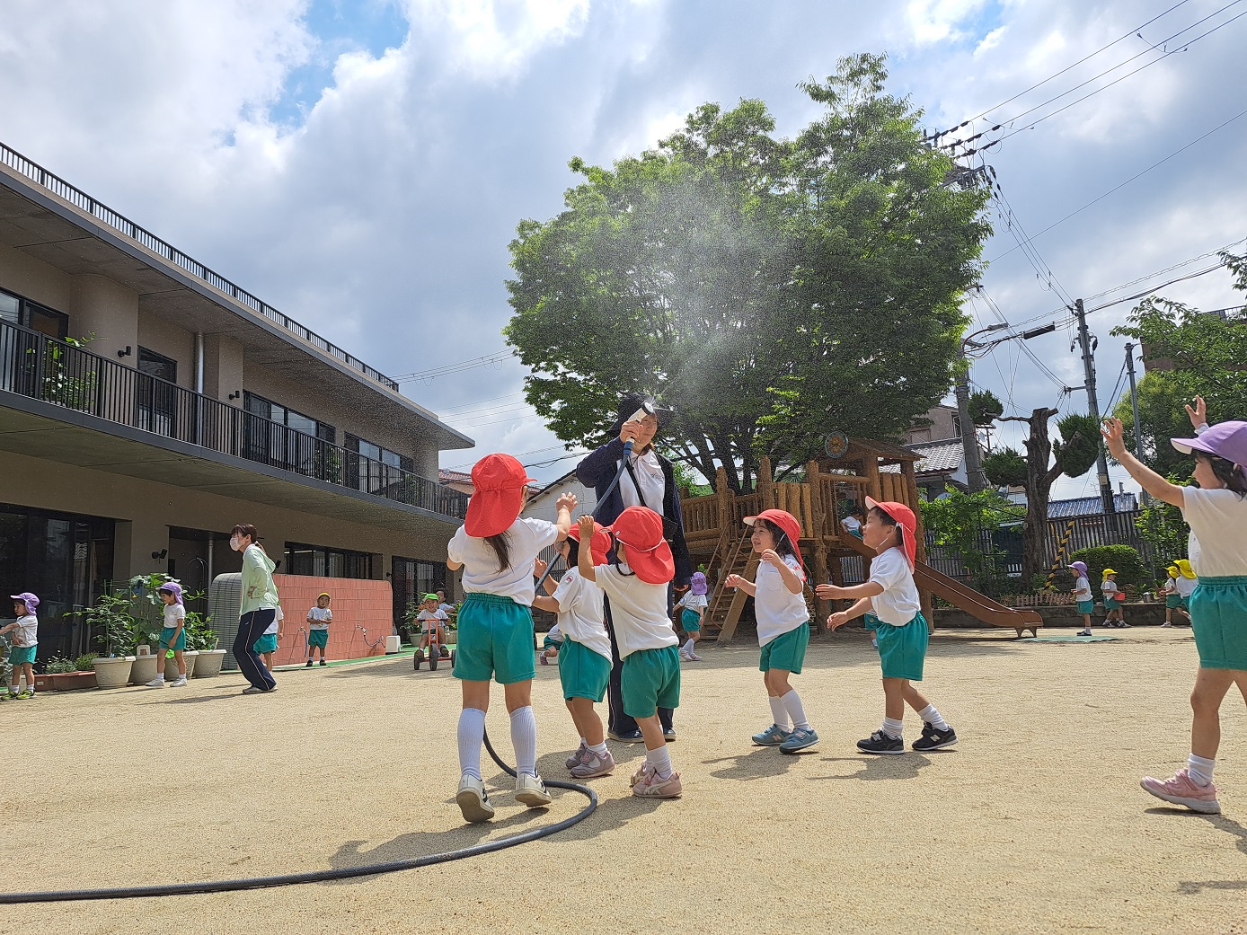 今日のうさぎ組さんは園内散歩♪フォレストホールではあやめ組さんが音楽発表会の練習中!素敵な合奏を聞かせてくれ、自然と体が音楽に合わせて動いていました!ひよこ組さんがテラスで色水遊びをしていたので一緒に参加させてもらいました♪カップですくったり、別の色の所に混ぜたりと楽しんでいました。「そろそろおしまいにしましょう!」と声掛けすると「いやだ!!」と泣き出す子どももいました(笑)ひよこさん!また一緒に遊んでね♪