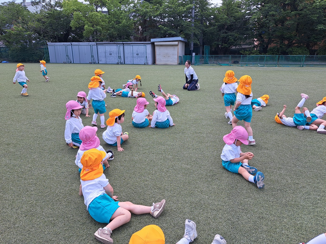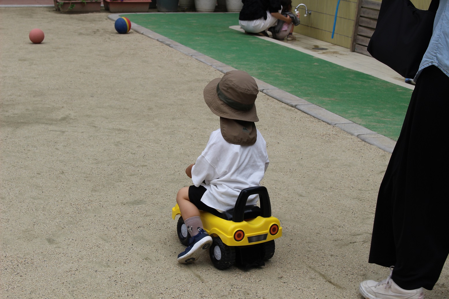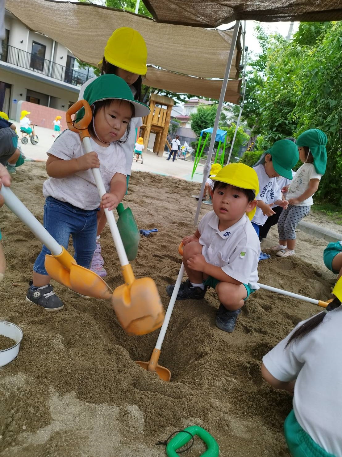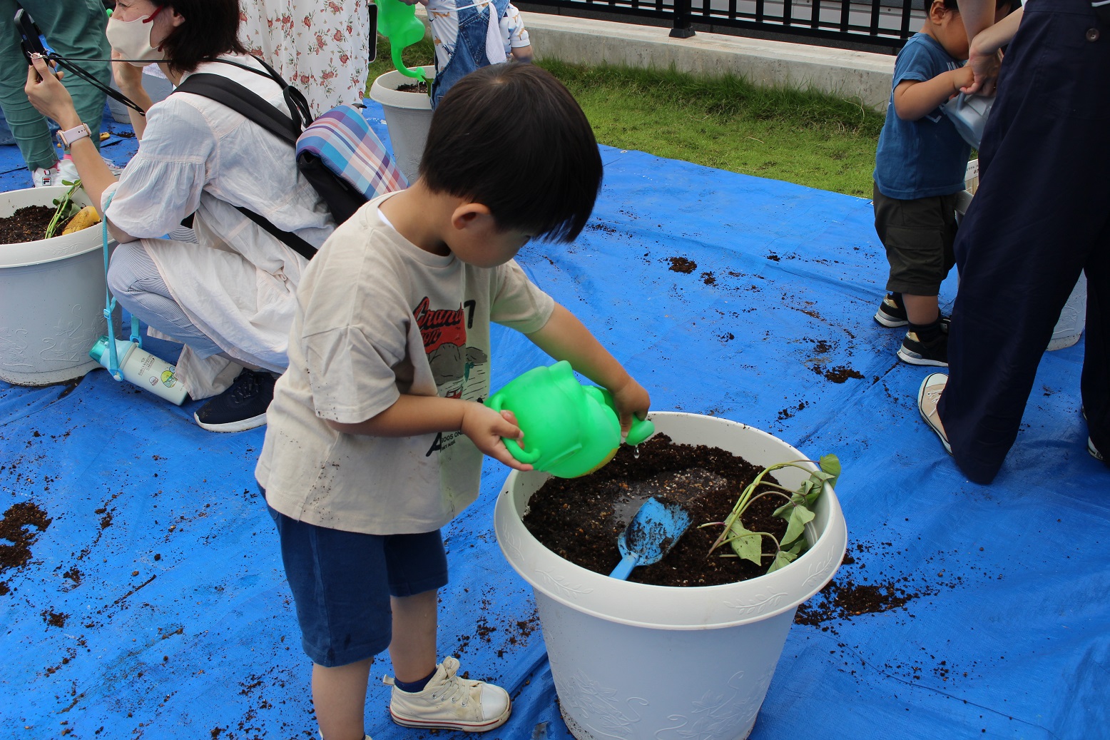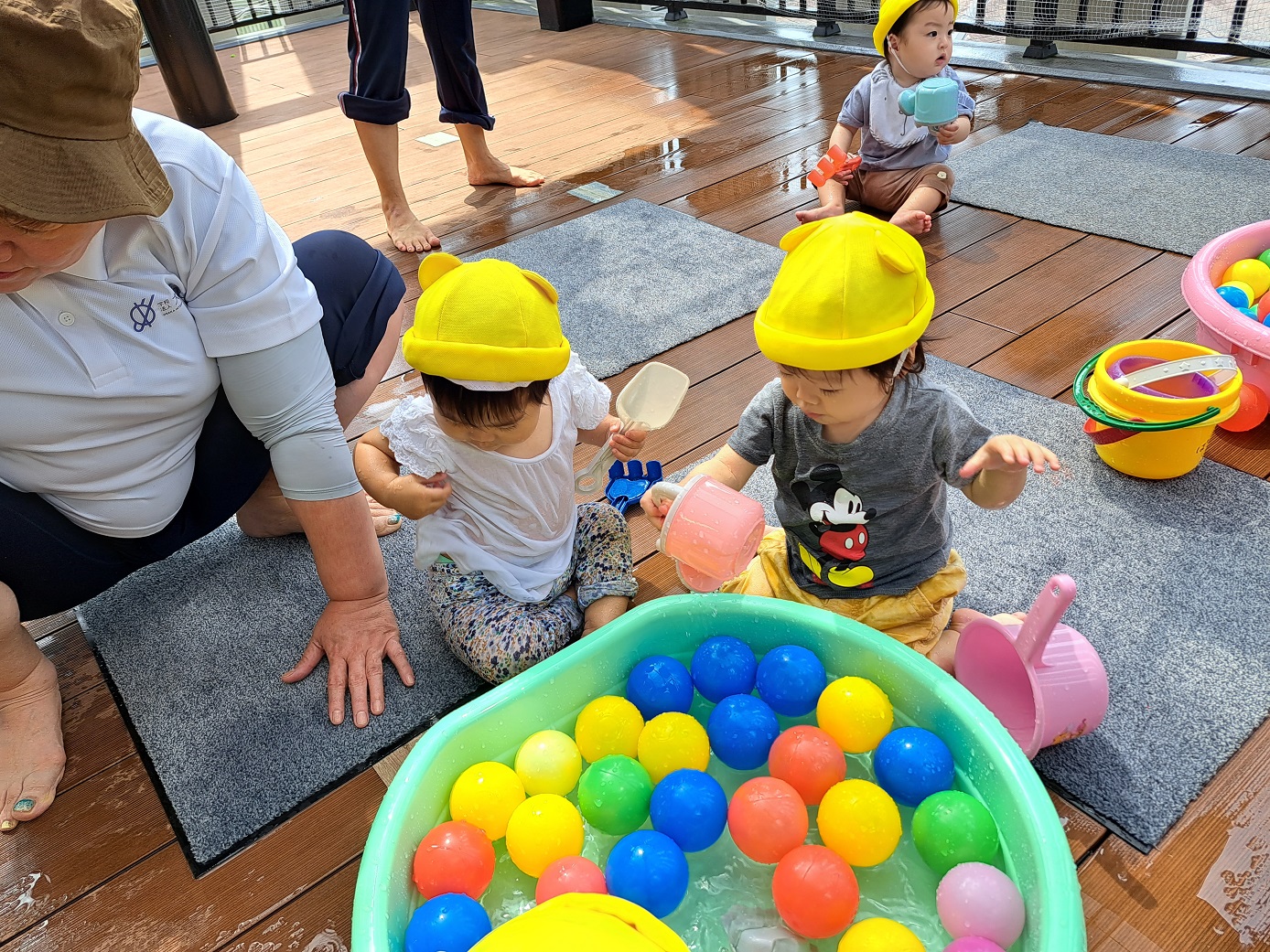 今日のうさぎ組さんは園内散歩♪フォレストホールではあやめ組さんが音楽発表会の練習中!素敵な合奏を聞かせてくれ、自然と体が音楽に合わせて動いていました!ひよこ組さんがテラスで色水遊びをしていたので一緒に参加させてもらいました♪カップですくったり、別の色の所に混ぜたりと楽しんでいました。「そろそろおしまいにしましょう!」と声掛けすると「いやだ!!」と泣き出す子どももいました(笑)ひよこさん!また一緒に遊んでね♪