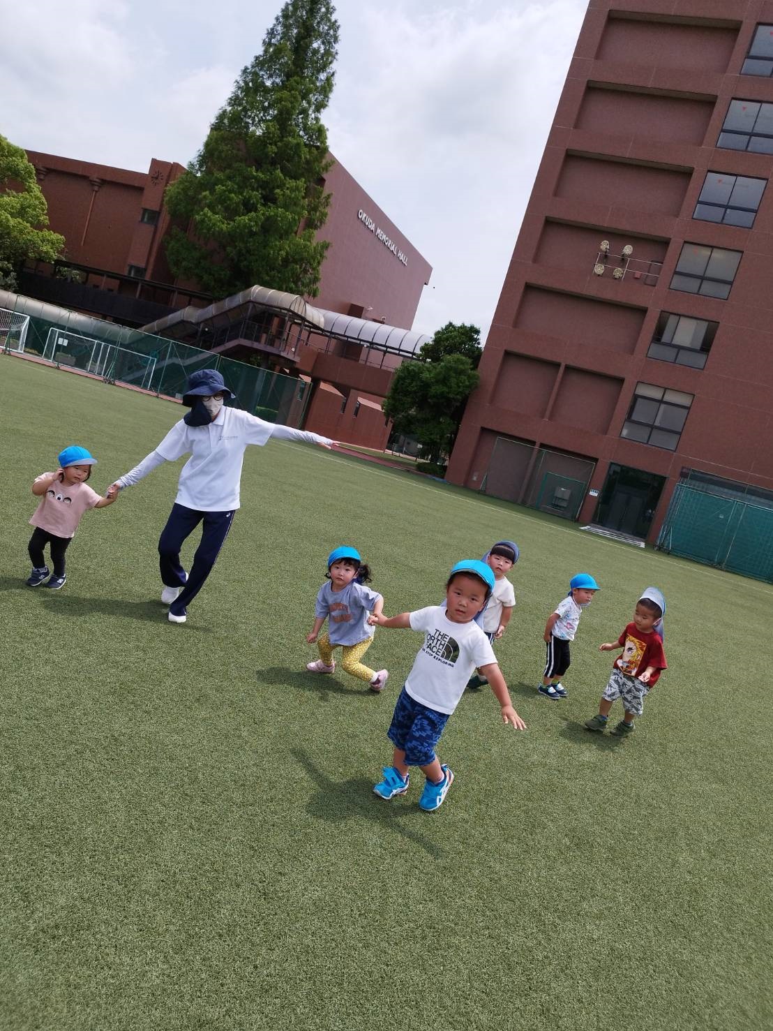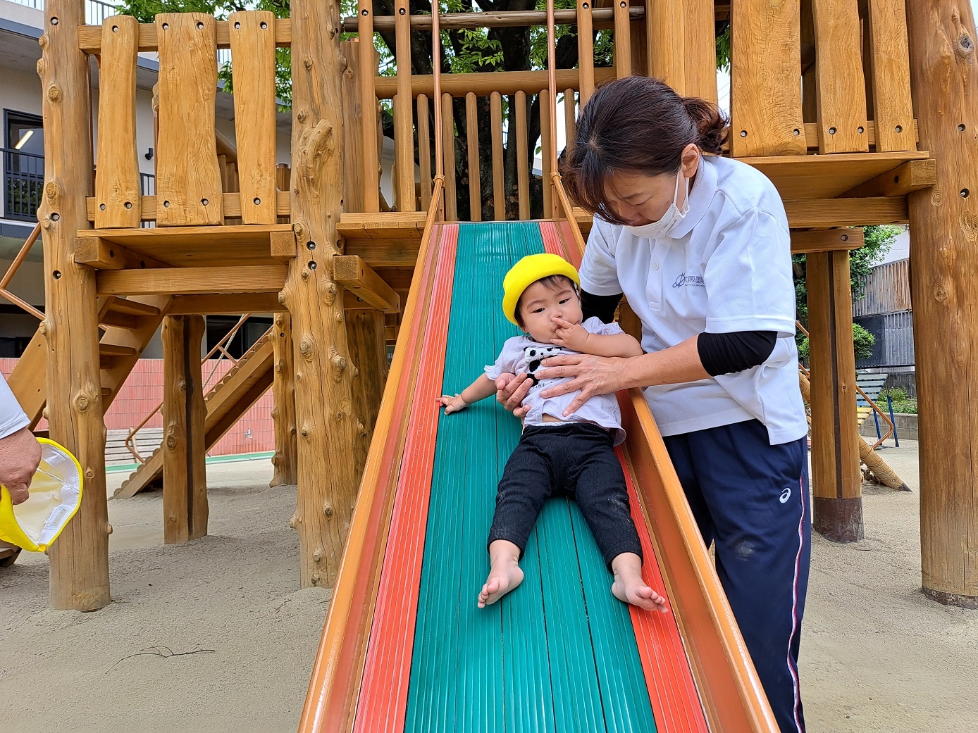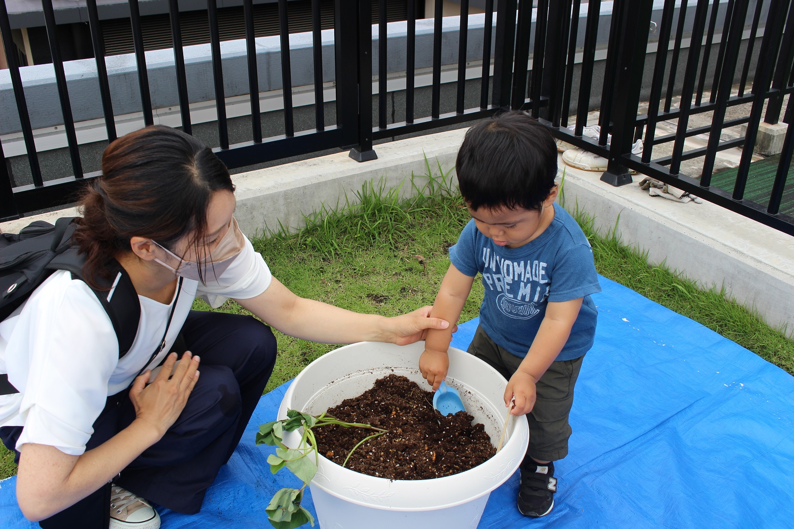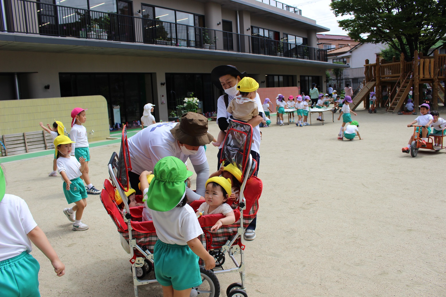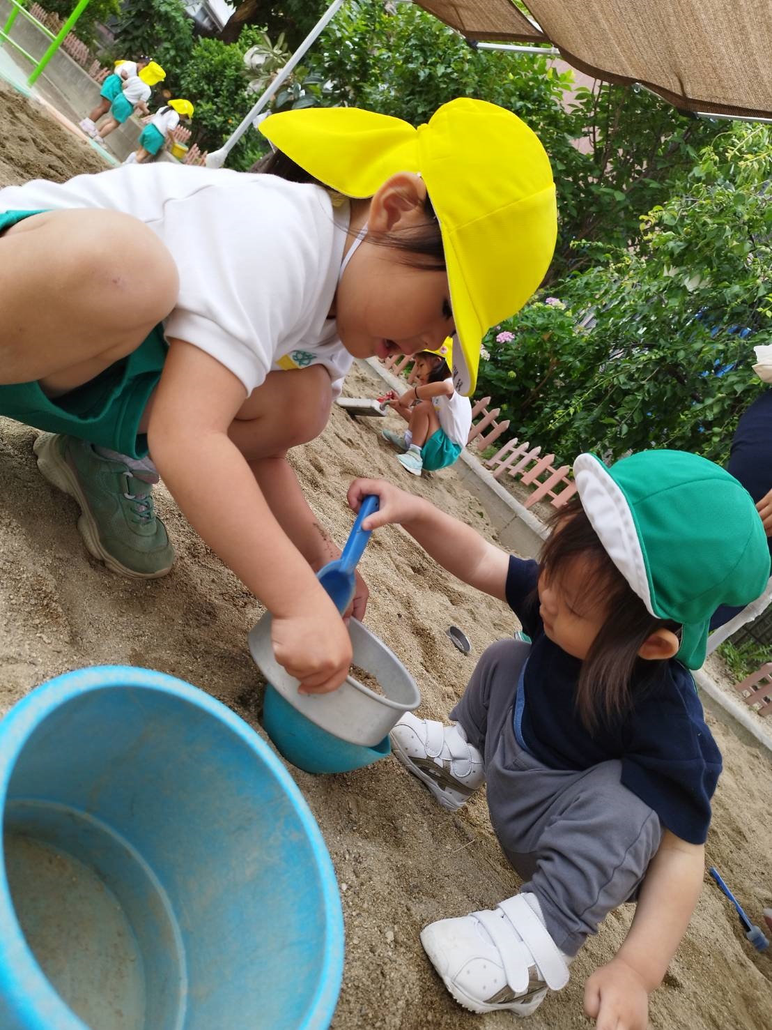 今日のうさぎ組さんは園内散歩♪フォレストホールではあやめ組さんが音楽発表会の練習中!素敵な合奏を聞かせてくれ、自然と体が音楽に合わせて動いていました!ひよこ組さんがテラスで色水遊びをしていたので一緒に参加させてもらいました♪カップですくったり、別の色の所に混ぜたりと楽しんでいました。「そろそろおしまいにしましょう!」と声掛けすると「いやだ!!」と泣き出す子どももいました(笑)ひよこさん!また一緒に遊んでね♪