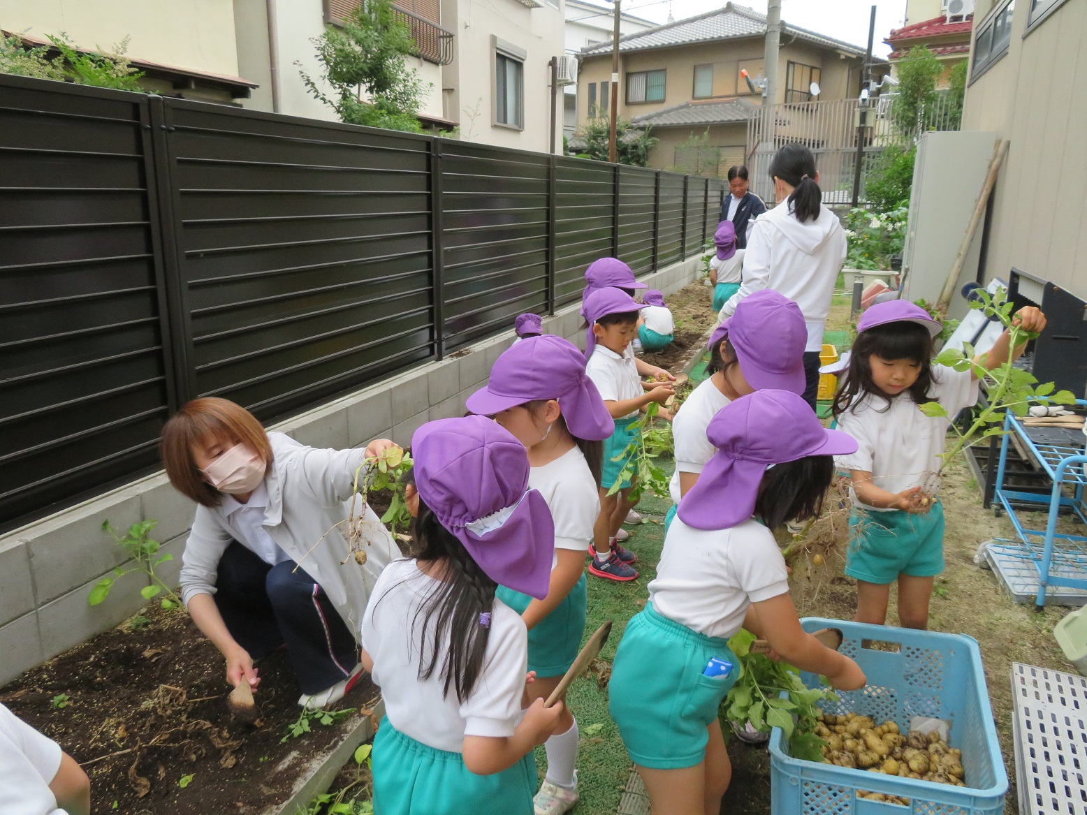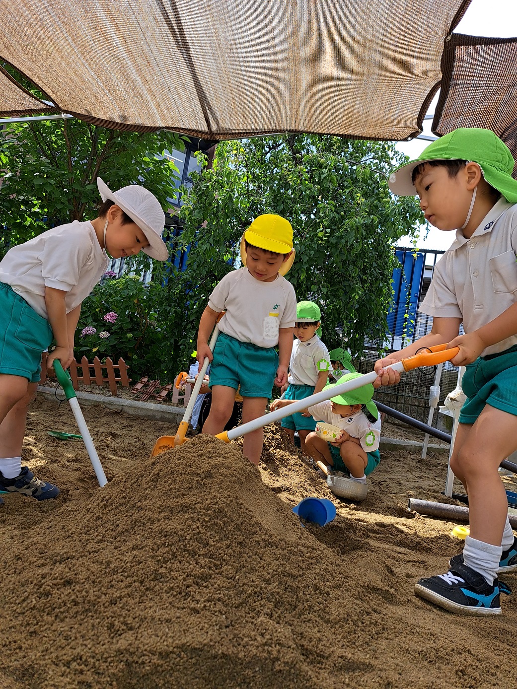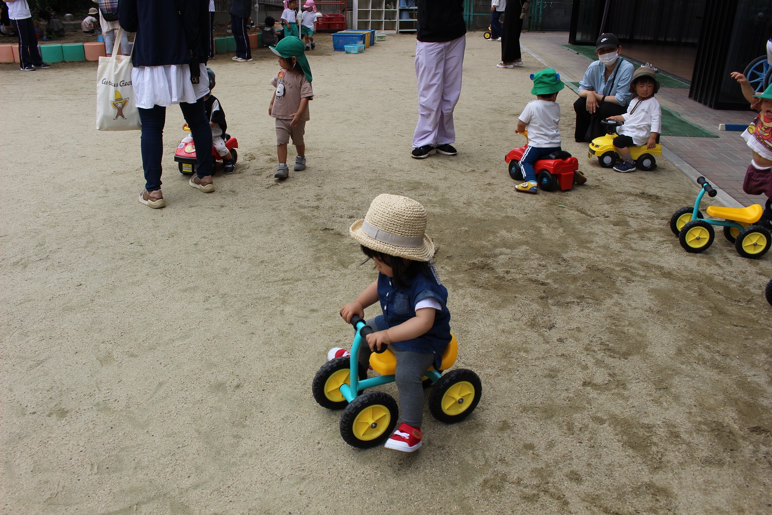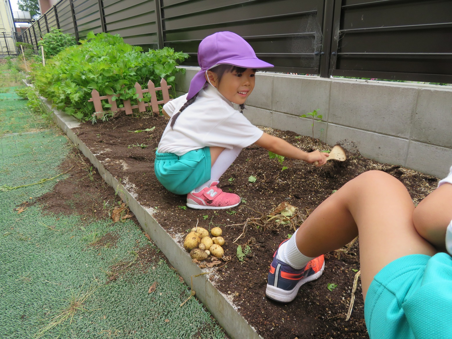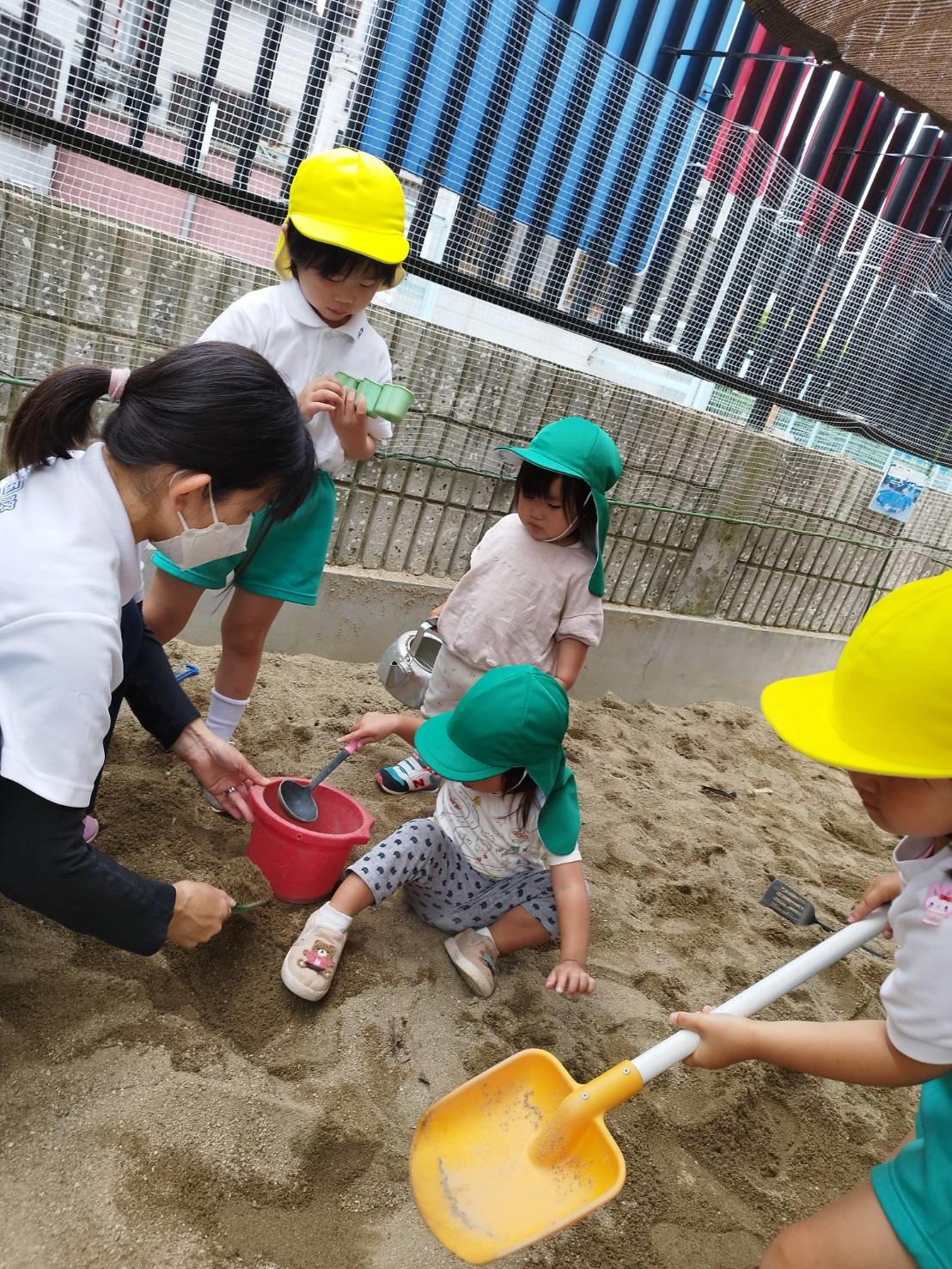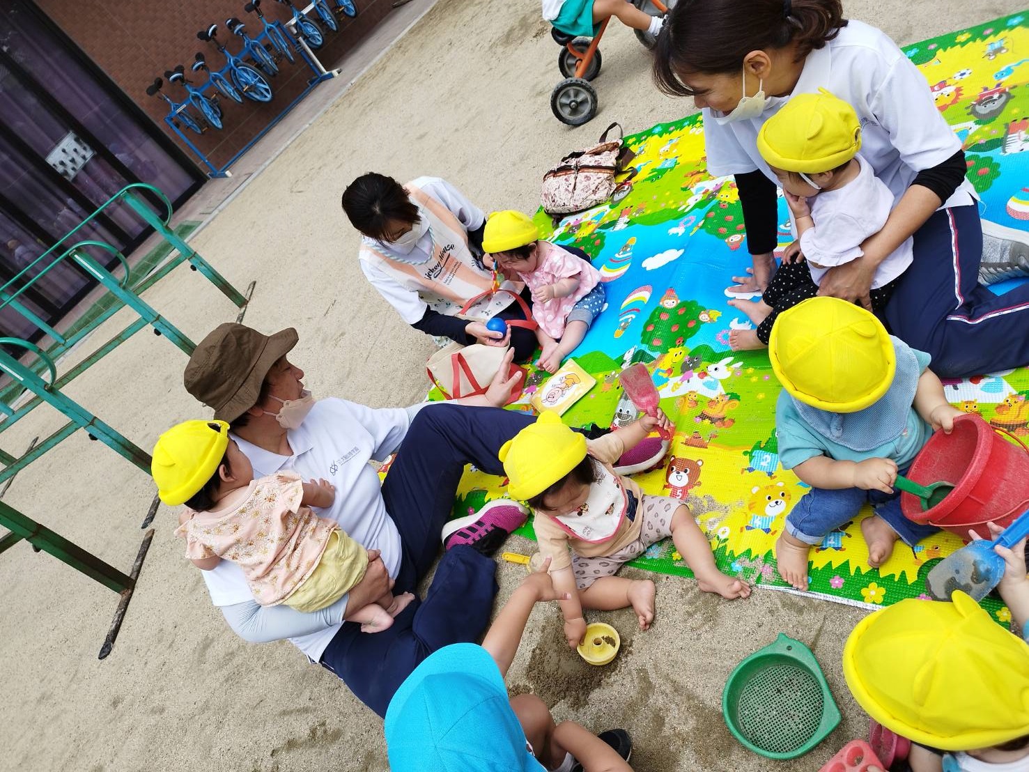 今日のうさぎ組さんは園内散歩♪フォレストホールではあやめ組さんが音楽発表会の練習中!素敵な合奏を聞かせてくれ、自然と体が音楽に合わせて動いていました!ひよこ組さんがテラスで色水遊びをしていたので一緒に参加させてもらいました♪カップですくったり、別の色の所に混ぜたりと楽しんでいました。「そろそろおしまいにしましょう!」と声掛けすると「いやだ!!」と泣き出す子どももいました(笑)ひよこさん!また一緒に遊んでね♪