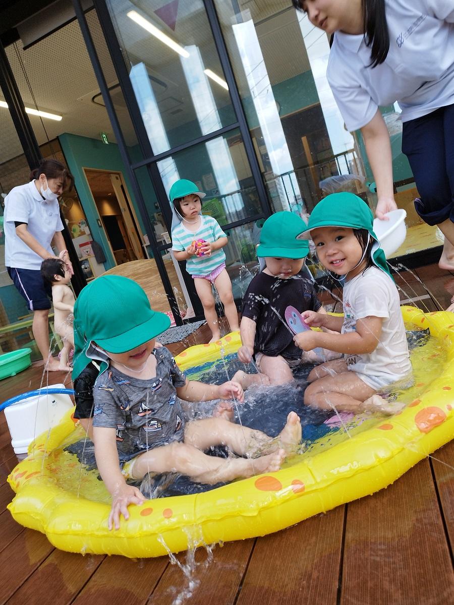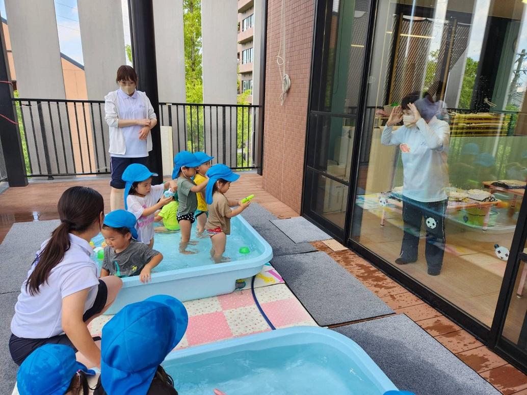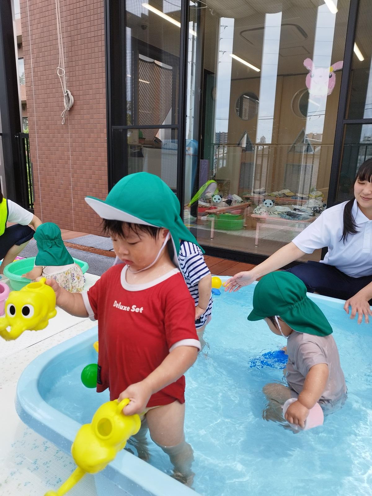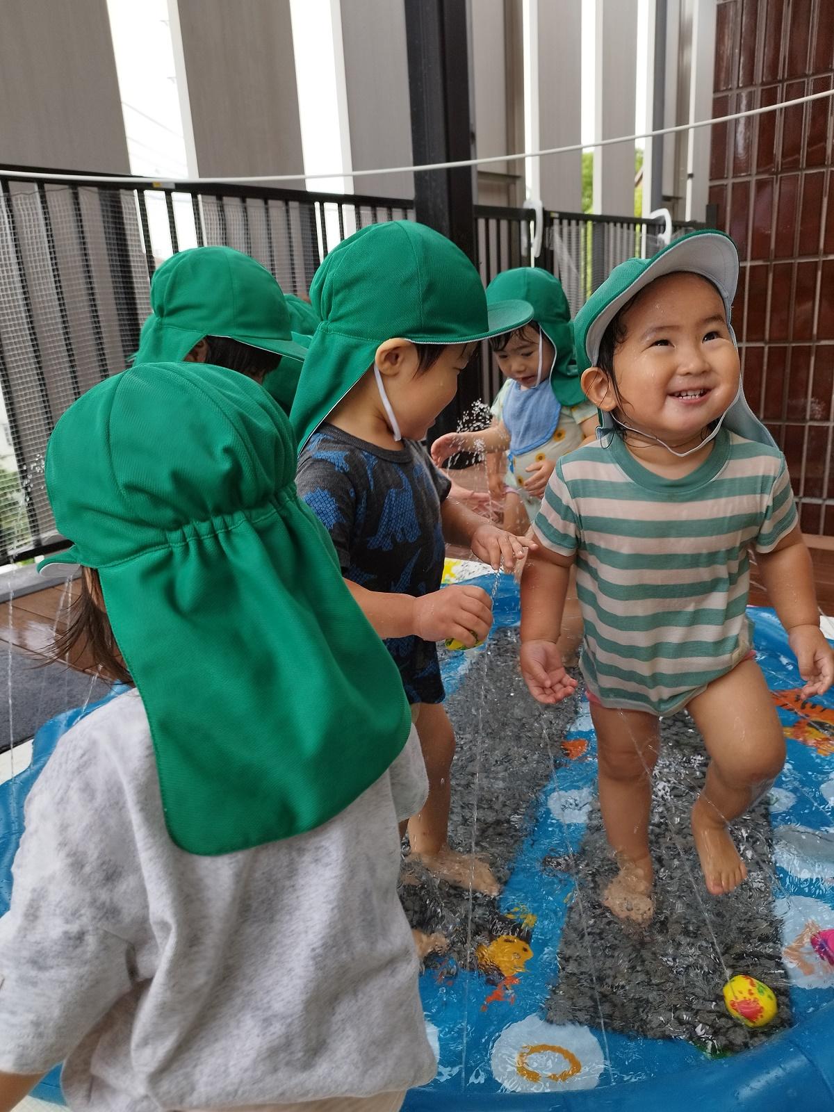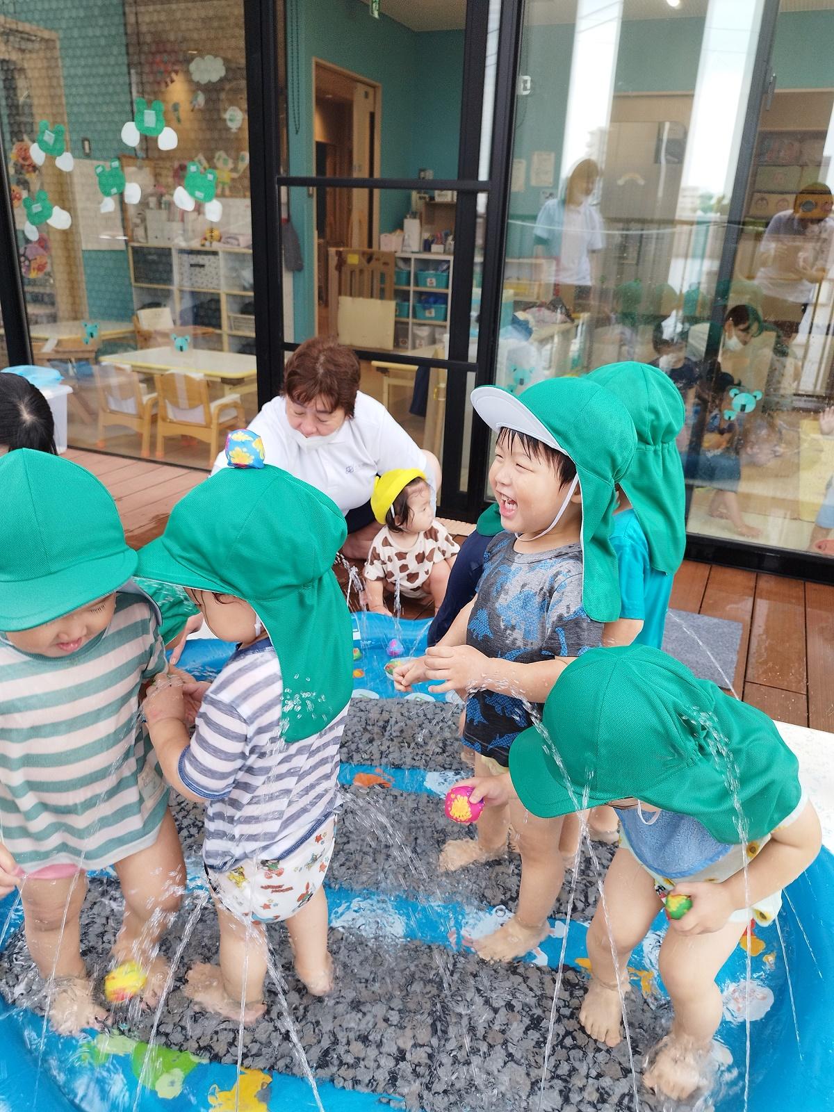 お天気も良く、初めは「つめたい!」と言っていた子どもたちも「きゃはは♬」と声を出しながら遊んでいました!夏ならではの楽しい遊びをたくさんしていきたいと思います!
