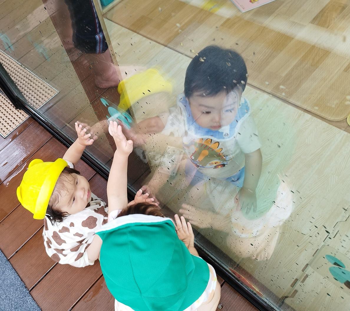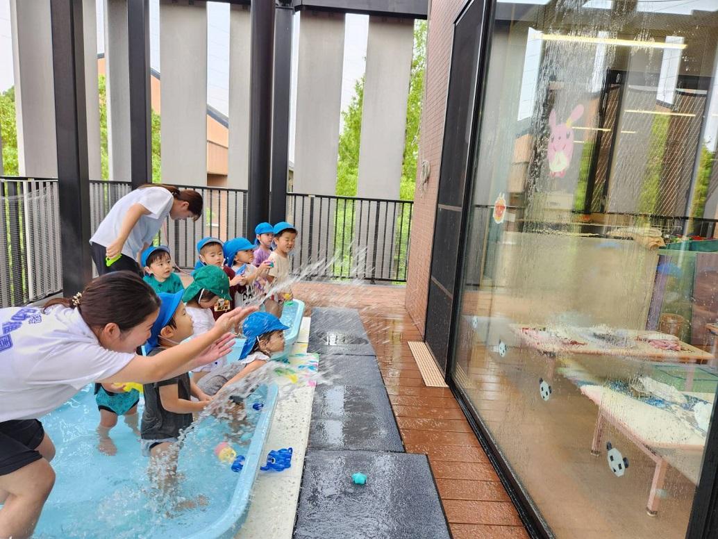 園長先生たちが遊びに来てくれ、「園長先生をねらっちゃおう!」と窓越しに水かけ遊びが始まりました!!