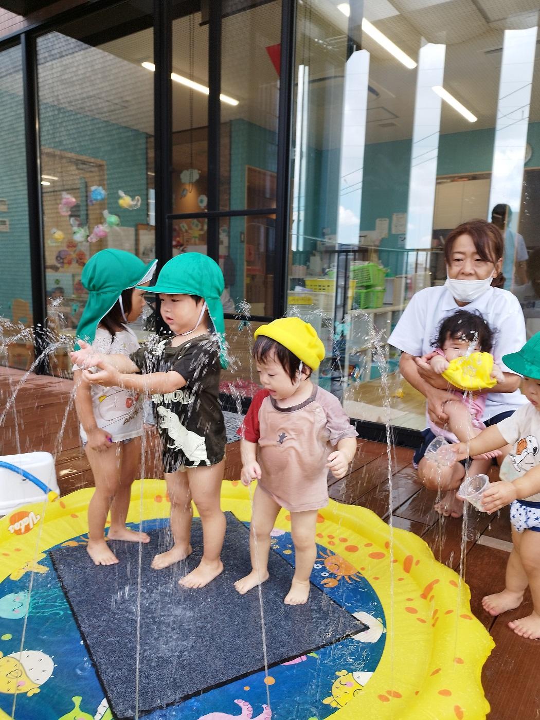 今日も元気に水遊びを楽しみました♪最初は水が冷たく、すこ~しずつ噴水やプールに入る子どもたち。体が慣れてくると遊び方もダイナミックになってきます!水遊びをしている時の子どもの表情、可愛すぎます♪♪鼻水や咳が出始めてきているお友だちもいるので、またお家の方でも体調をみてあげてくださいね。