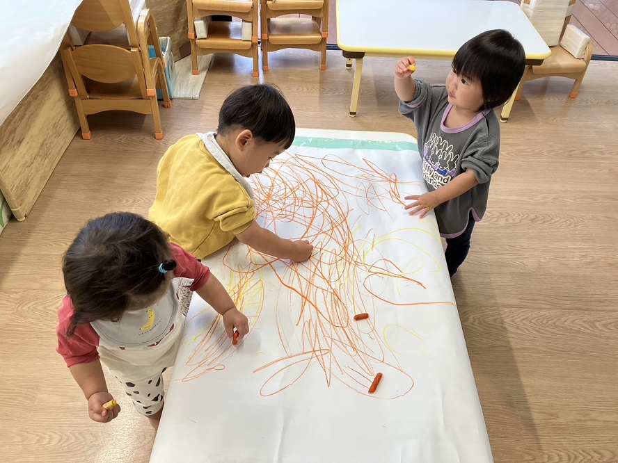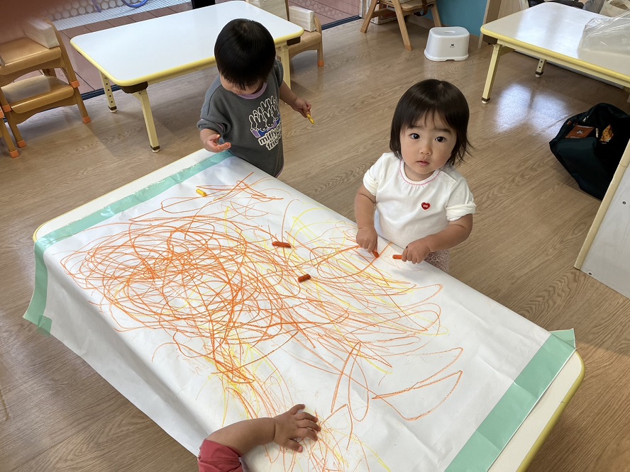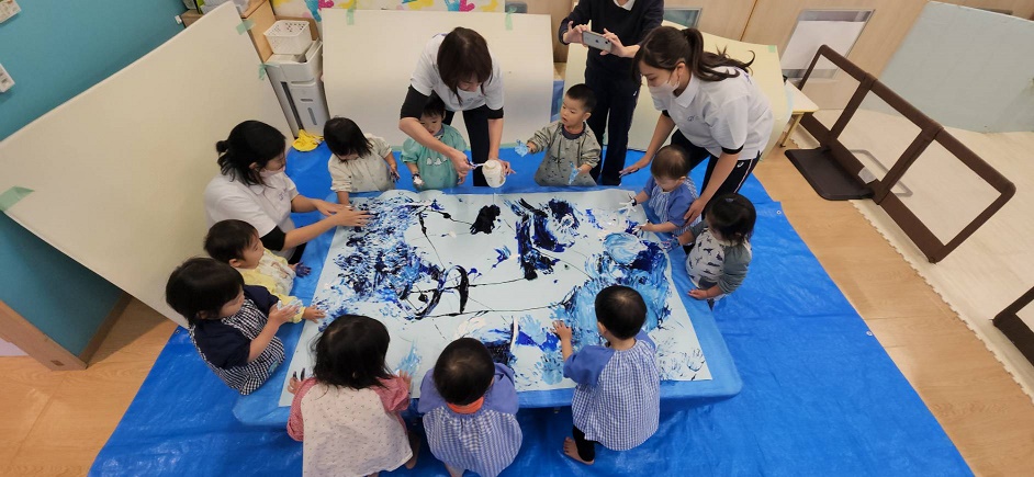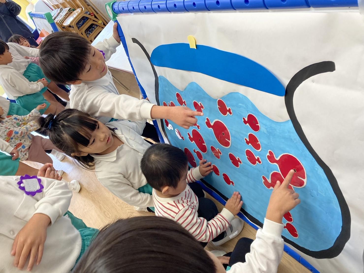 色なしクジラさんにみんなで色を塗ってあげました♪両手を大きく動かして、みんなでぬりぬり~!!違う色を足すと、色が変化し、遊びが止まりません♪♪素敵なクジラさんが出来上がり!