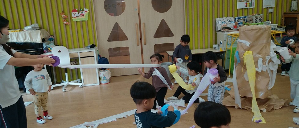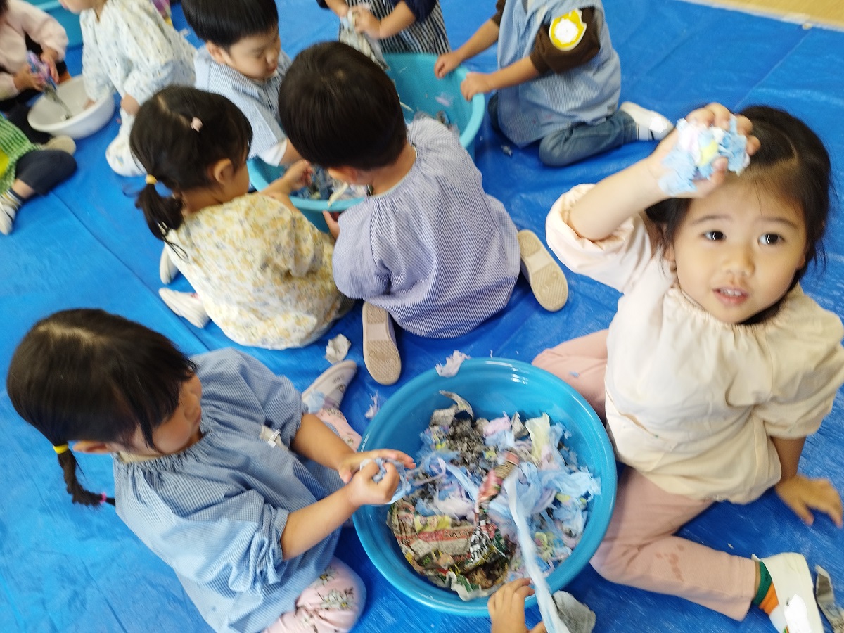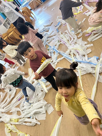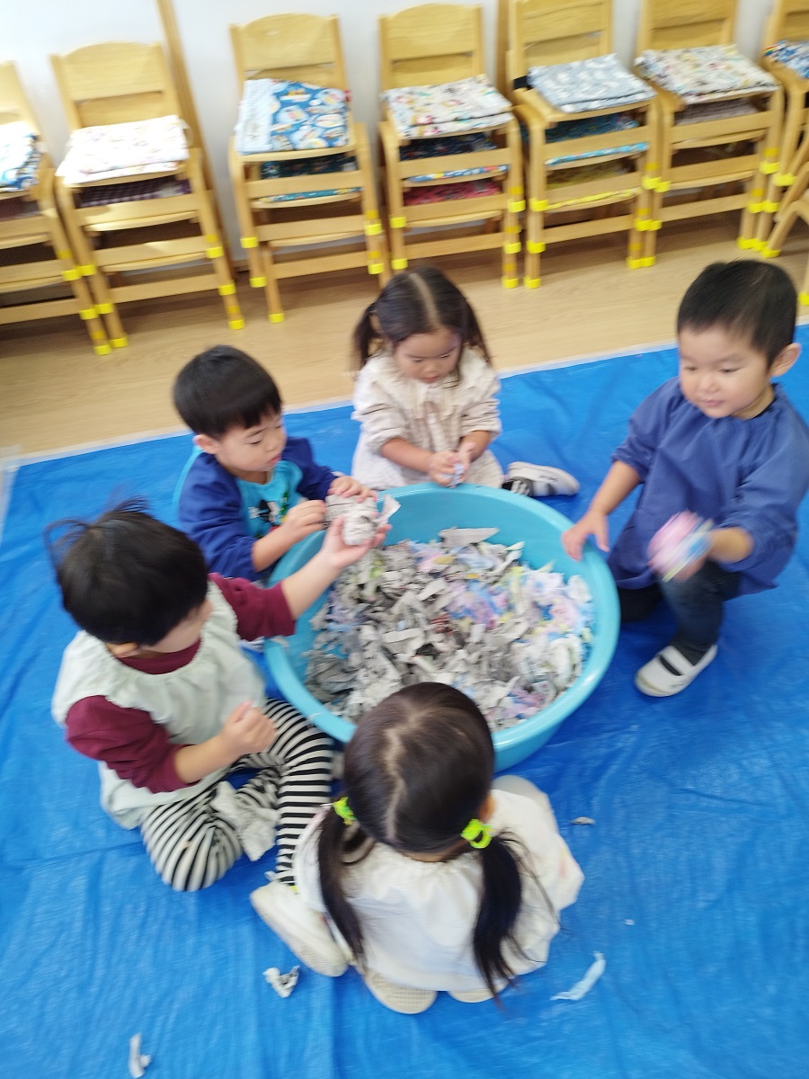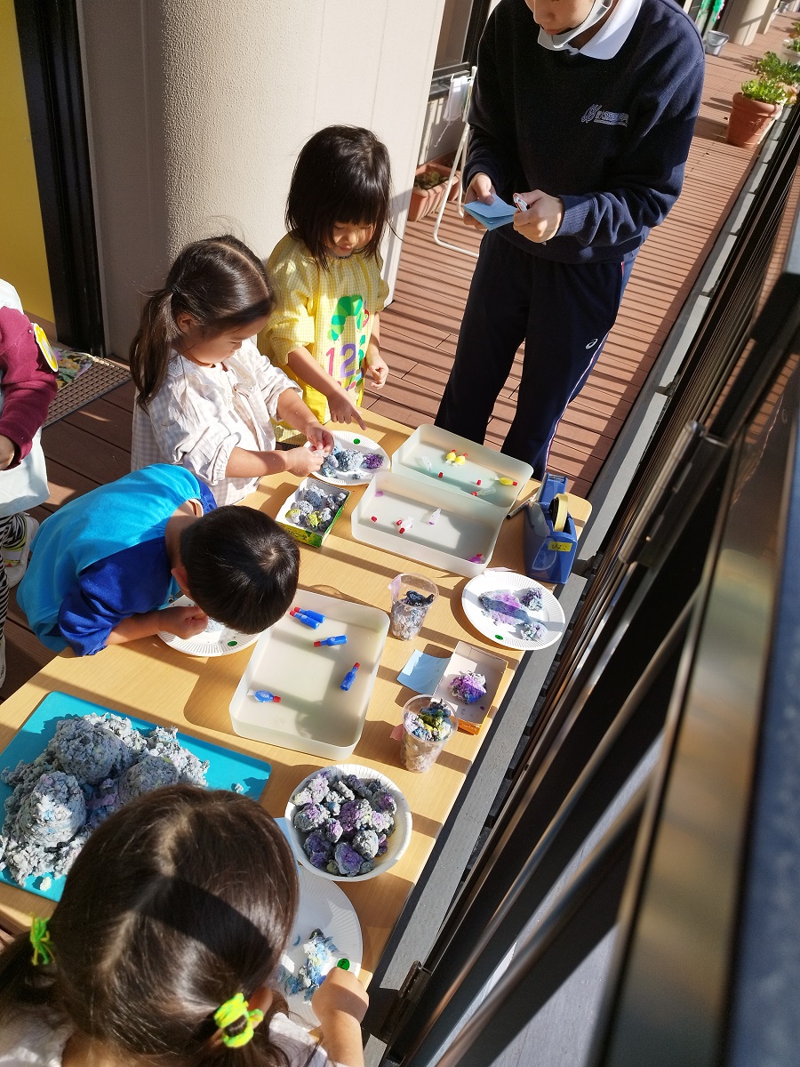 色なしクジラさんにみんなで色を塗ってあげました♪両手を大きく動かして、みんなでぬりぬり~!!違う色を足すと、色が変化し、遊びが止まりません♪♪素敵なクジラさんが出来上がり!