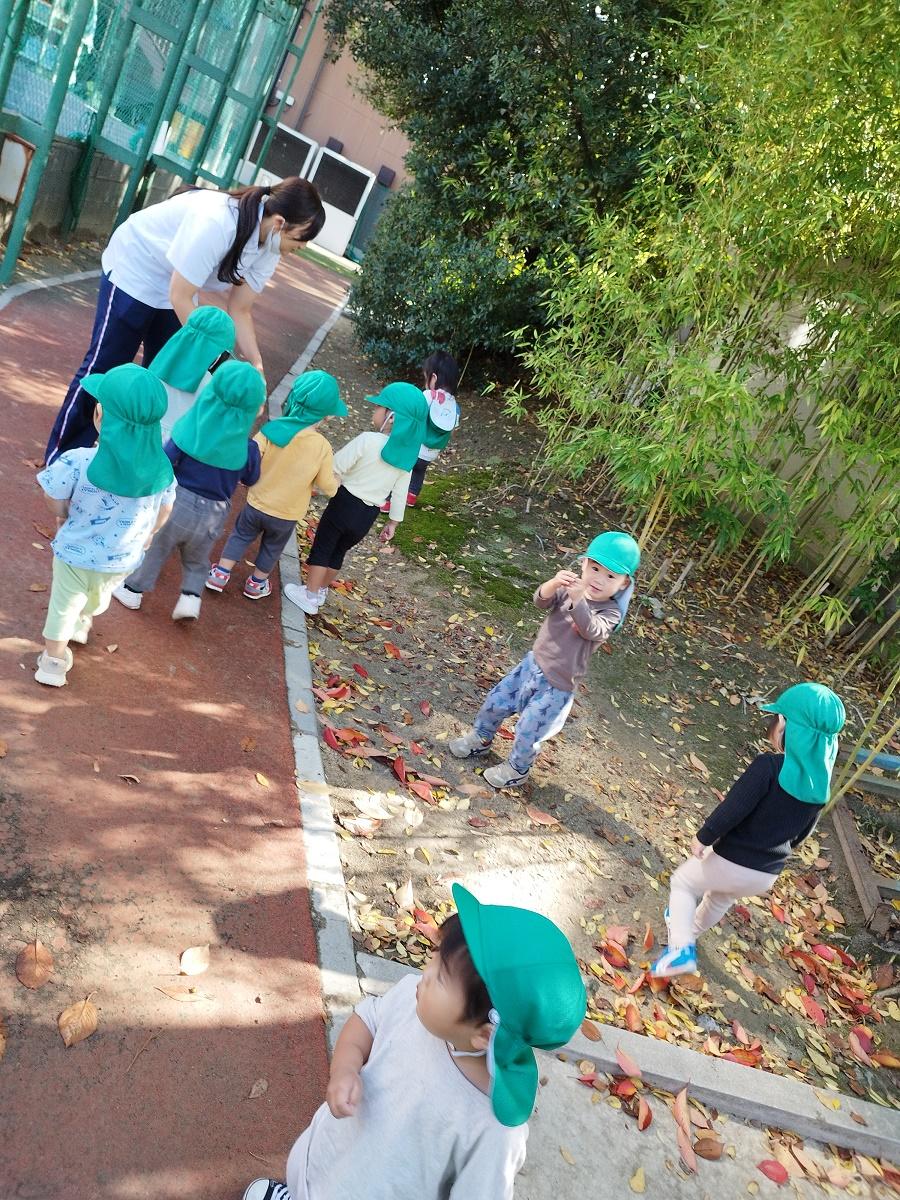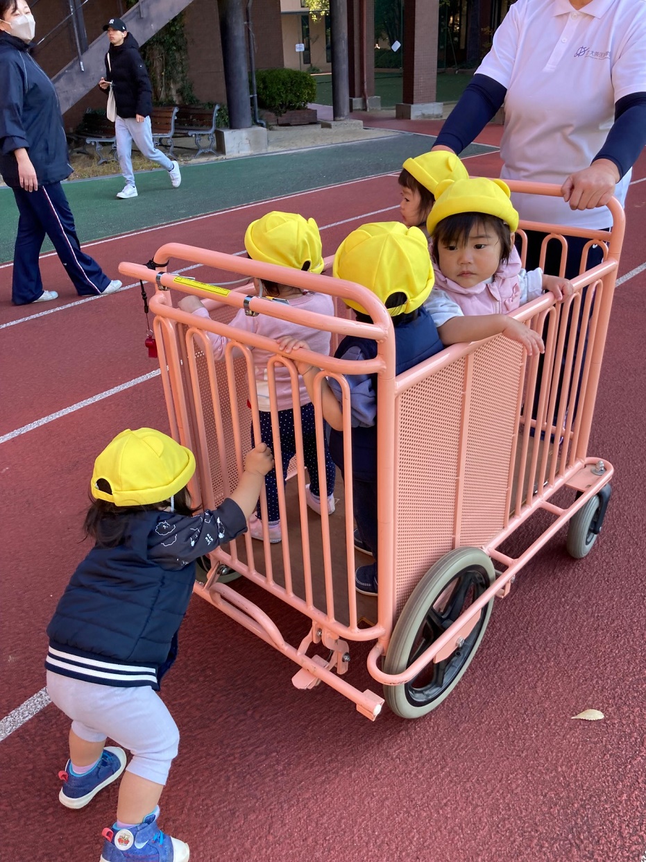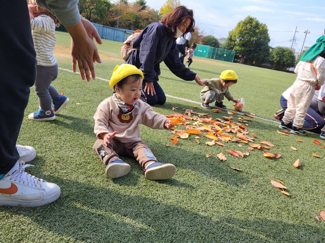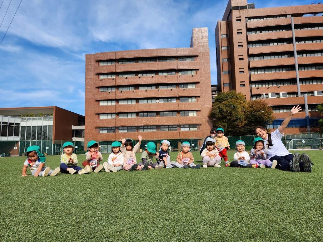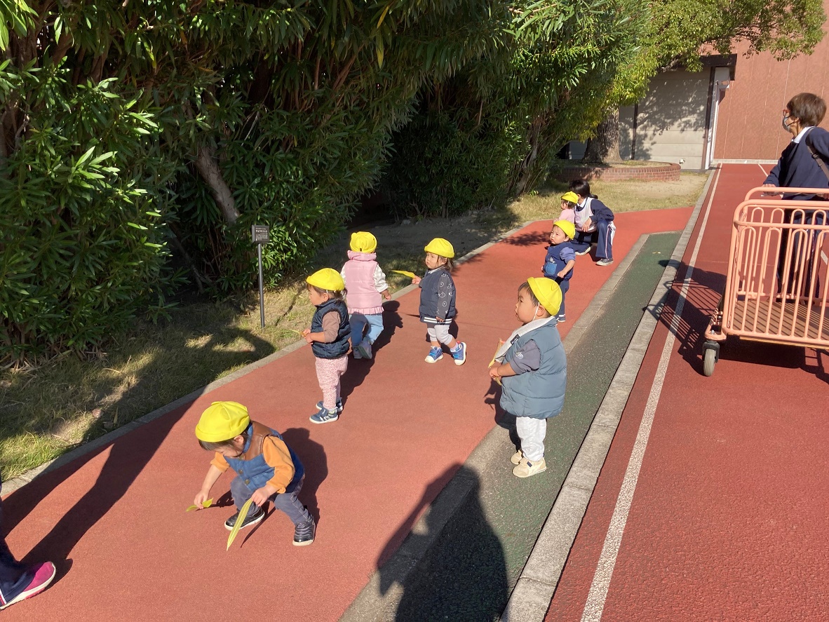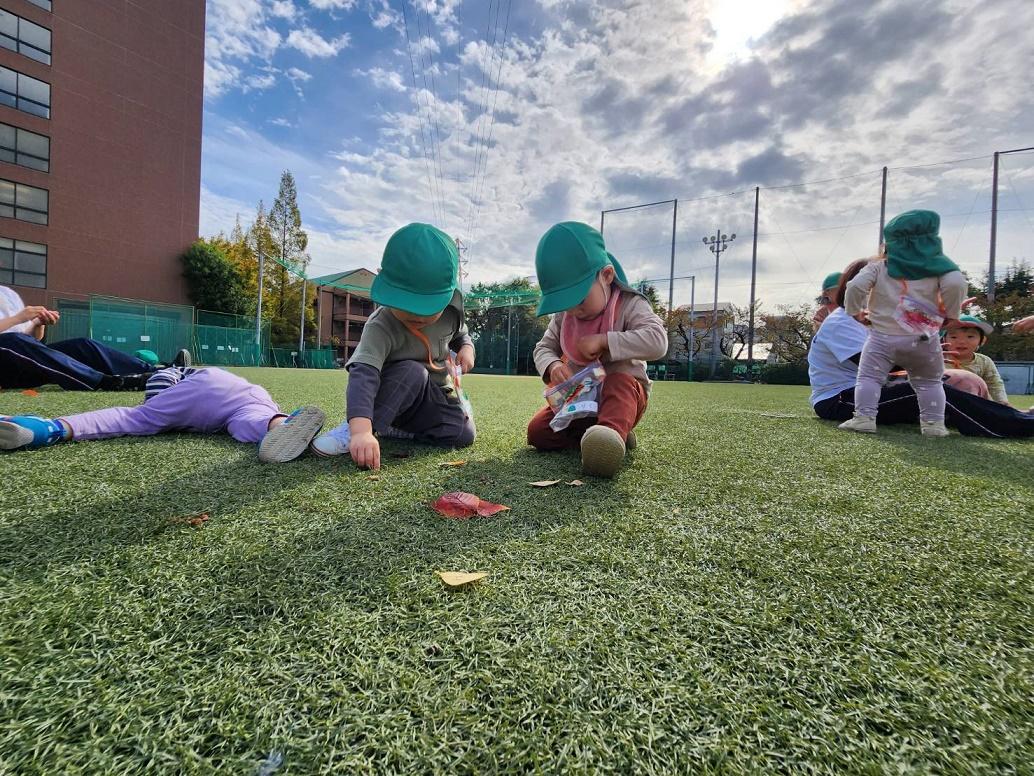 大学グラウンドへお散歩♪いろいろな色や形の葉っぱを嬉しそうにひろう子どもたちでした。"よいしょ よいしょ"と保育者と一緒に、散歩車を押してくれてありがとう♡