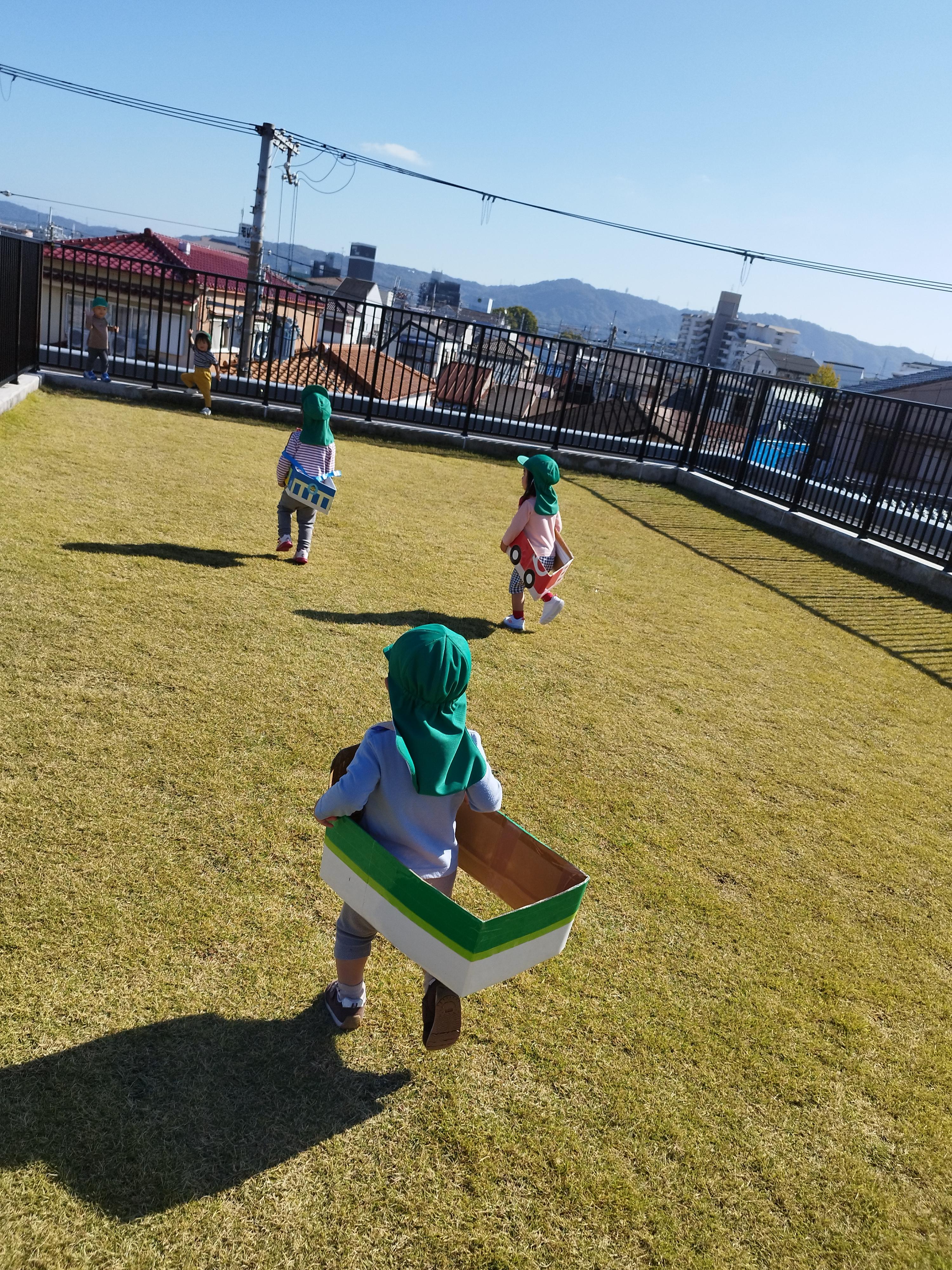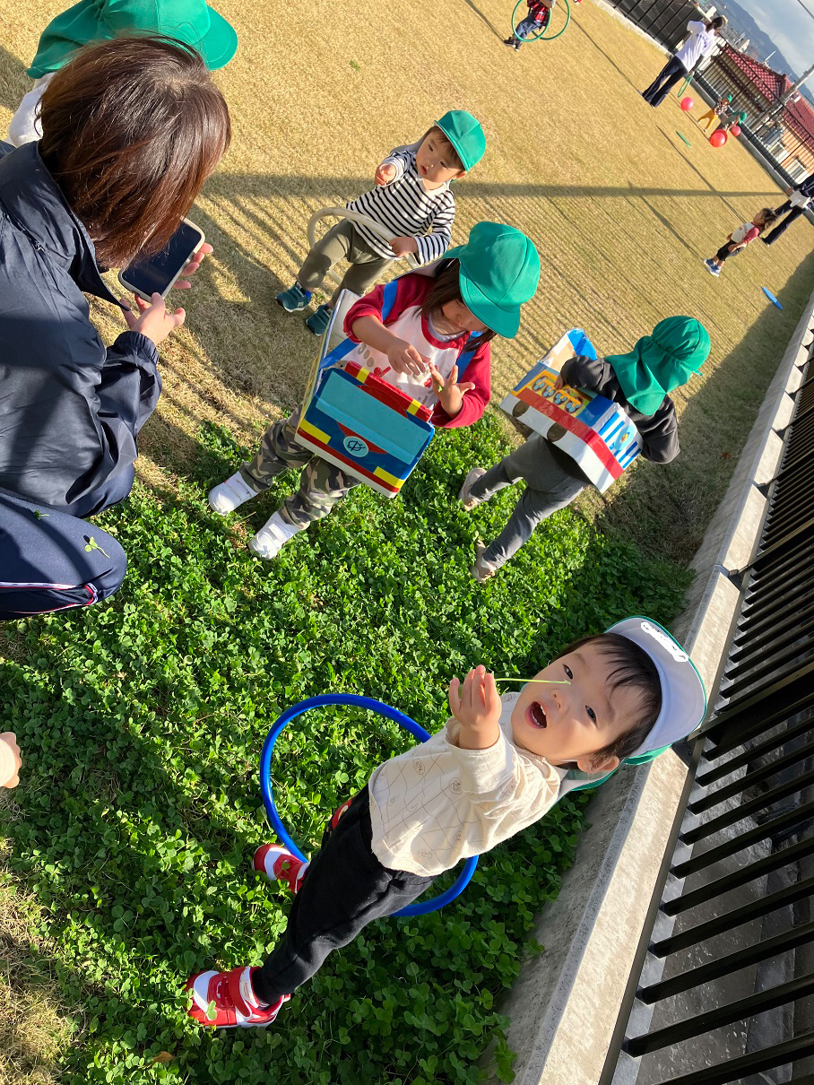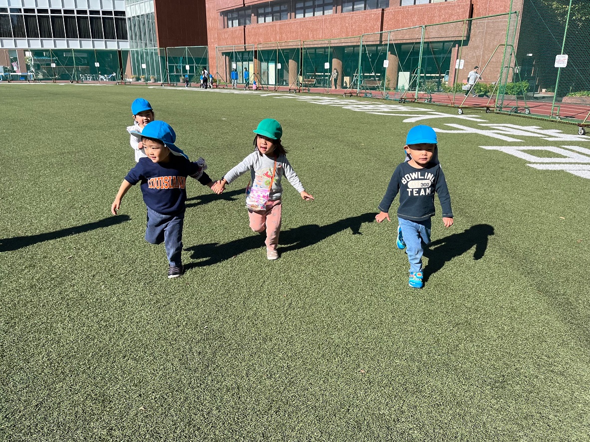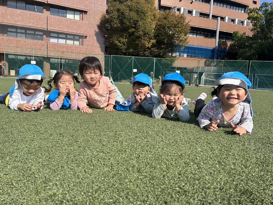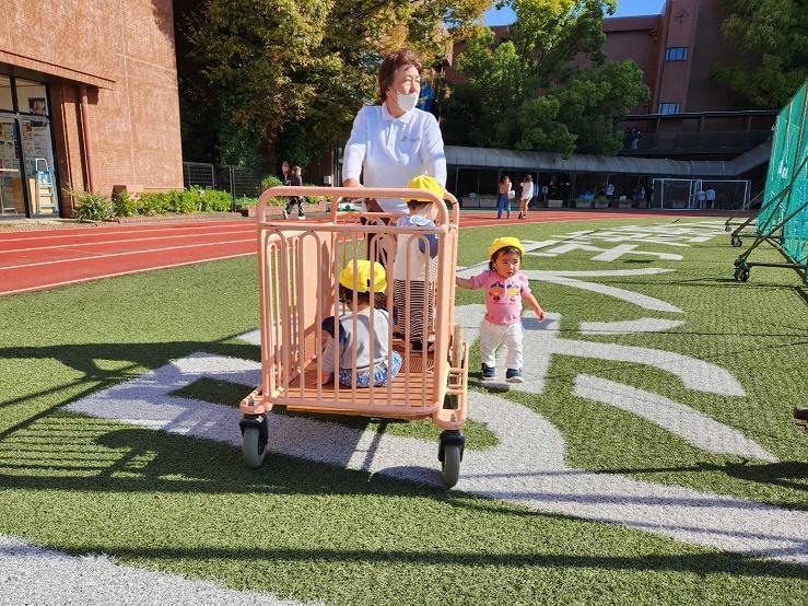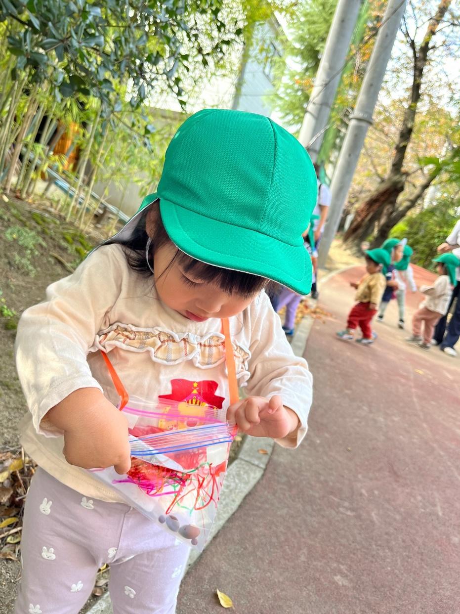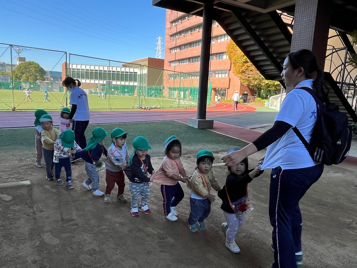 大学グラウンドへお散歩♪いろいろな色や形の葉っぱを嬉しそうにひろう子どもたちでした。"よいしょ よいしょ"と保育者と一緒に、散歩車を押してくれてありがとう♡