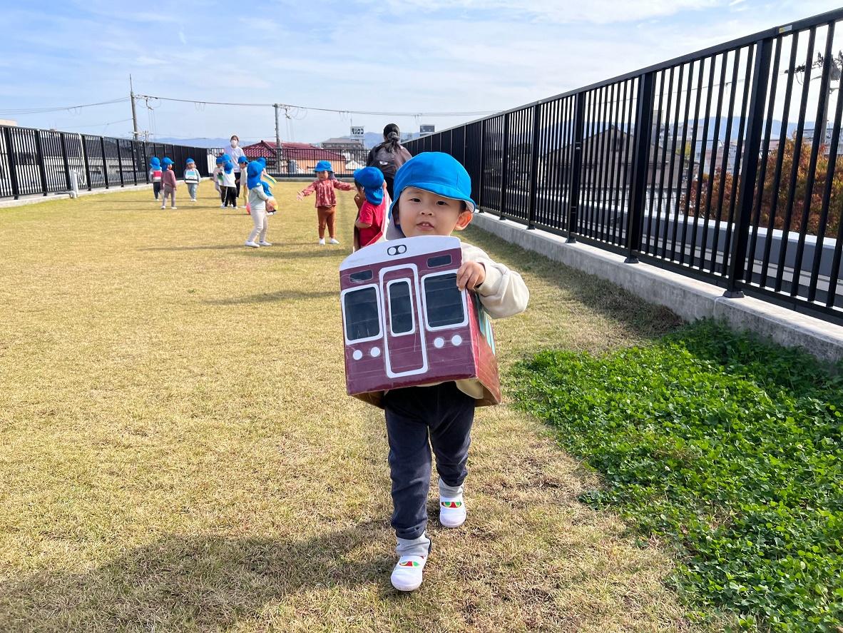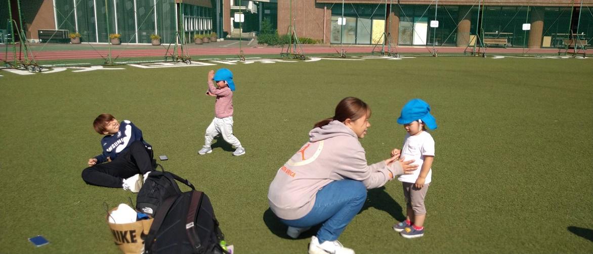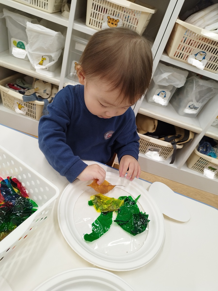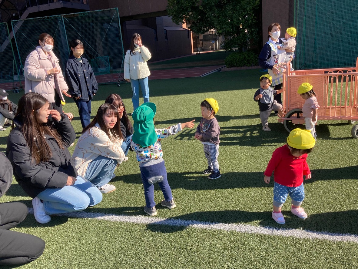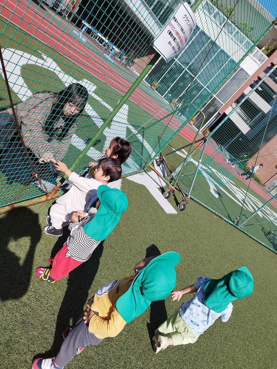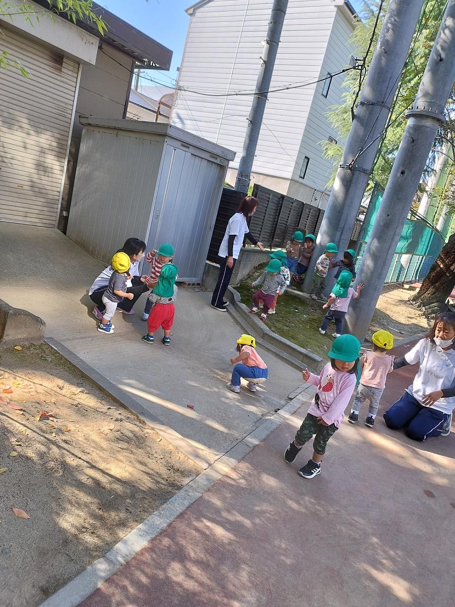 大学グラウンドへお散歩♪いろいろな色や形の葉っぱを嬉しそうにひろう子どもたちでした。"よいしょ よいしょ"と保育者と一緒に、散歩車を押してくれてありがとう♡