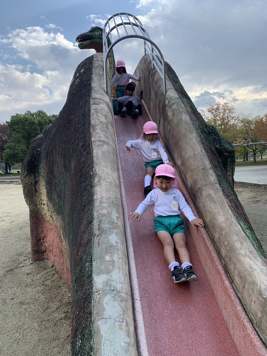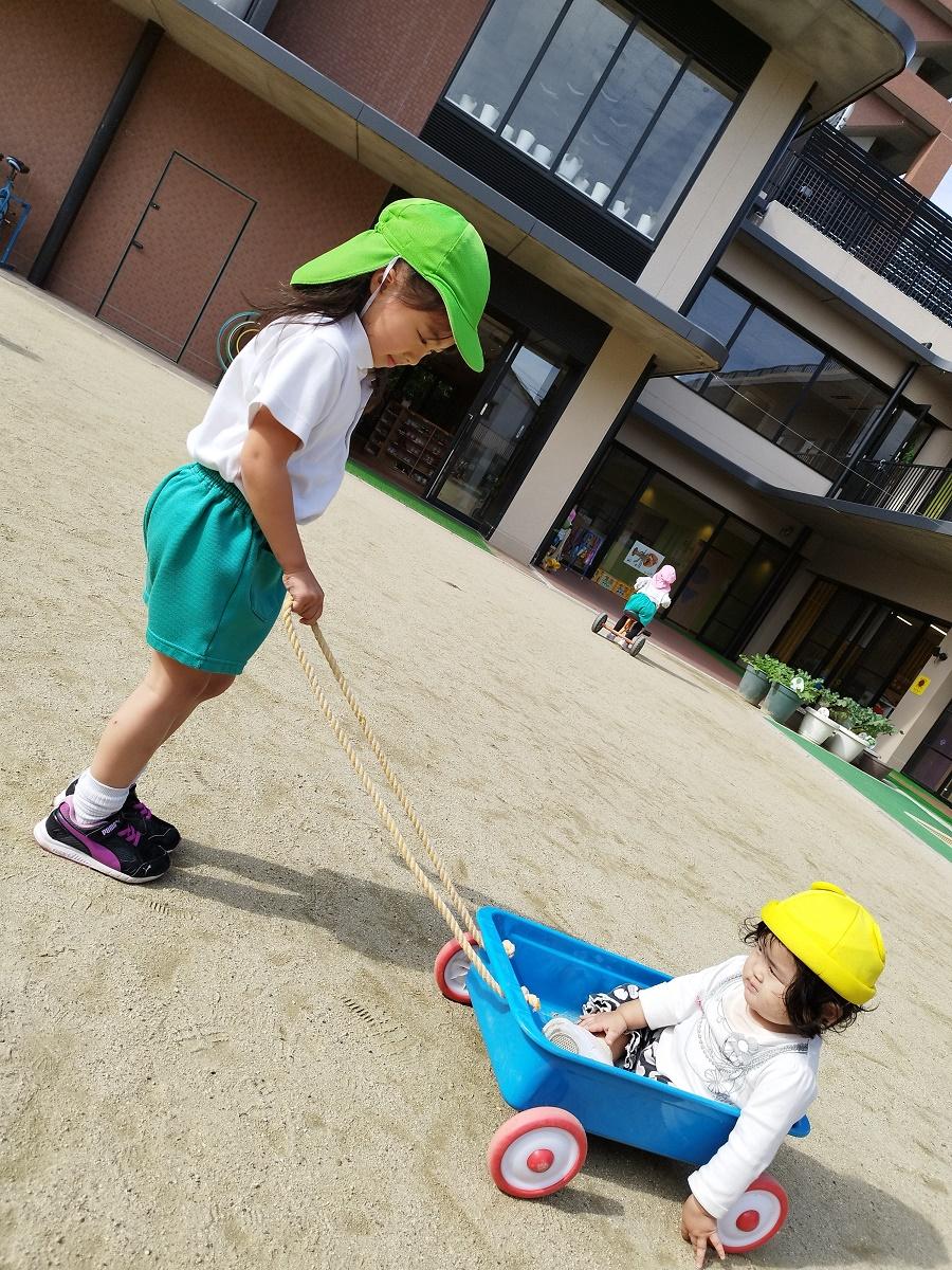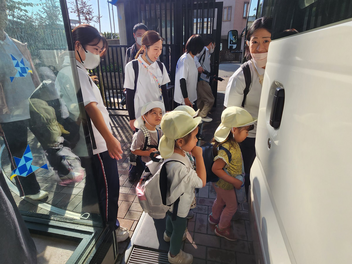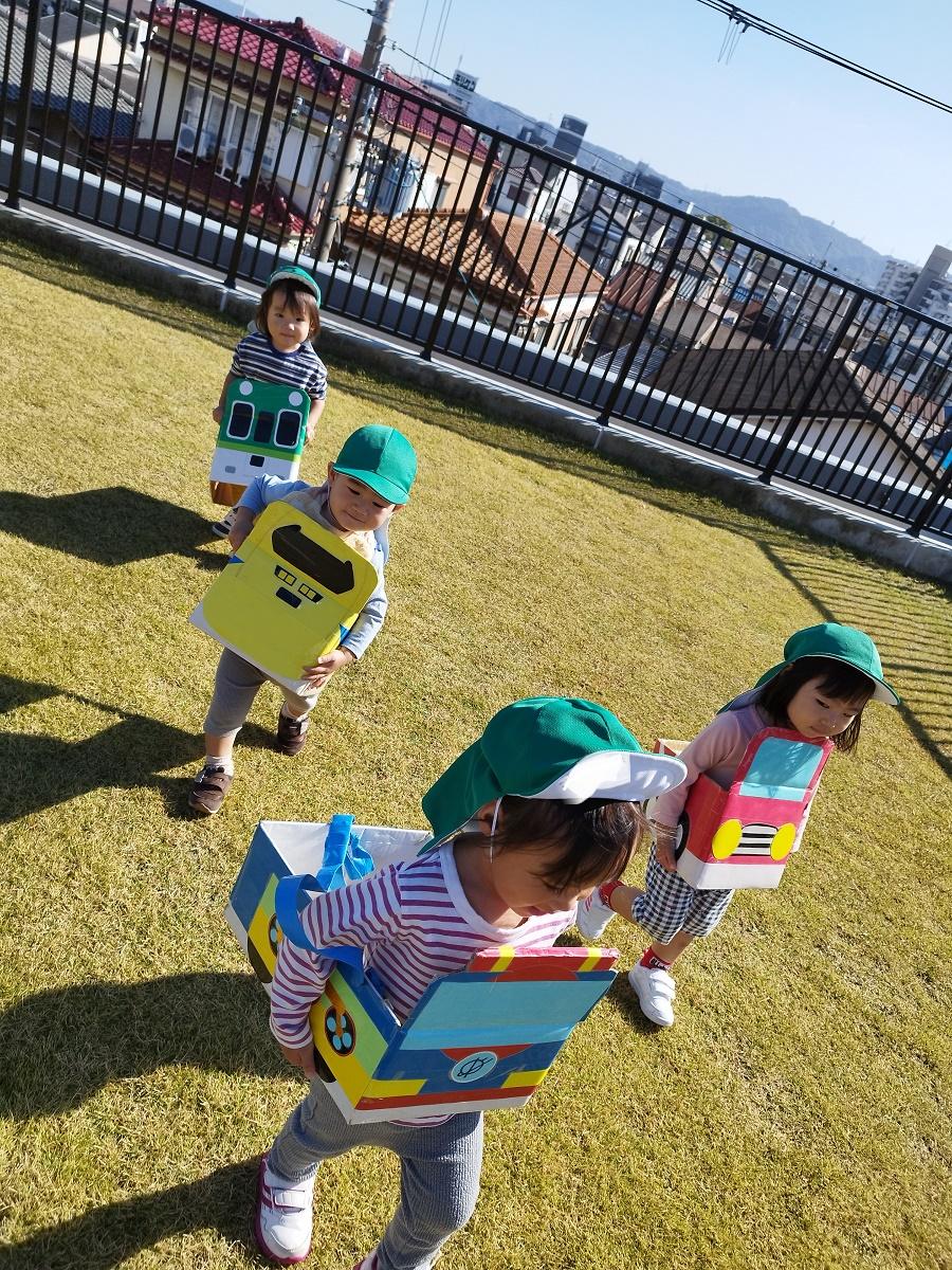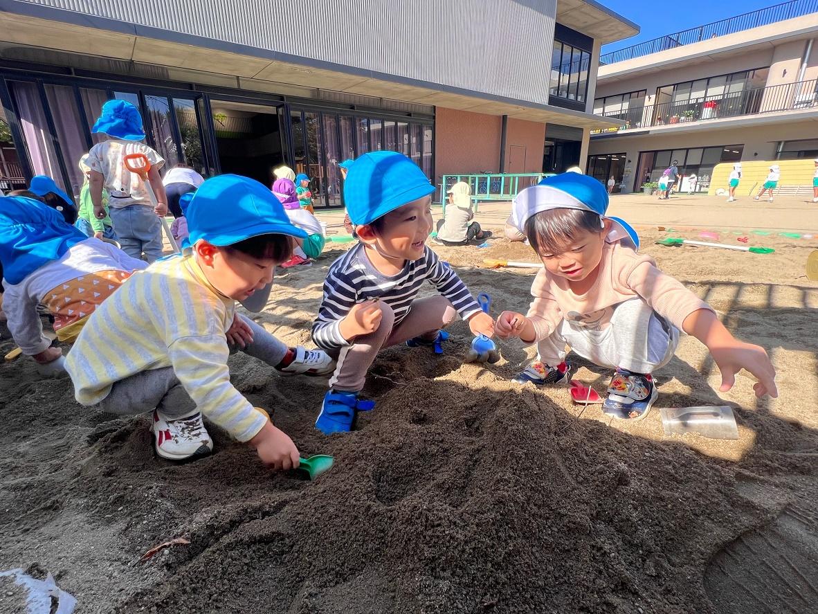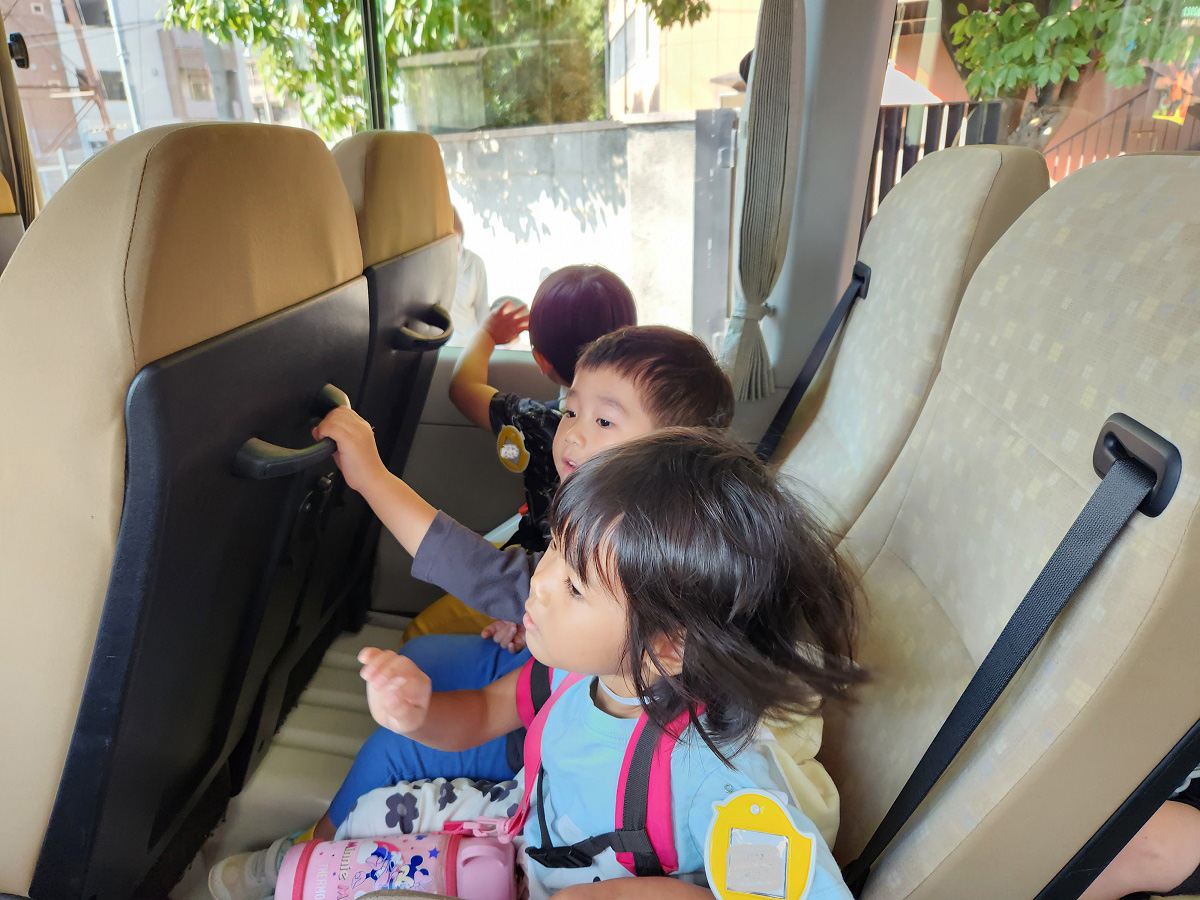大学グラウンドへお散歩♪いろいろな色や形の葉っぱを嬉しそうにひろう子どもたちでした。"よいしょ よいしょ"と保育者と一緒に、散歩車を押してくれてありがとう♡