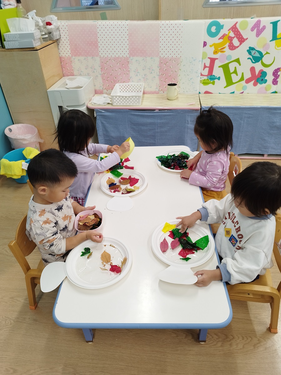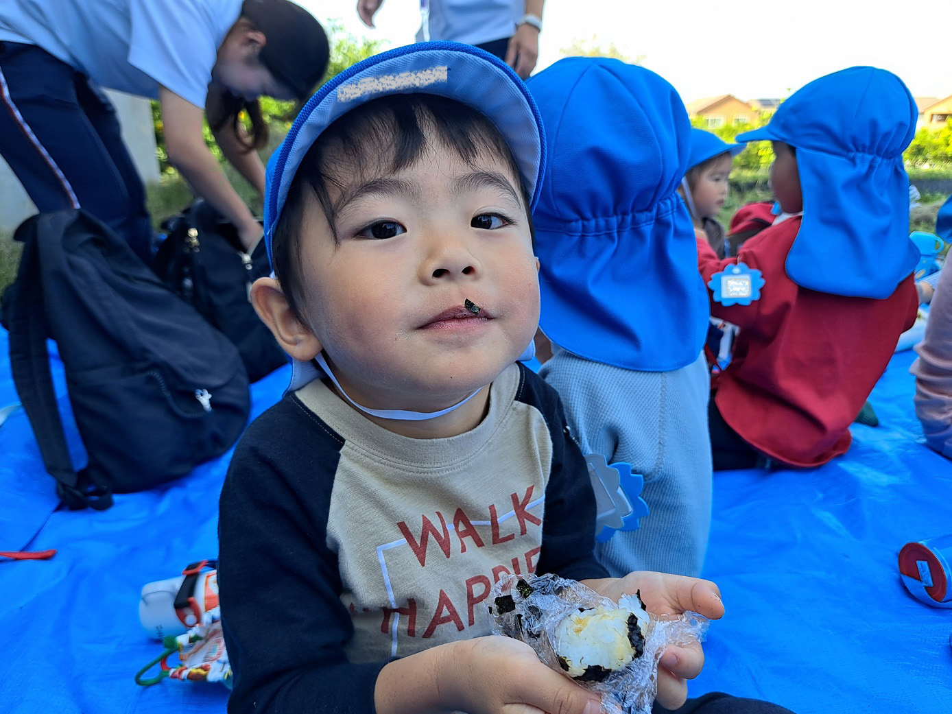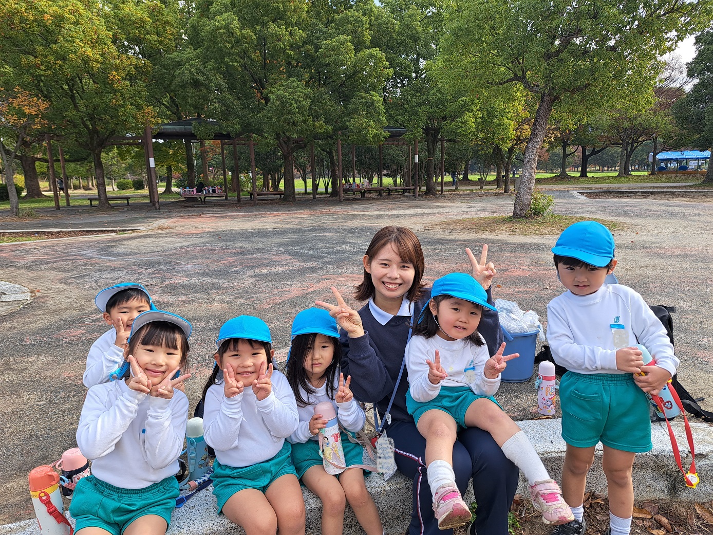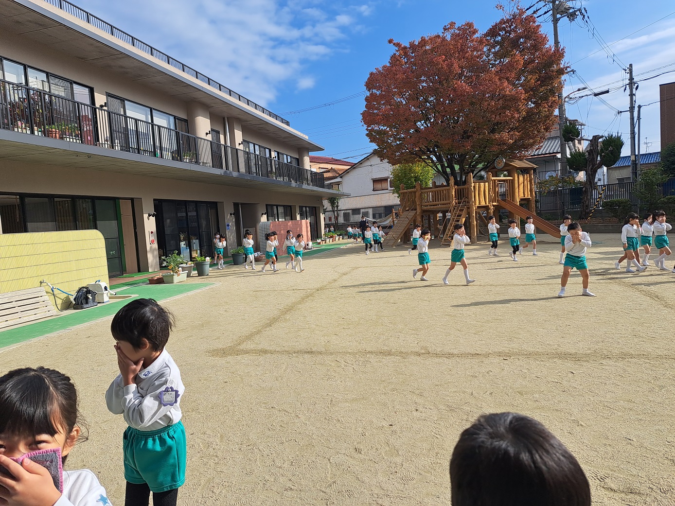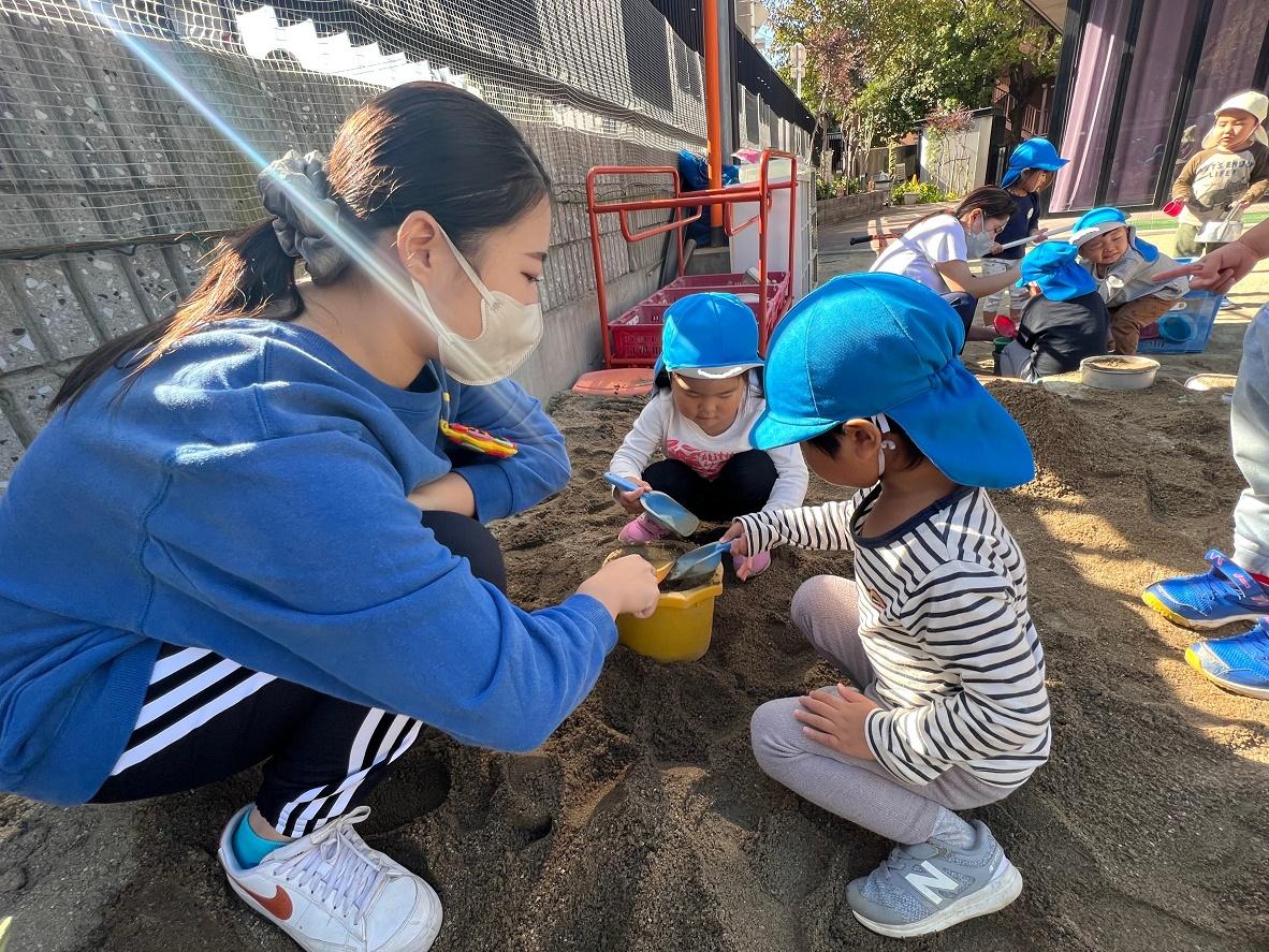 大学グラウンドへお散歩♪いろいろな色や形の葉っぱを嬉しそうにひろう子どもたちでした。"よいしょ よいしょ"と保育者と一緒に、散歩車を押してくれてありがとう♡