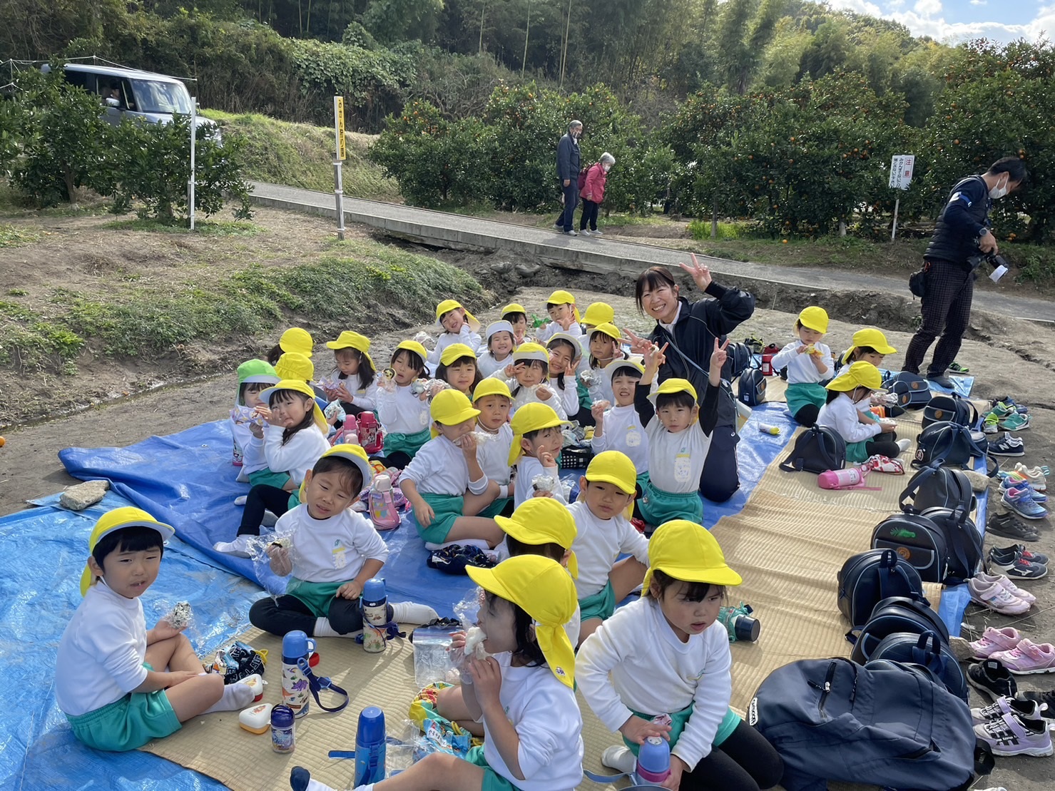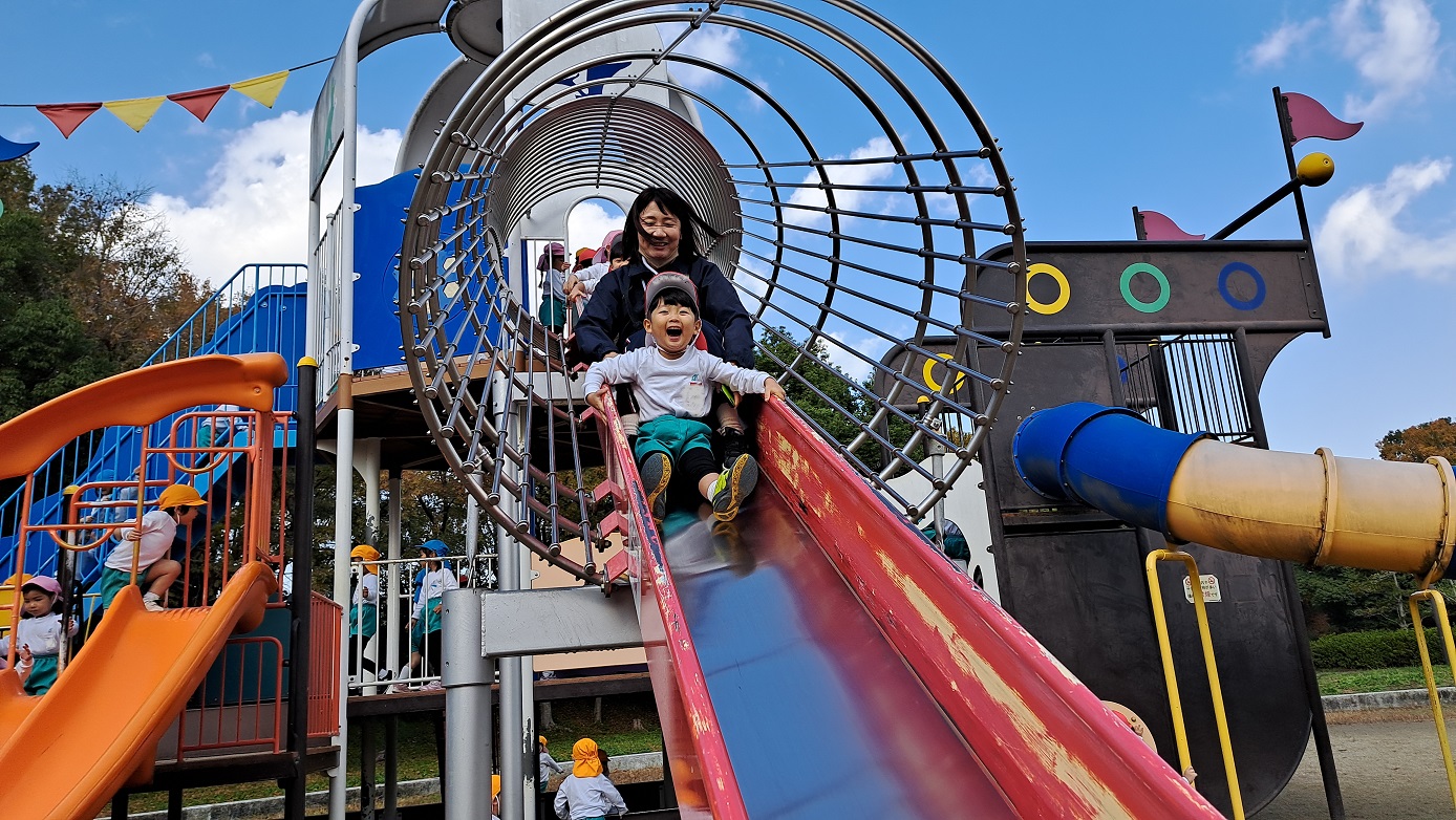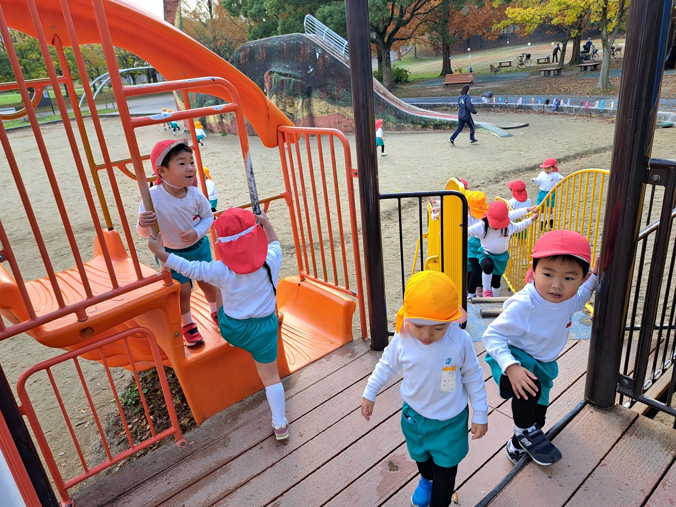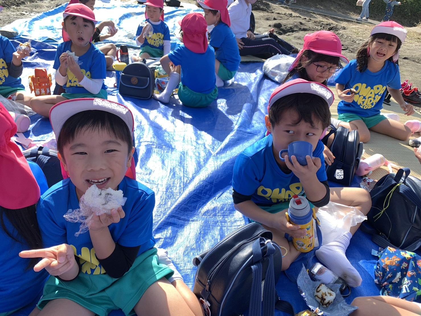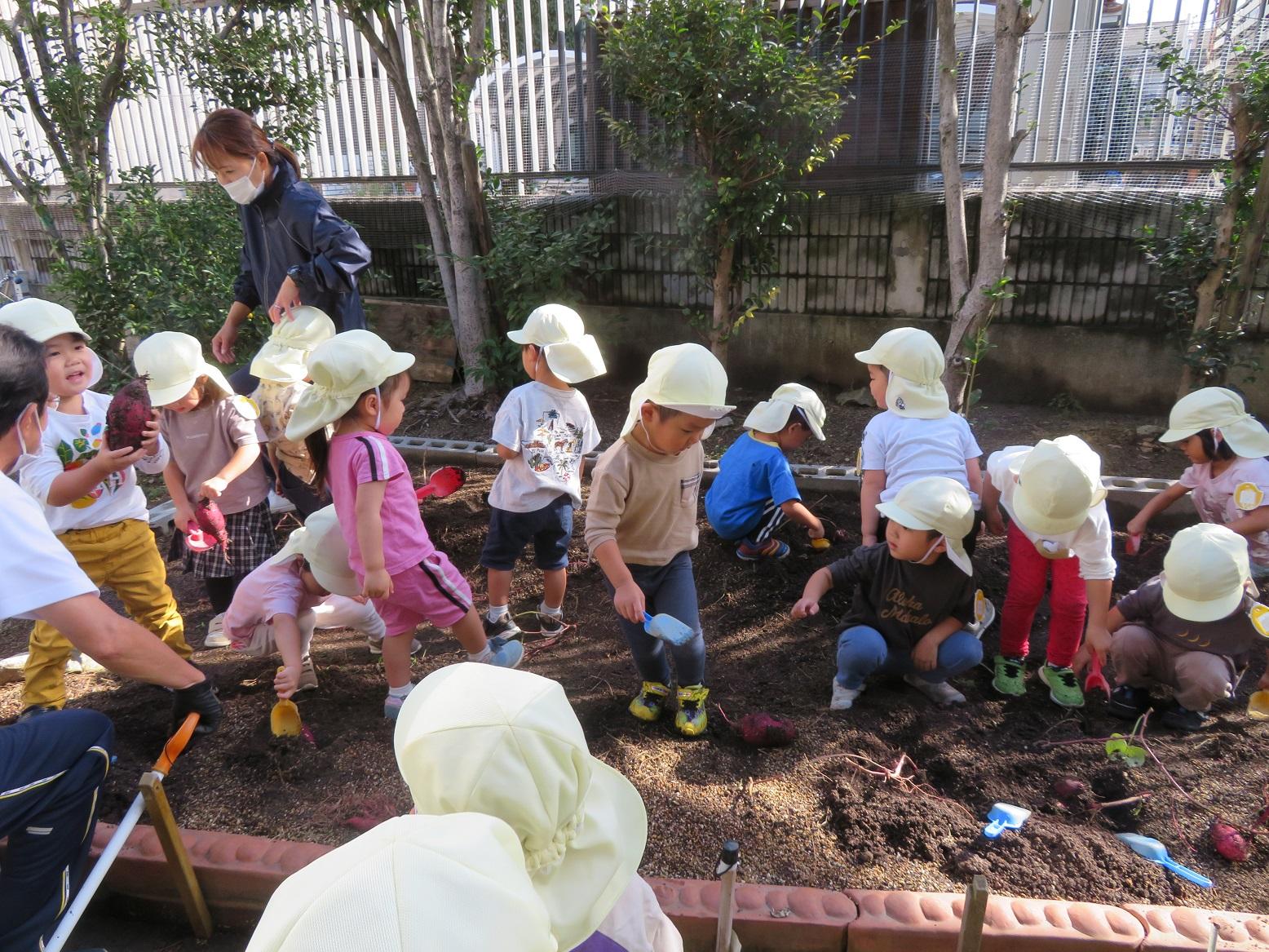 大学グラウンドへお散歩♪いろいろな色や形の葉っぱを嬉しそうにひろう子どもたちでした。"よいしょ よいしょ"と保育者と一緒に、散歩車を押してくれてありがとう♡