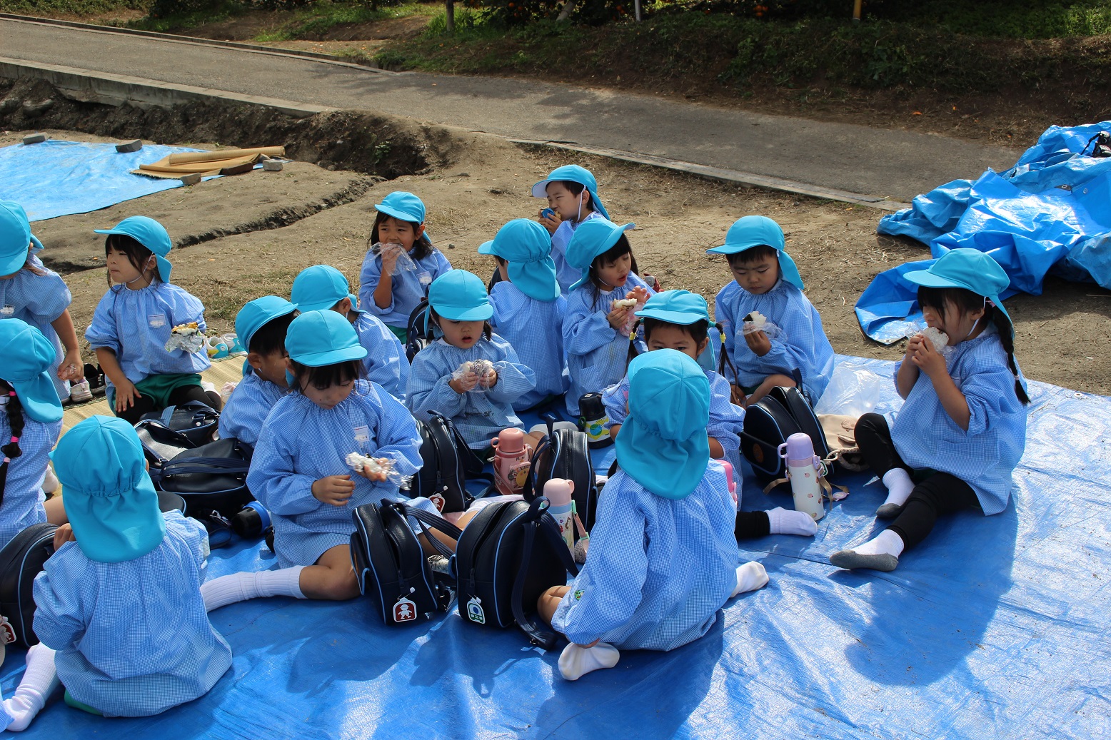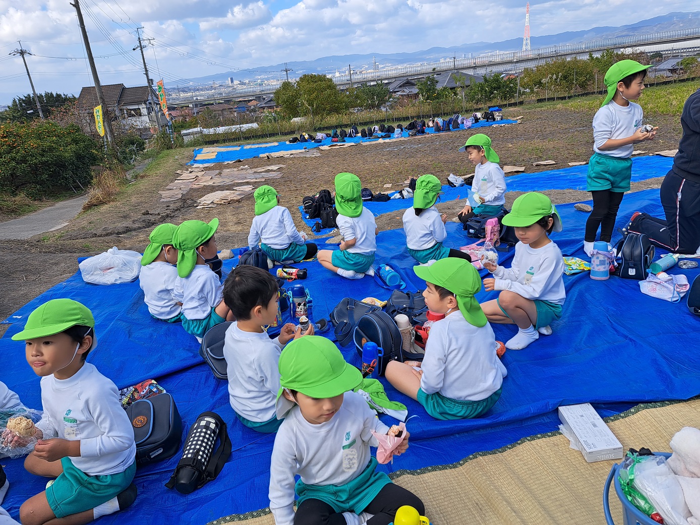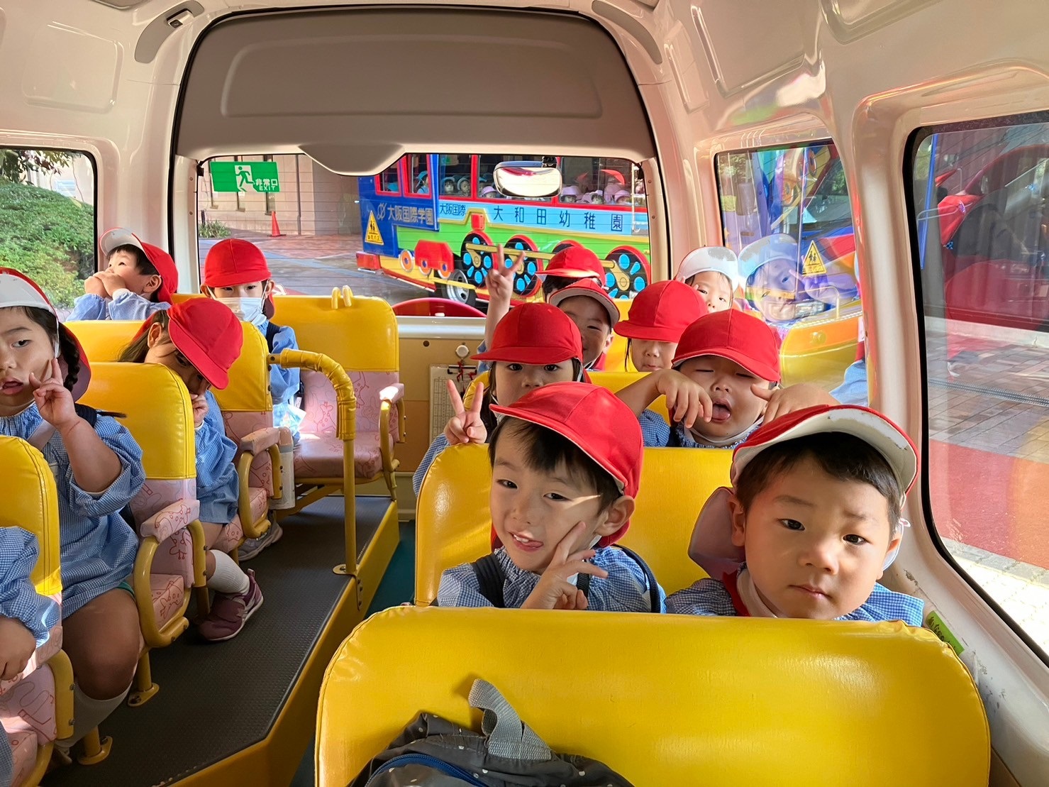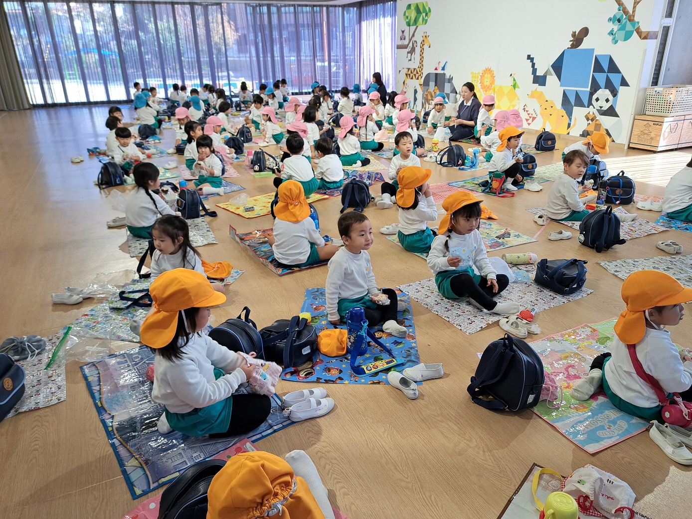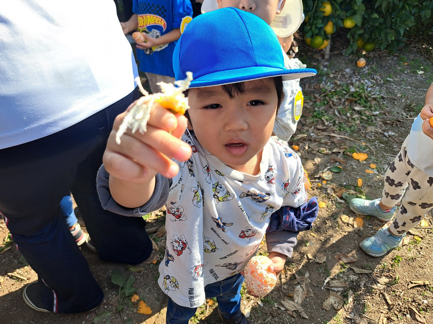 大学グラウンドへお散歩♪いろいろな色や形の葉っぱを嬉しそうにひろう子どもたちでした。"よいしょ よいしょ"と保育者と一緒に、散歩車を押してくれてありがとう♡