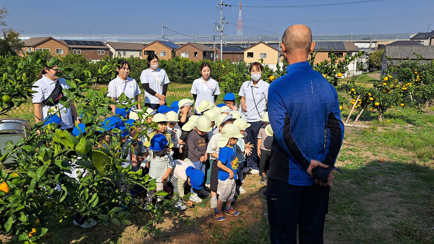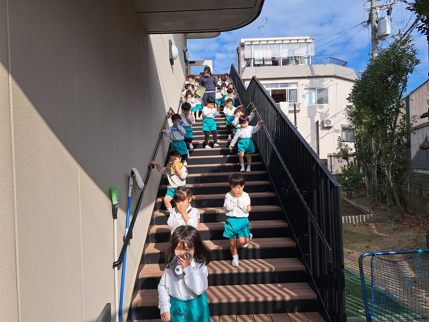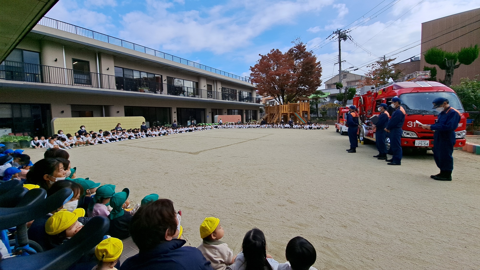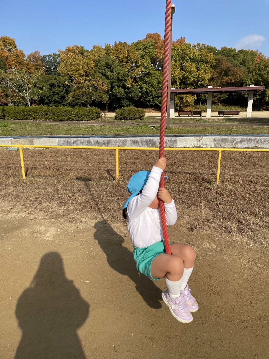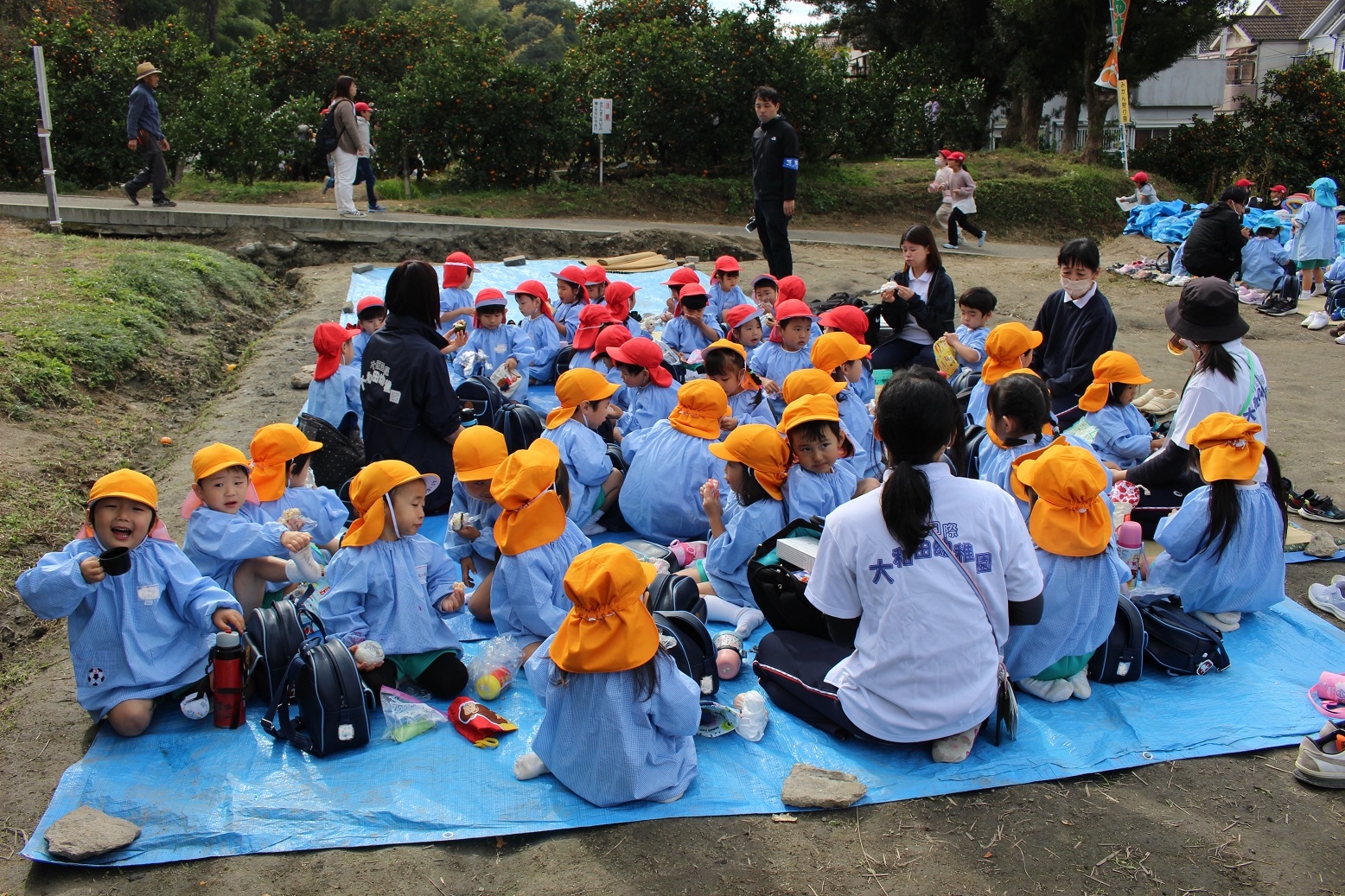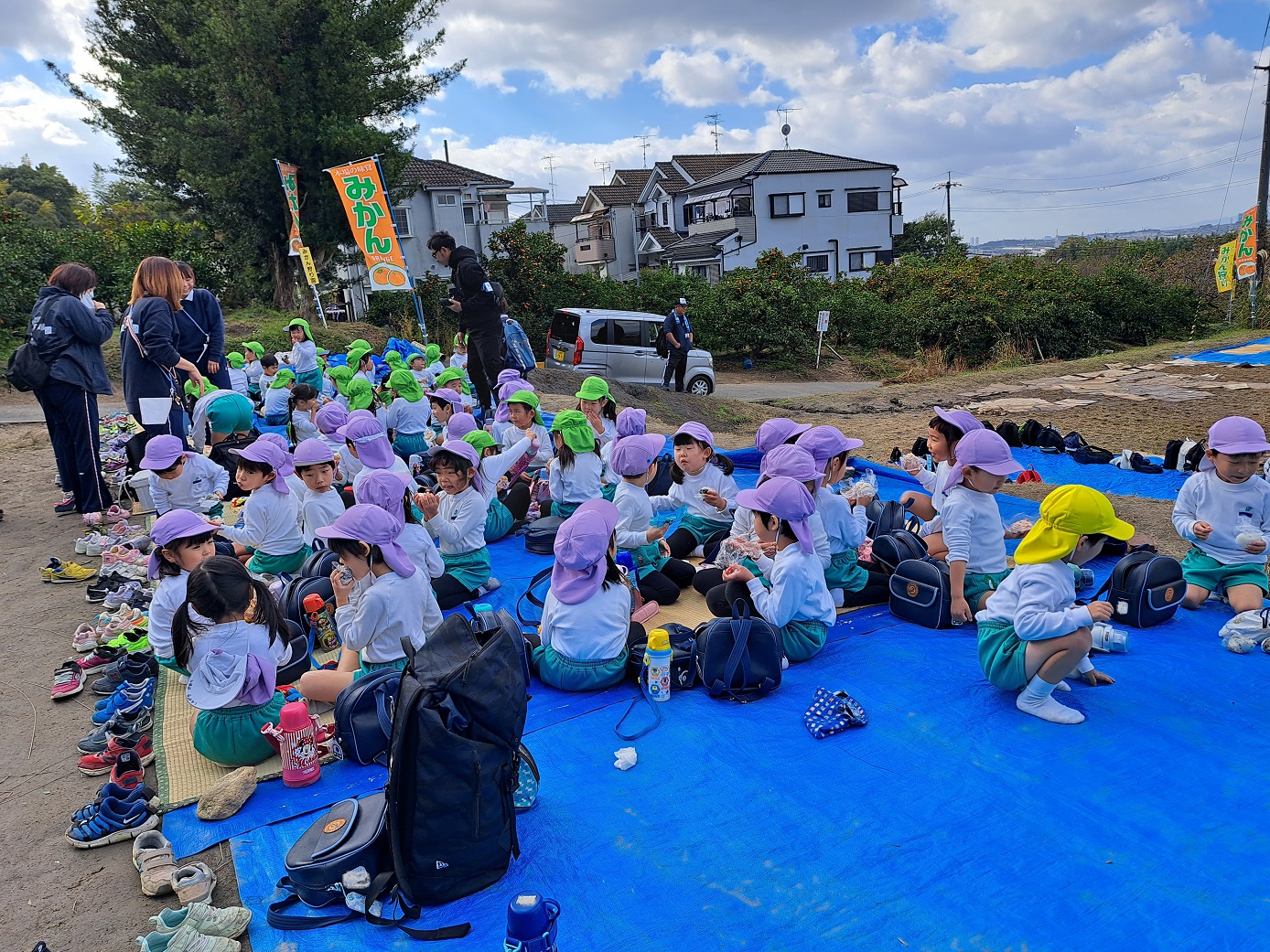 大学グラウンドへお散歩♪いろいろな色や形の葉っぱを嬉しそうにひろう子どもたちでした。"よいしょ よいしょ"と保育者と一緒に、散歩車を押してくれてありがとう♡